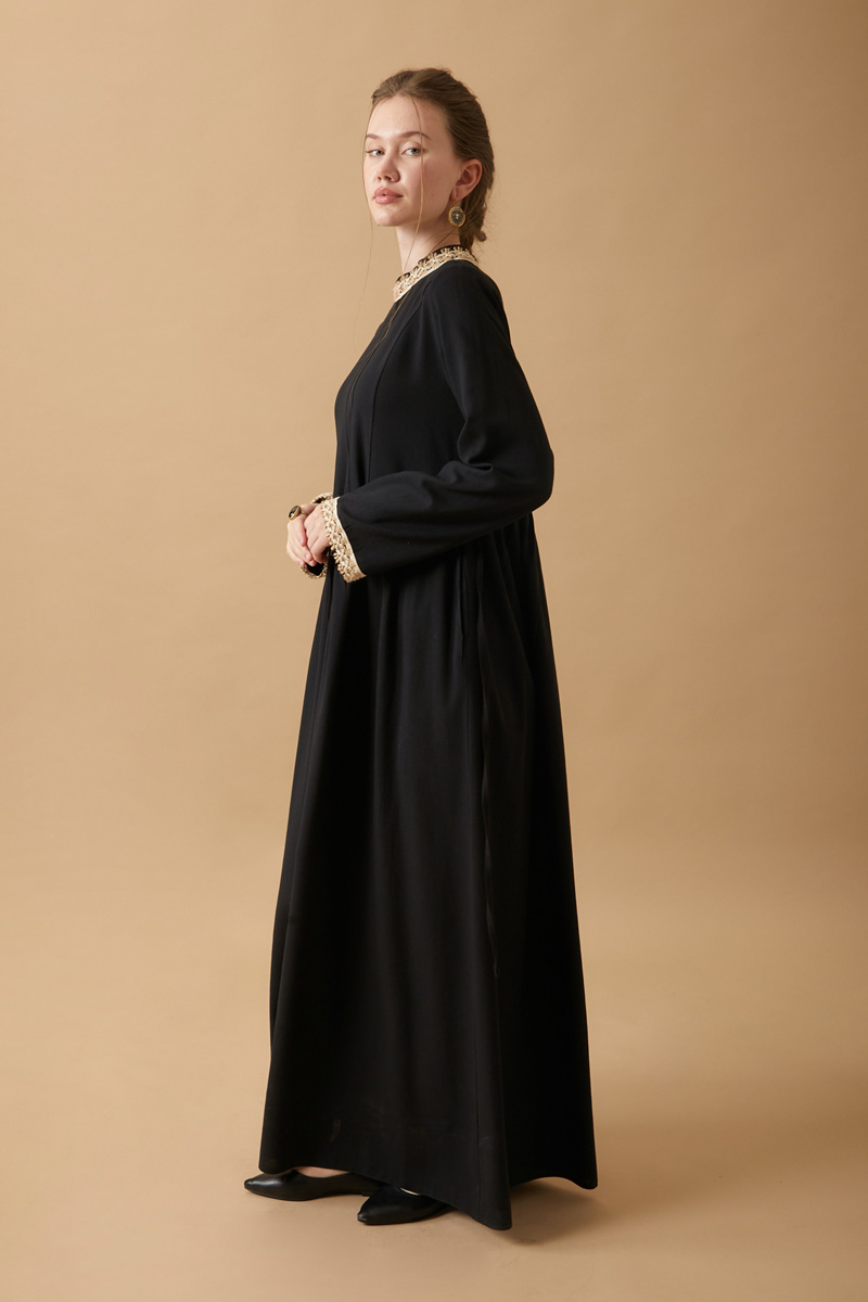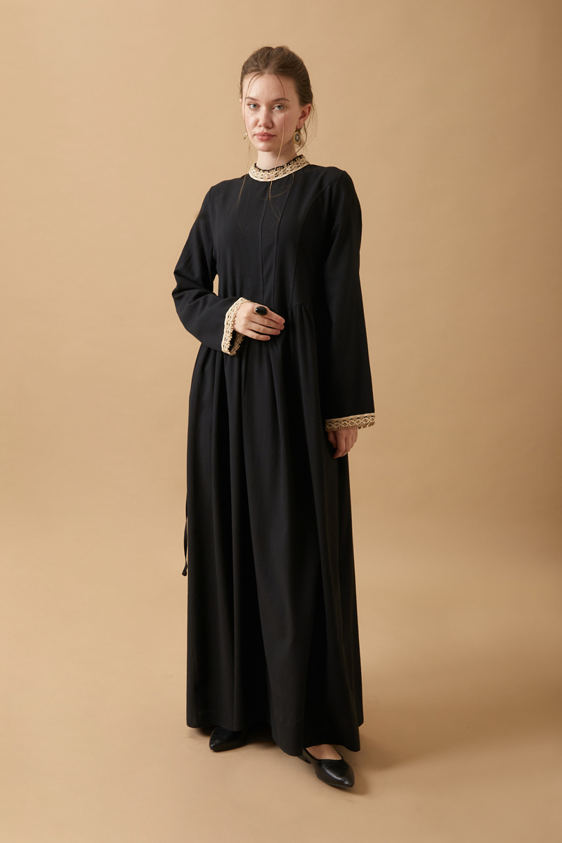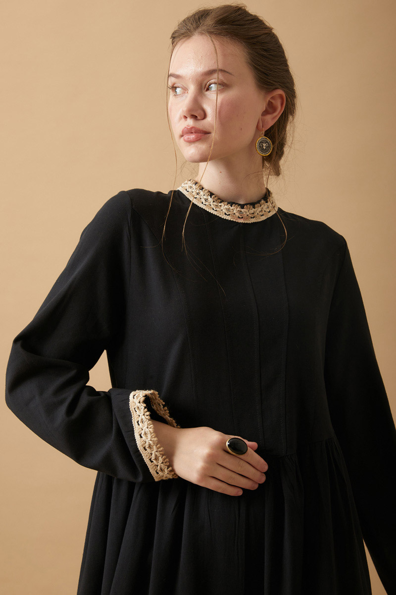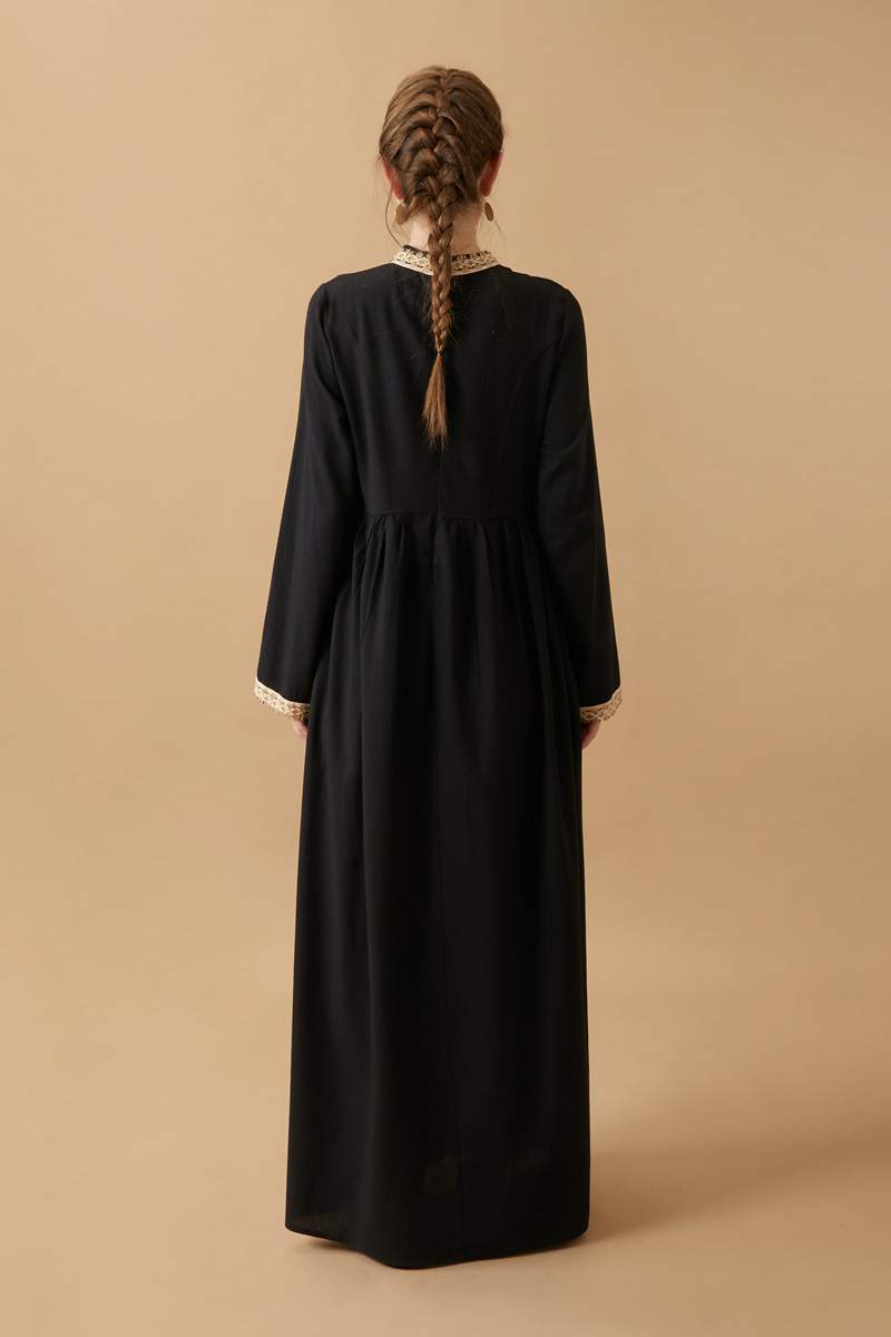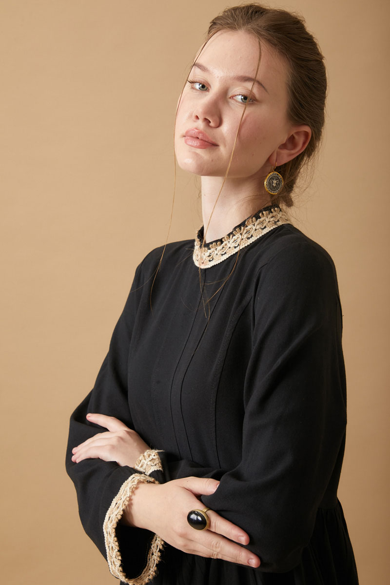 Perfect for vintage lovers, this long dress made from natural linen combines simplicity with elegance. The delicate lace details on the collar and cuffs lend a romantic, nostalgic feel, while the flowy silhouette ensures all-day comfort.