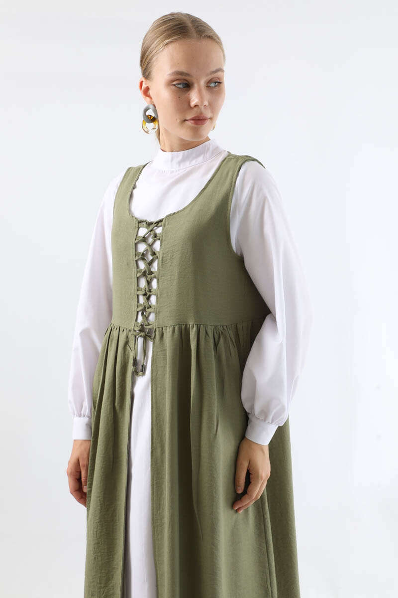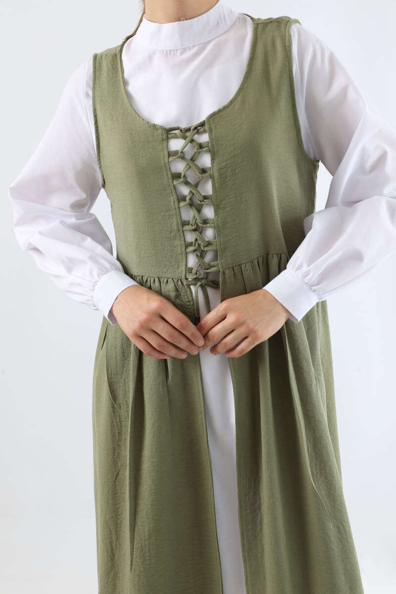 Lace-up Gilet Set Khaki. Gilet lace detail. The waist is shirred. The dress has a judge collar. It has a back zipper. the cuff is buttoned. You can choose it for your daily use and special occasions.