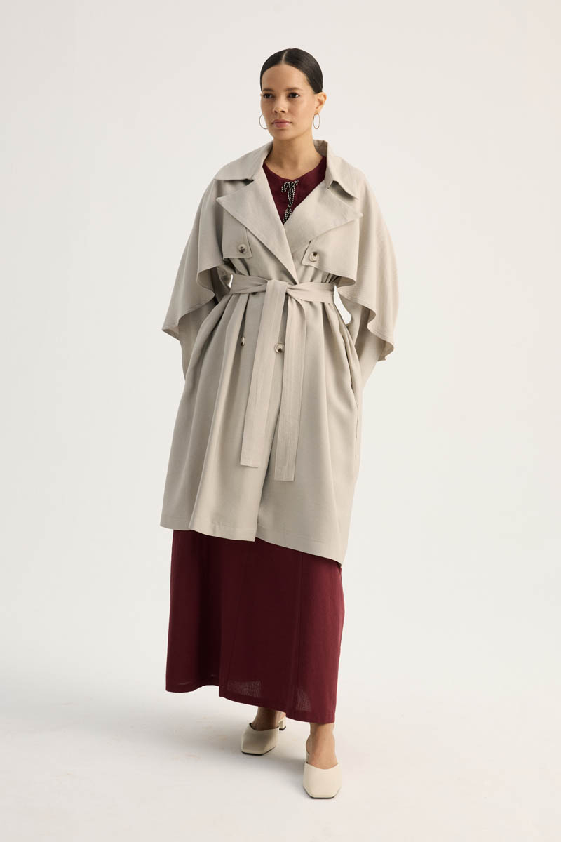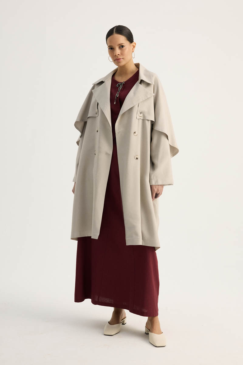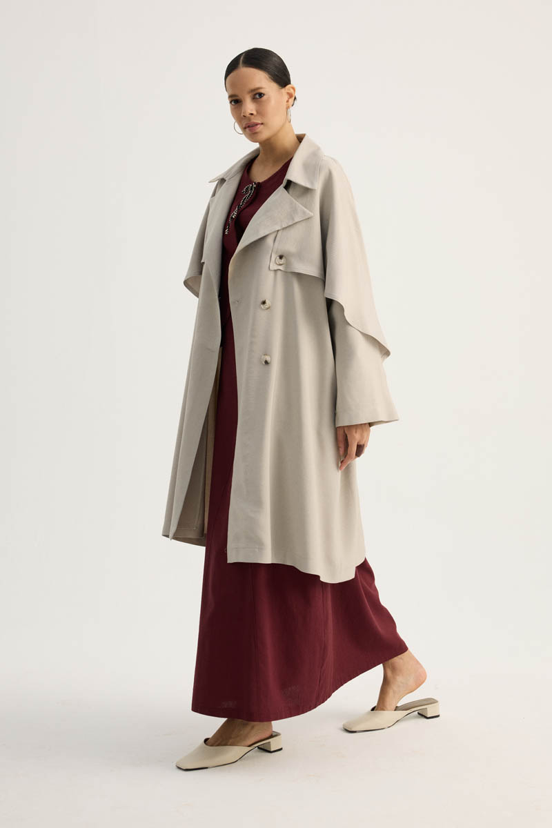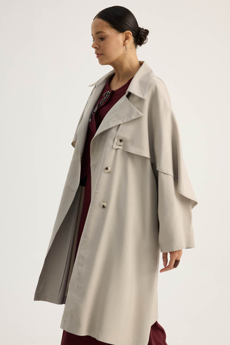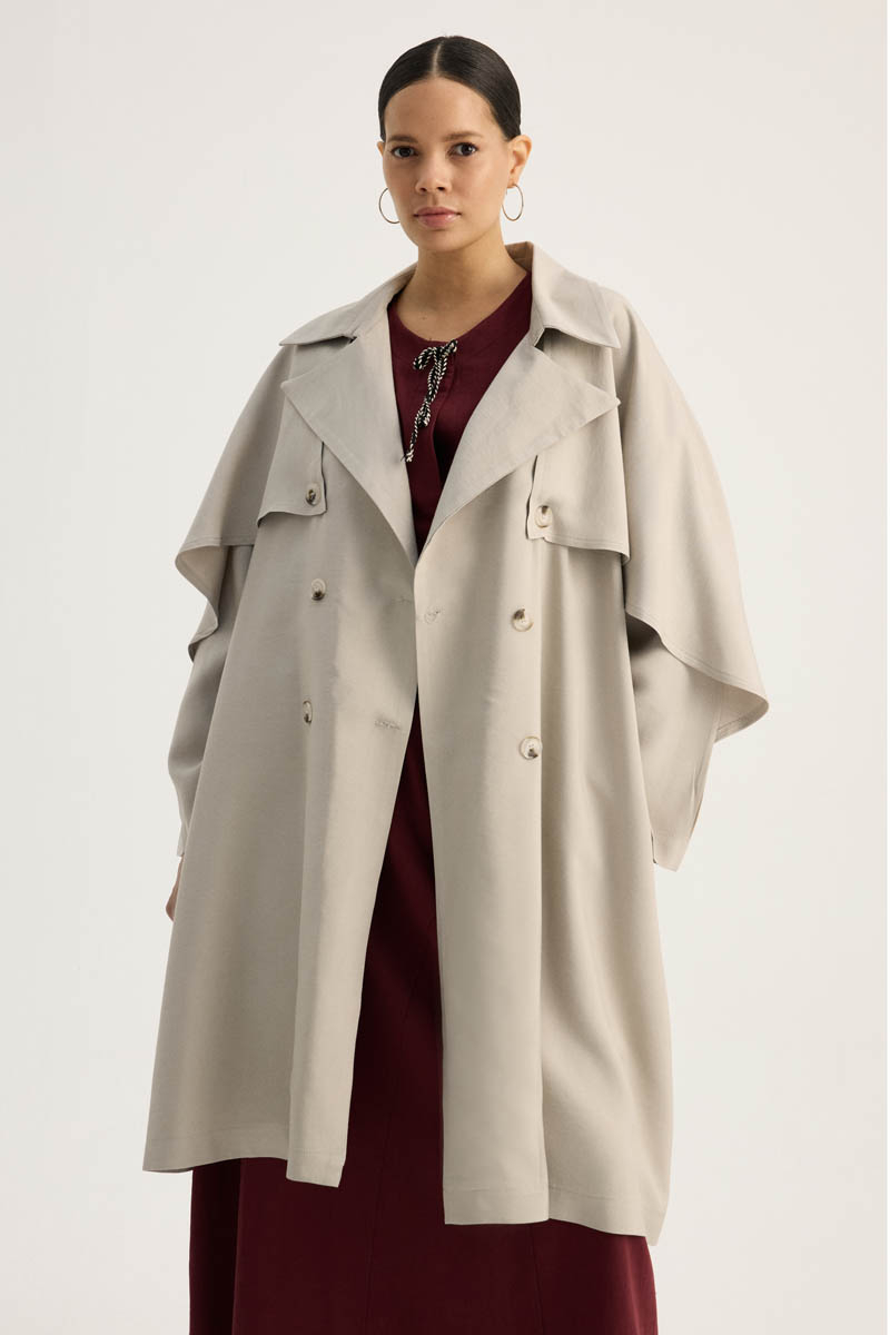 Laçin Trençkot Taş. Kruvaze kapamadır, düşük kolludur, önden düğmelidir, omuzdan kola doğru inen aller detaylı ve düğmelidir, düşük kolludur, yandan ceplidir, astarsızdır, bahar ve kış aylarında tercih edebilirsiniz.