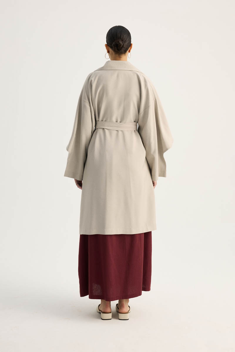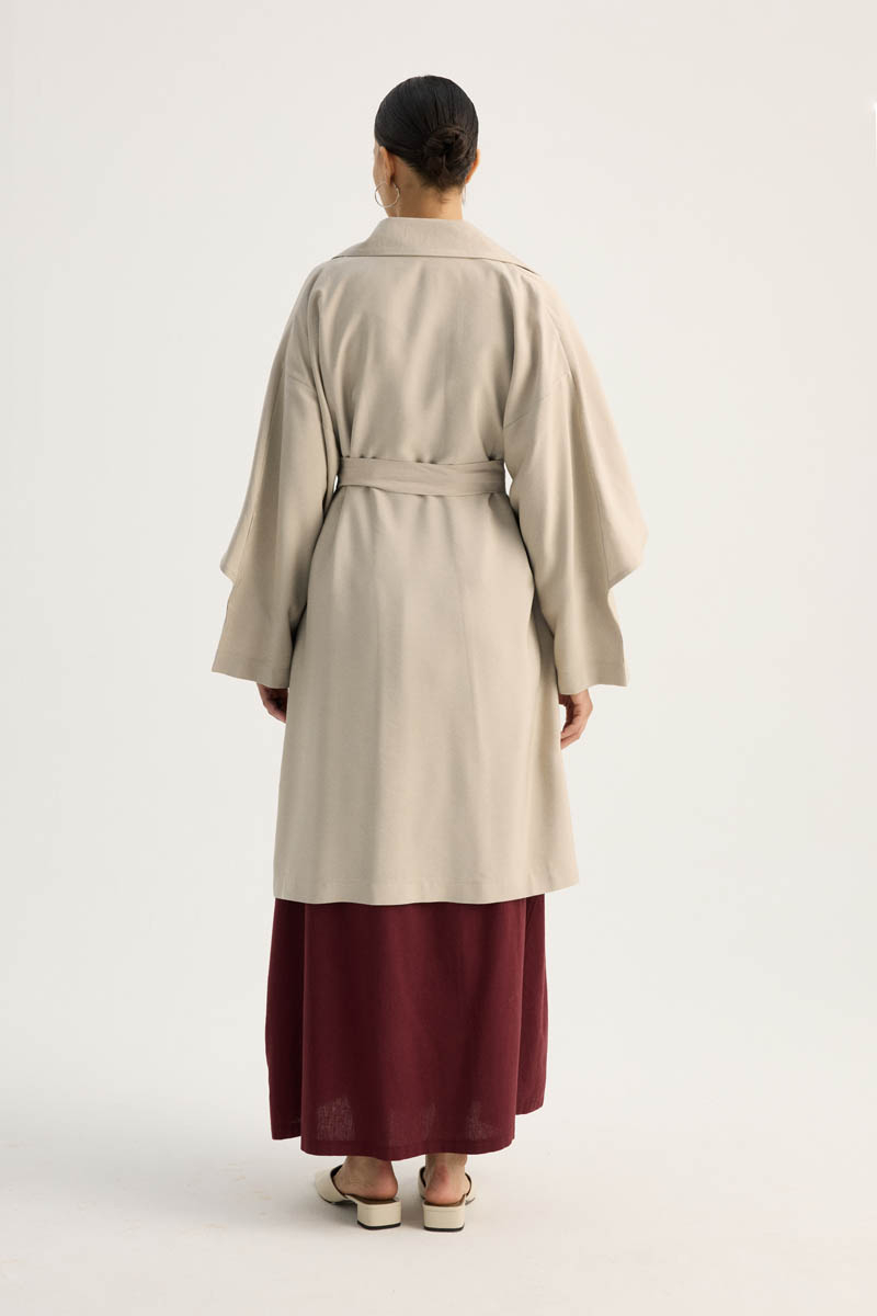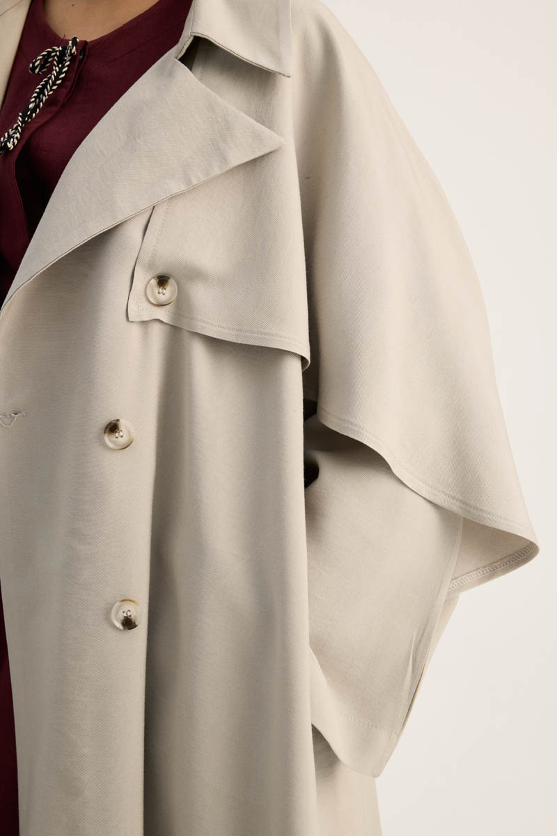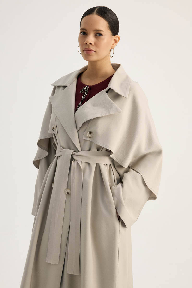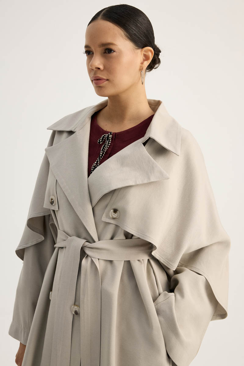 Laçin Trençkot Taş. Kruvaze kapamadır, düşük kolludur, önden düğmelidir, omuzdan kola doğru inen aller detaylı ve düğmelidir, düşük kolludur, yandan ceplidir, astarsızdır, bahar ve kış aylarında tercih edebilirsiniz.