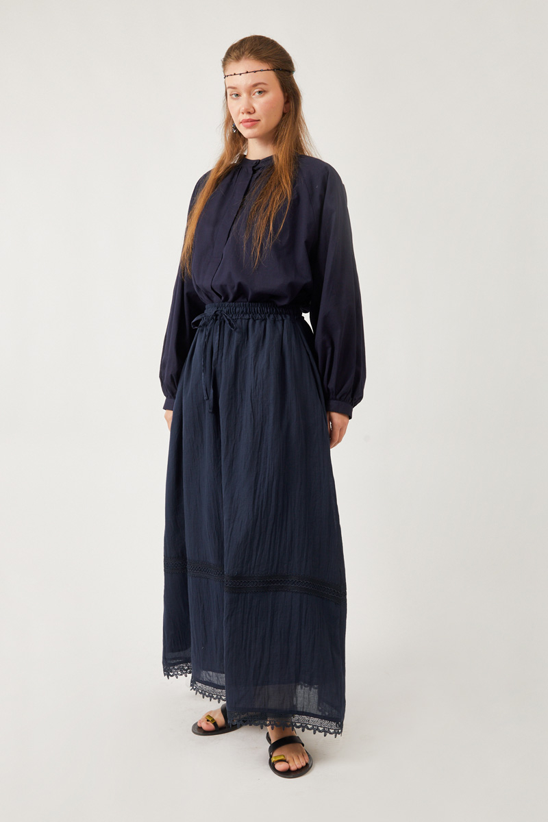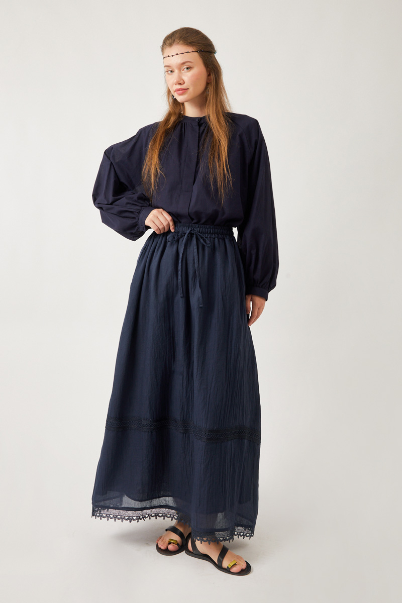 Lara Dantelli Etek Lacivert. Büzgülü ve lastikli beli sayesinde rahat bir kullanım sunar. Bol A kesimi hareket özgürlüğü sağlarken, etek ucundaki dantel ve işleme detayları şıklık katar. Yanlarda gizli cepleri bulunur. Hem günlük hem de özel anlar için ideal, kullanışlı ve zarif bir parçadır.