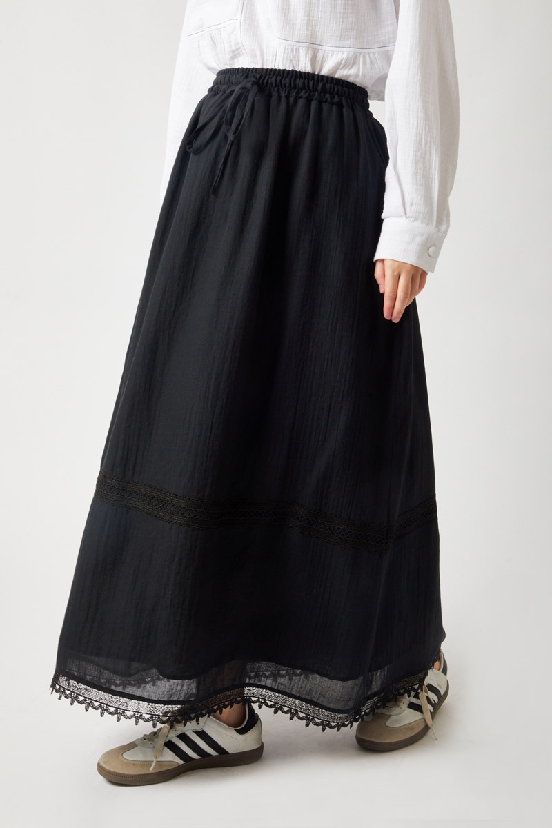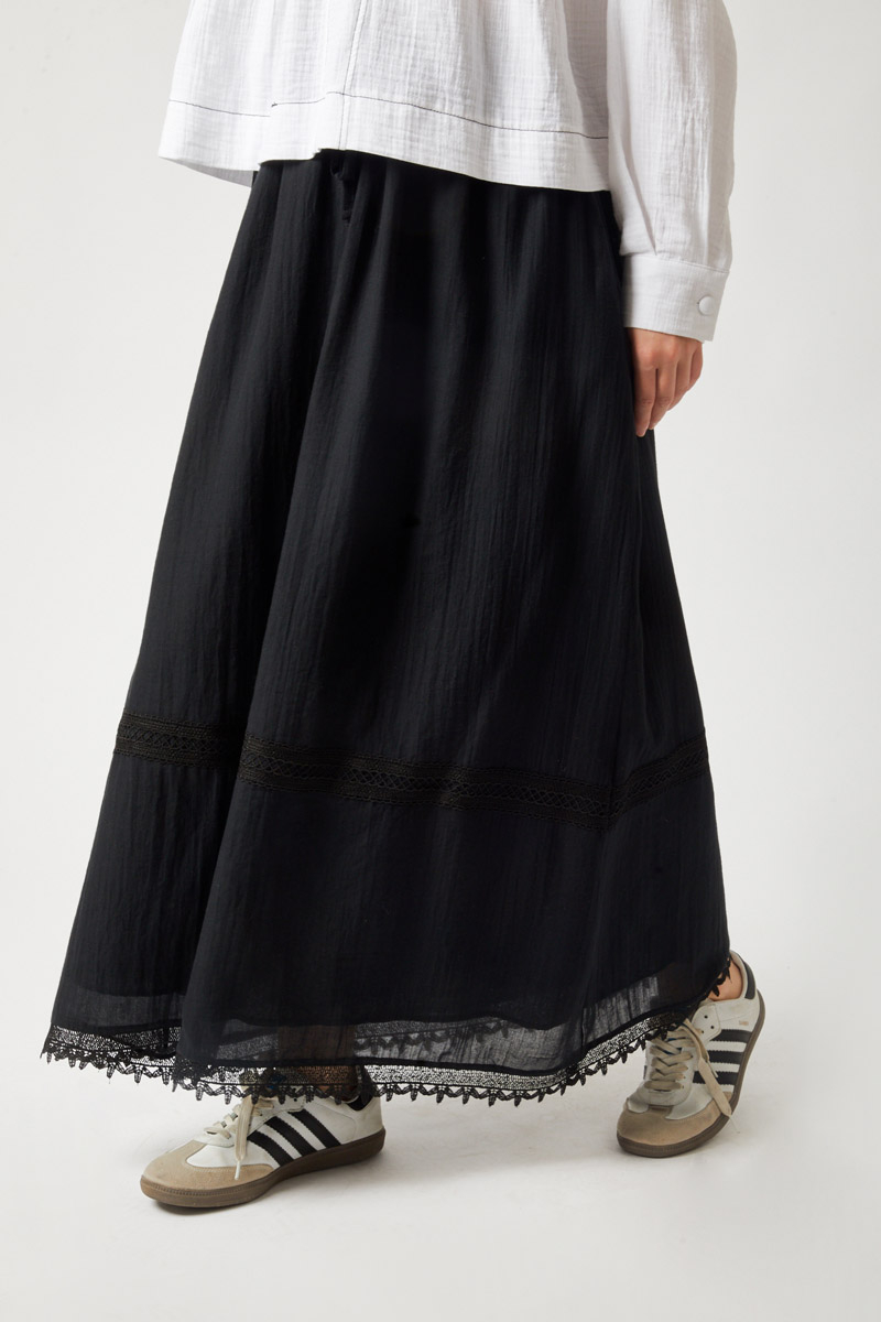 Lara Dantelli Etek Siyah. Büzgülü ve lastikli beli sayesinde rahat bir kullanım sunar. Bol A kesimi hareket özgürlüğü sağlarken, etek ucundaki dantel ve işleme detayları şıklık katar. Yanlarda gizli cepleri bulunur. Hem günlük hem de özel anlar için ideal, kullanışlı ve zarif bir parçadır.
