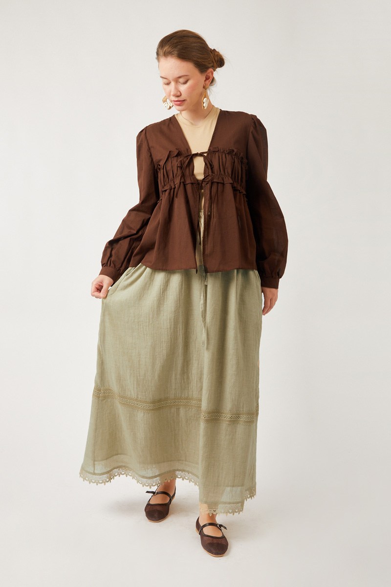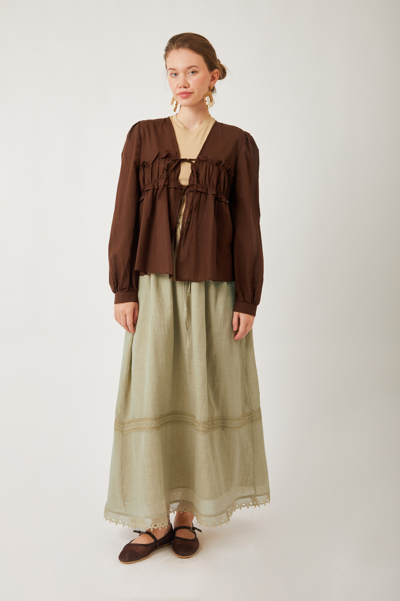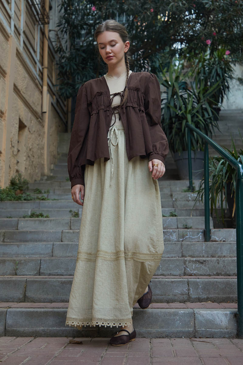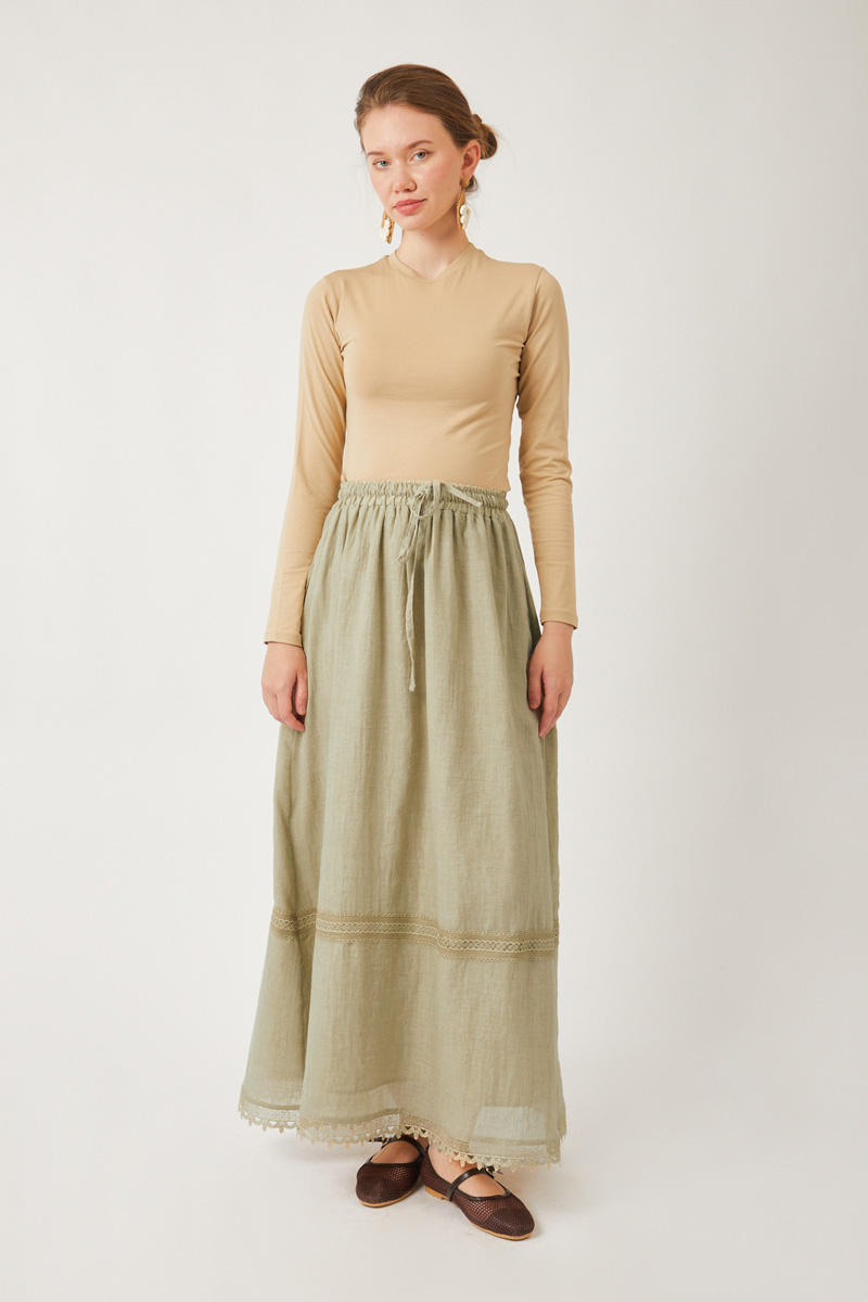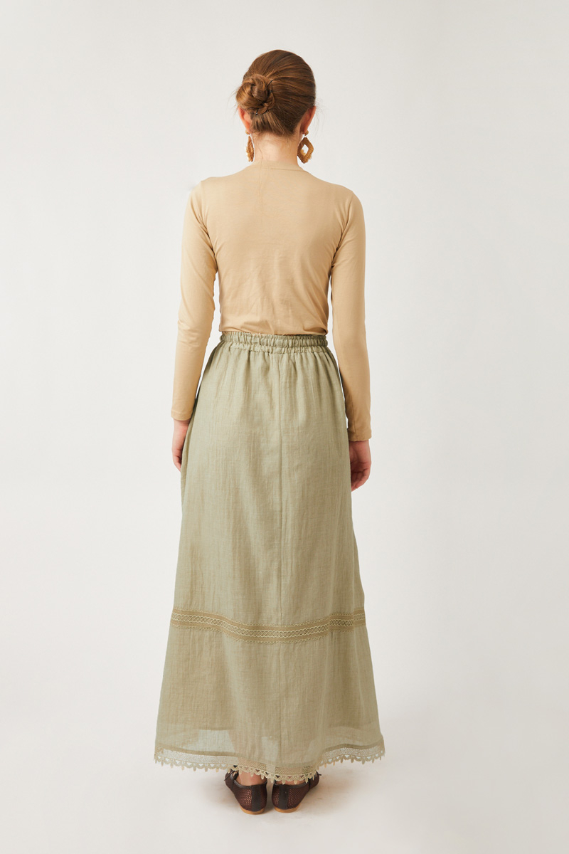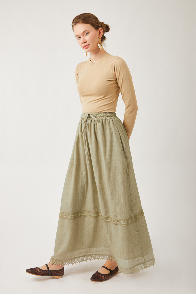 Lara Dantelli Etek Taş. Büzgülü ve lastikli beli sayesinde rahat bir kullanım sunar. Bol A kesimi hareket özgürlüğü sağlarken, etek ucundaki dantel ve işleme detayları şıklık katar. Yanlarda gizli cepleri bulunur. Hem günlük hem de özel anlar için ideal, kullanışlı ve zarif bir parçadır.