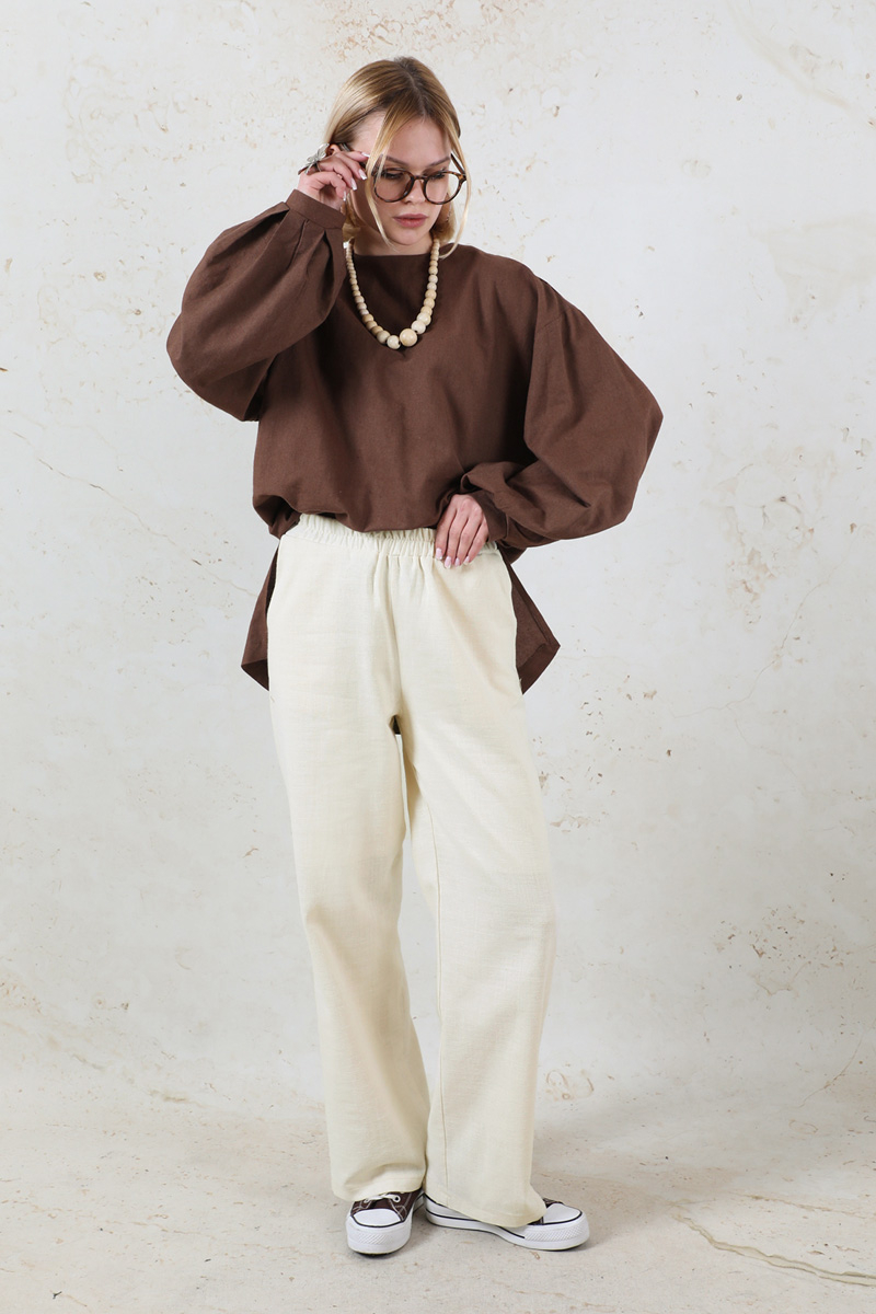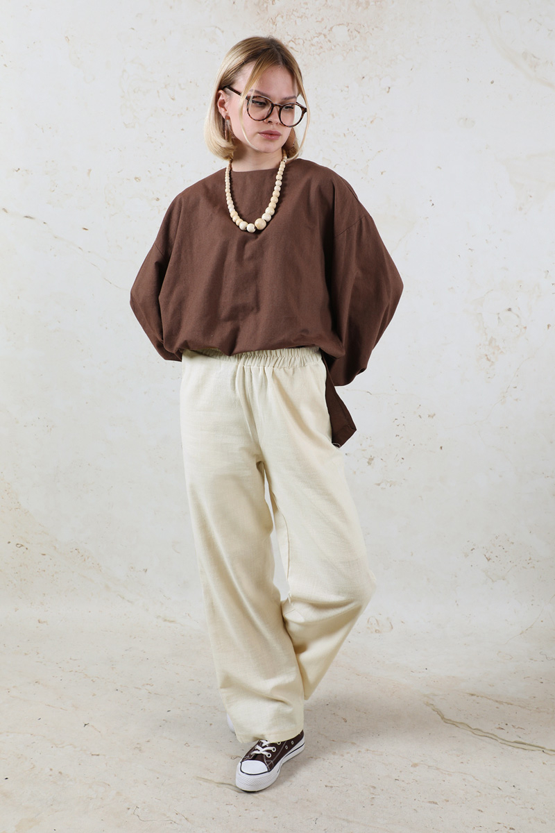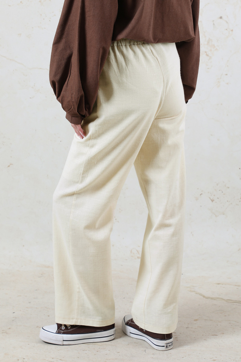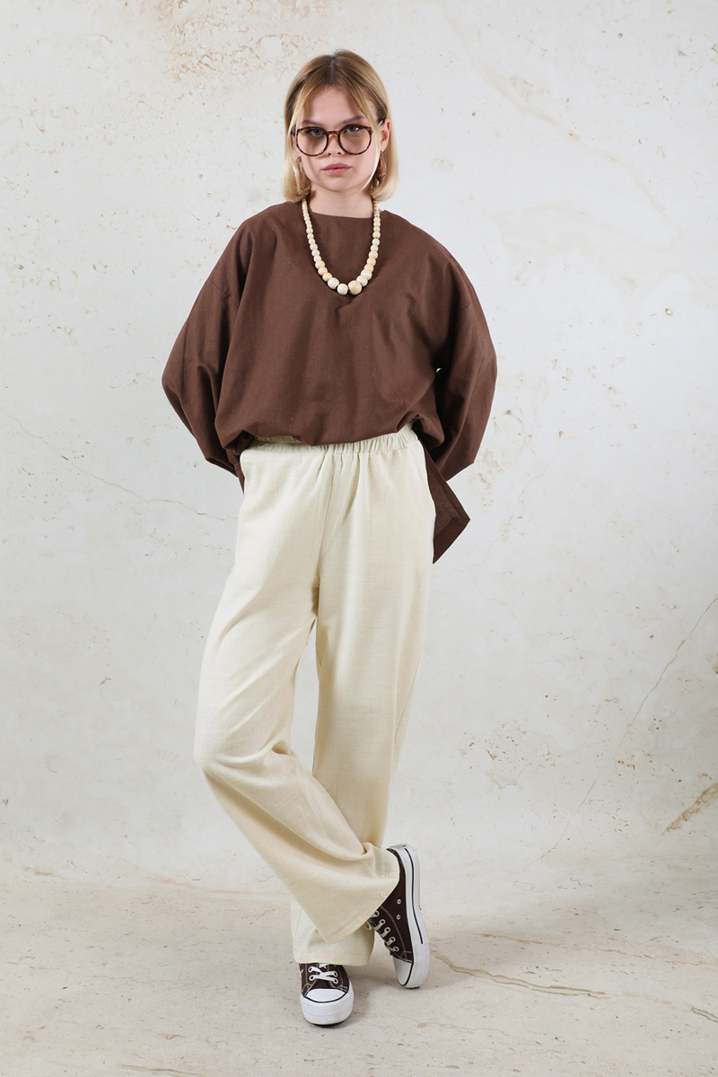 Lastikli Keten Pantolon Taş. Pantolon beli lastiklidir. Yandan ceplidir. Günlük kullanım ve özel günlerinizde tercih edebilirsiniz.
