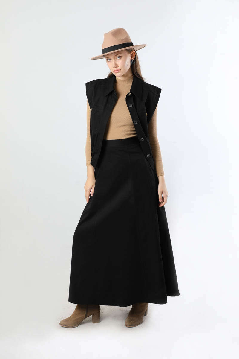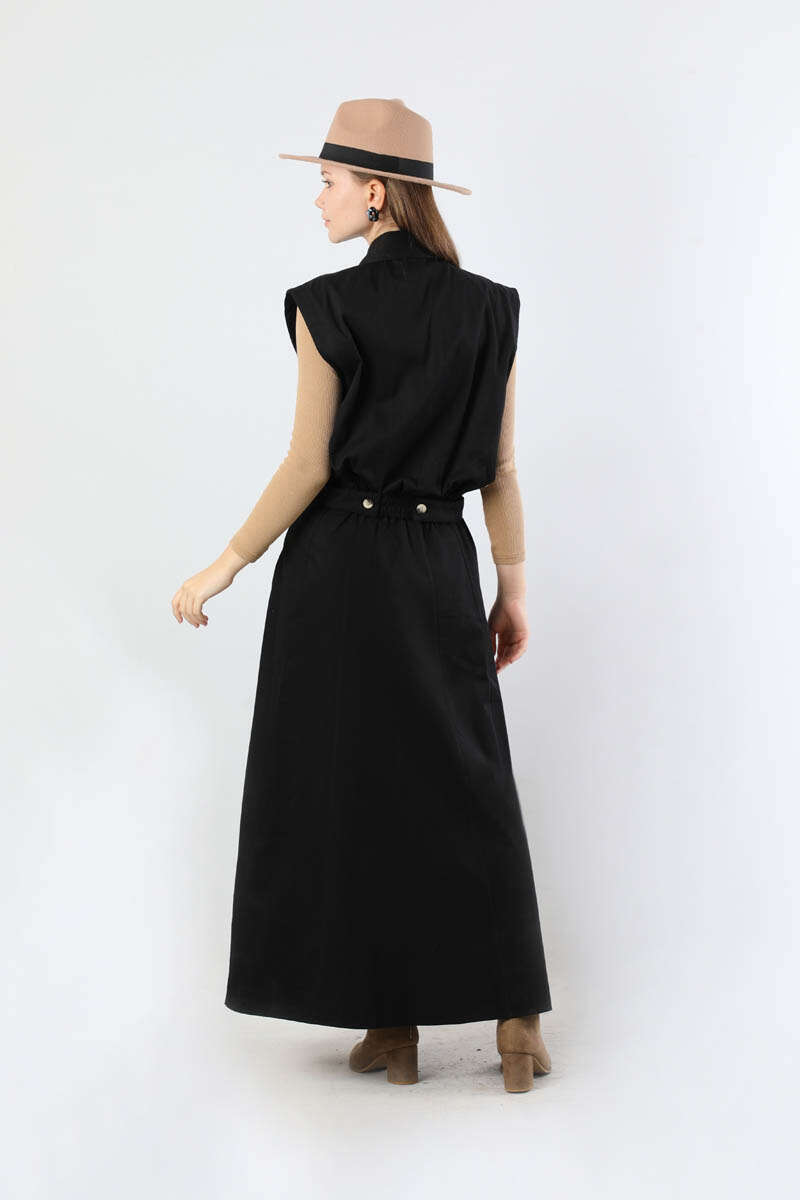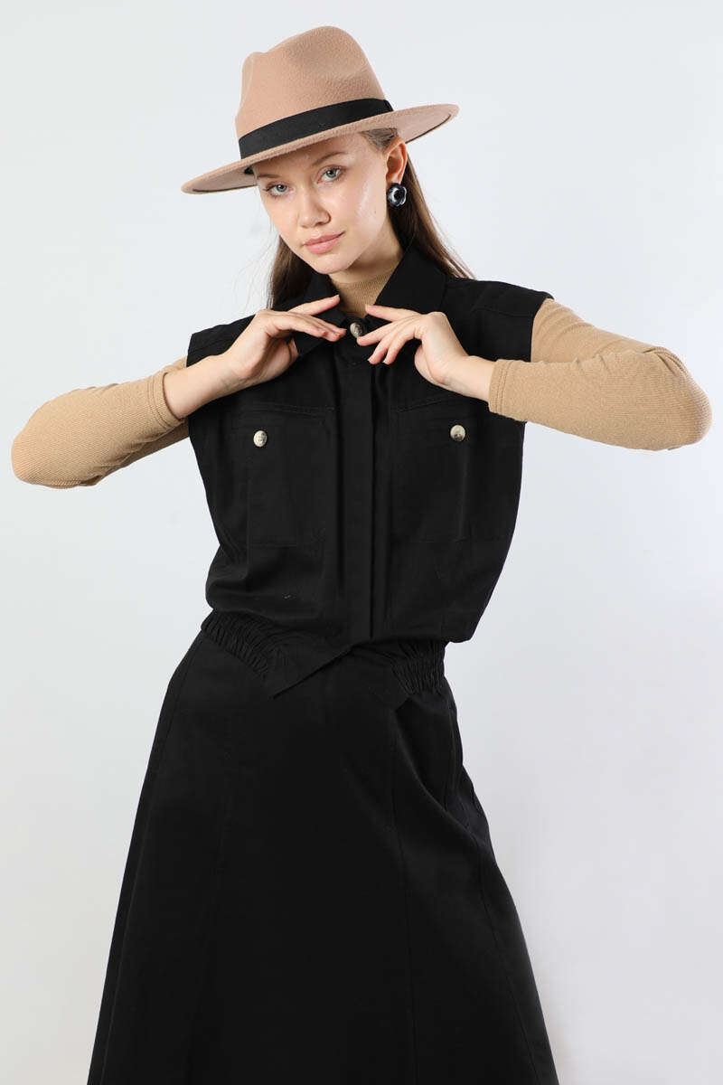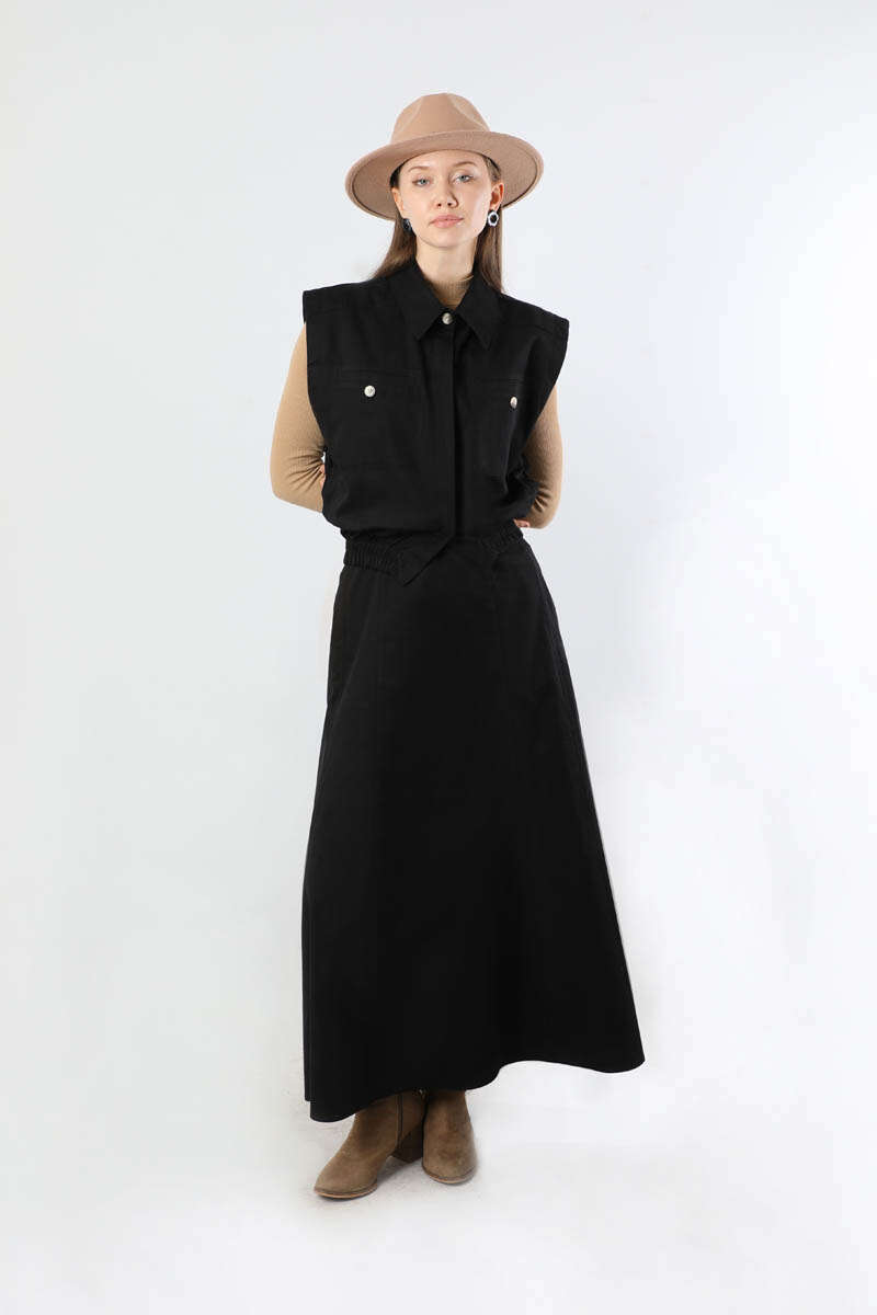 Lastikli Yelek Etek Takım Siyah. Yelek gömlek yakalıdır. Yelek arkadan apolet detaylıdır. Ön cep detaylıdır. Gizli düğmelidir. Etek ucu lastiklidir. Etek beli lastiklidir. Çanta dahil değildir. Günlük kullanım ve özel günlerinizde tercih edebilirsiniz.