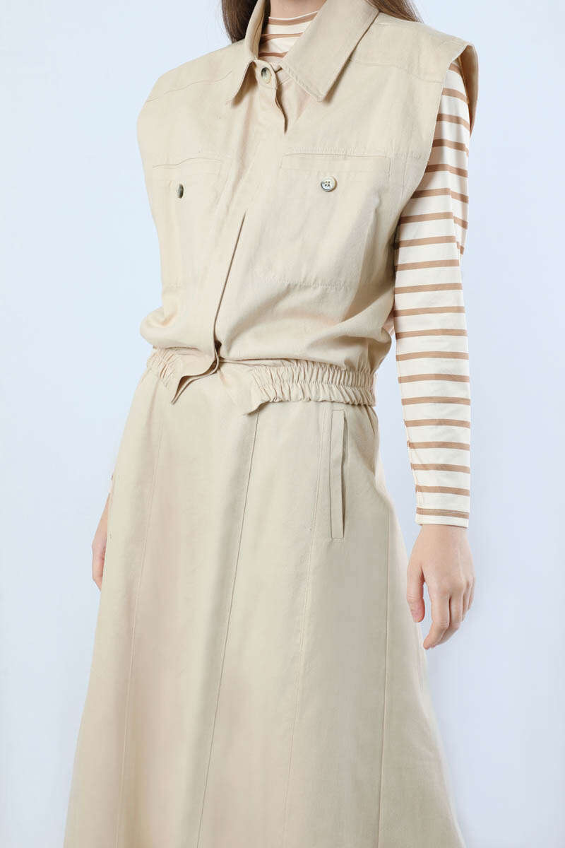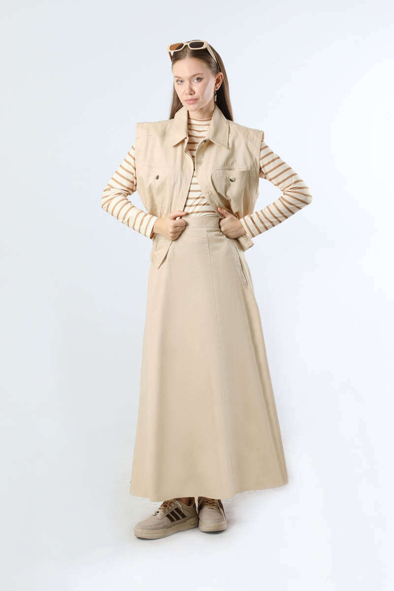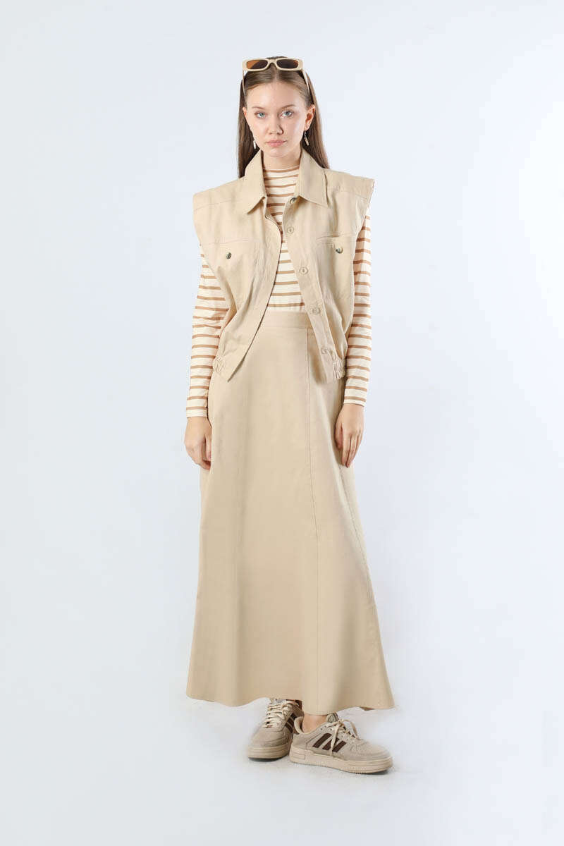 Lastikli Yelek Etek Takım Taş. Yelek gömlek yakalıdır. Yelek arkadan apolet detaylıdır. Ön cep detaylıdır. Gizli düğmelidir. Etek ucu lastiklidir. Etek beli lastiklidir. Çanta dahil değildir. Günlük kullanım ve özel günlerinizde tercih edebilirsiniz.