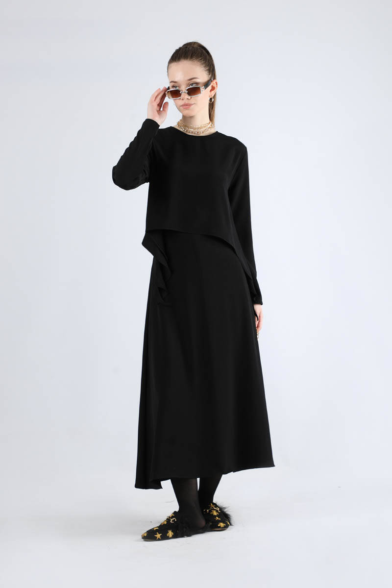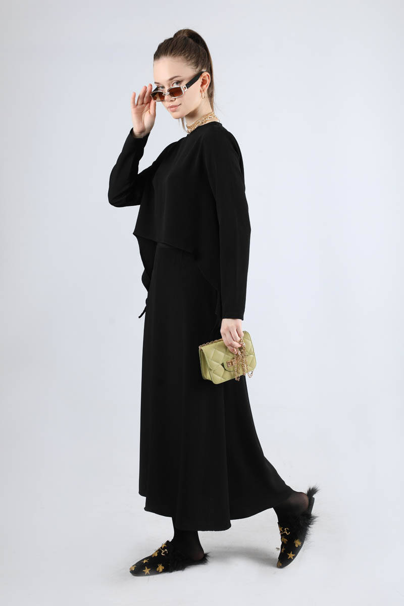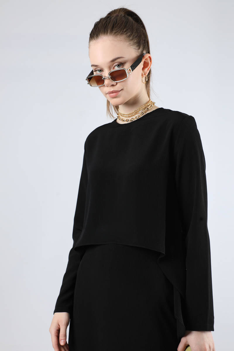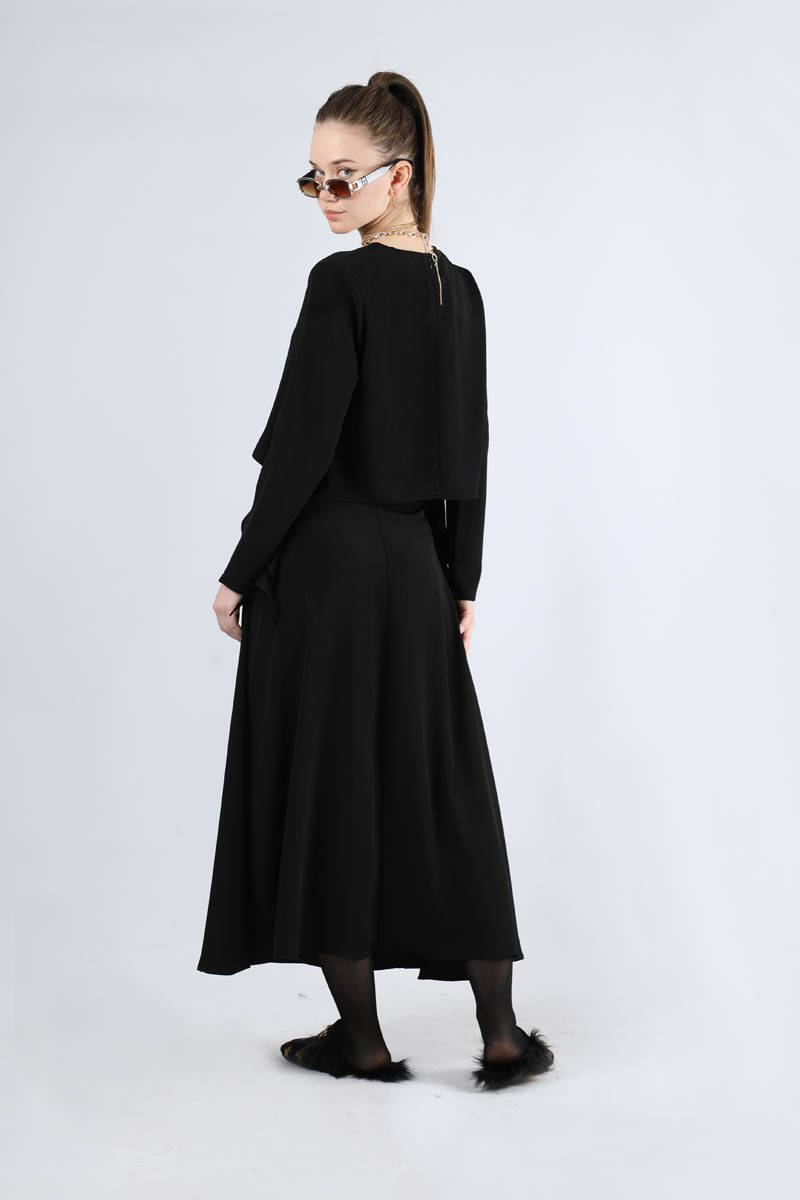 Bisiklet yaka, arkadan fermuarlı, yandan bağlanabilir bluz. Etek astarlı ve yandan fermuarlıdır.