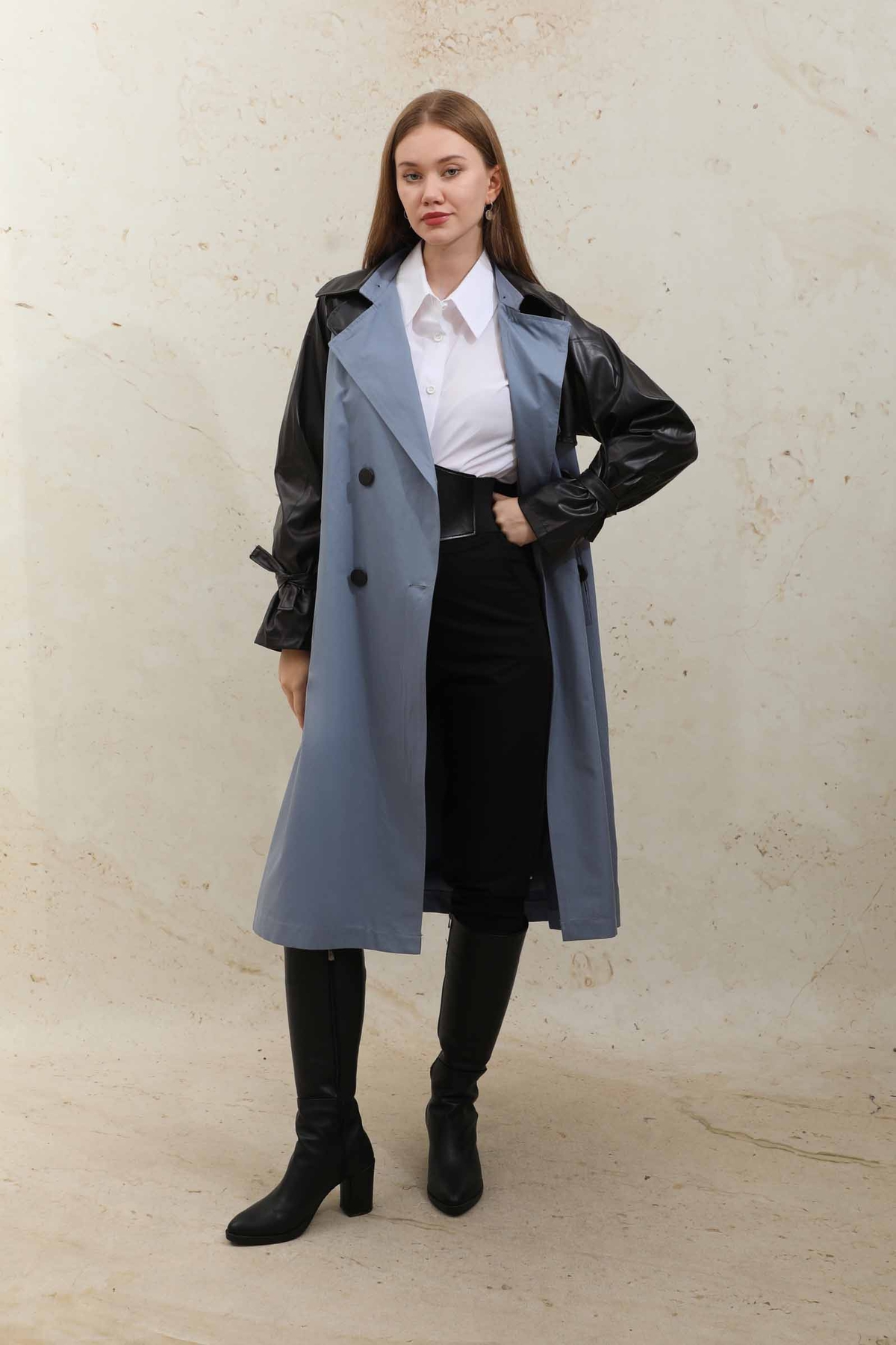 Leather Detailed Trench Coat Blue. Leather details are available. There is a mobile belt from the waist. It is lined. It has two side pockets. It is a double-breasted closure.