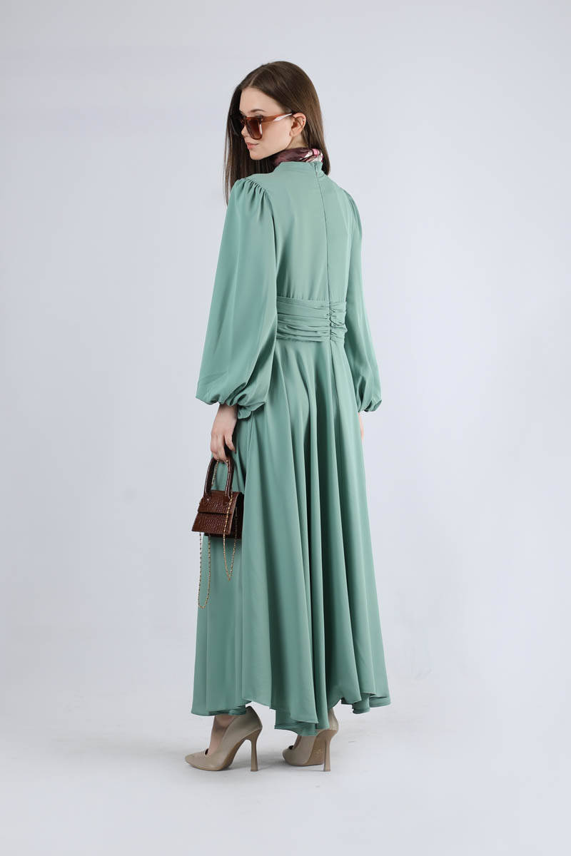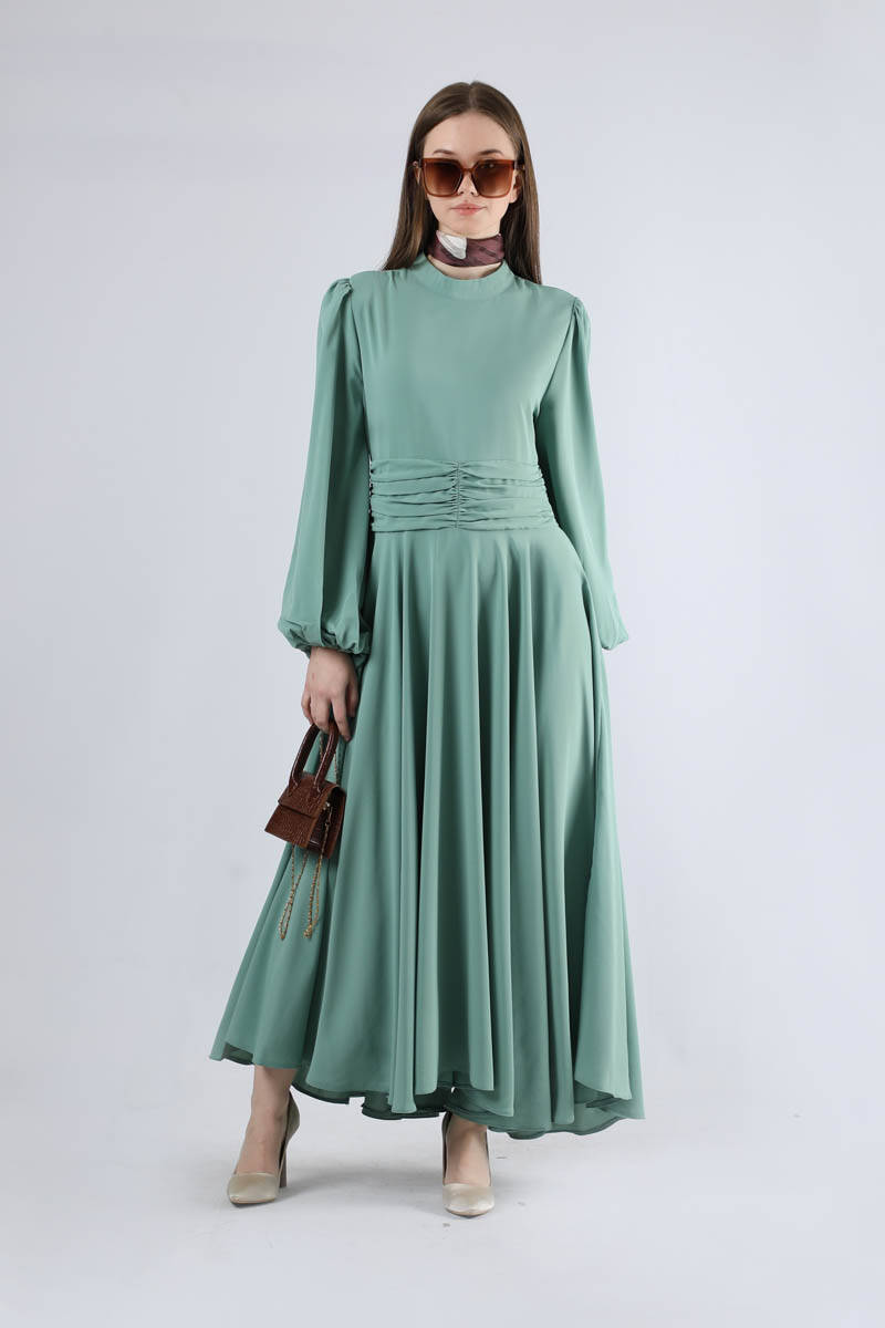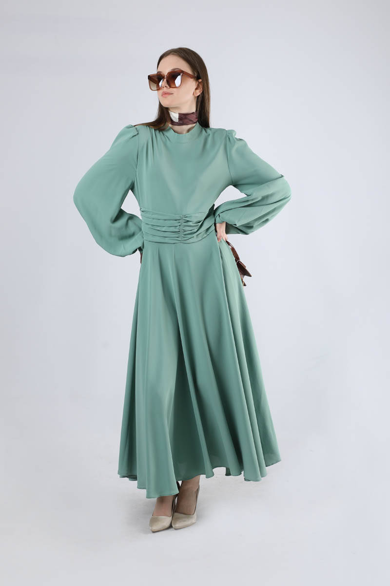 Belden büzgü detaylı elbisenin, asimetrik etek detayları ile dökümlü kol detayları vardır. Elbise iç göstermez tesettüre uygundur. Arkadan fermuar detayı olup rahat giyime sahiptir.