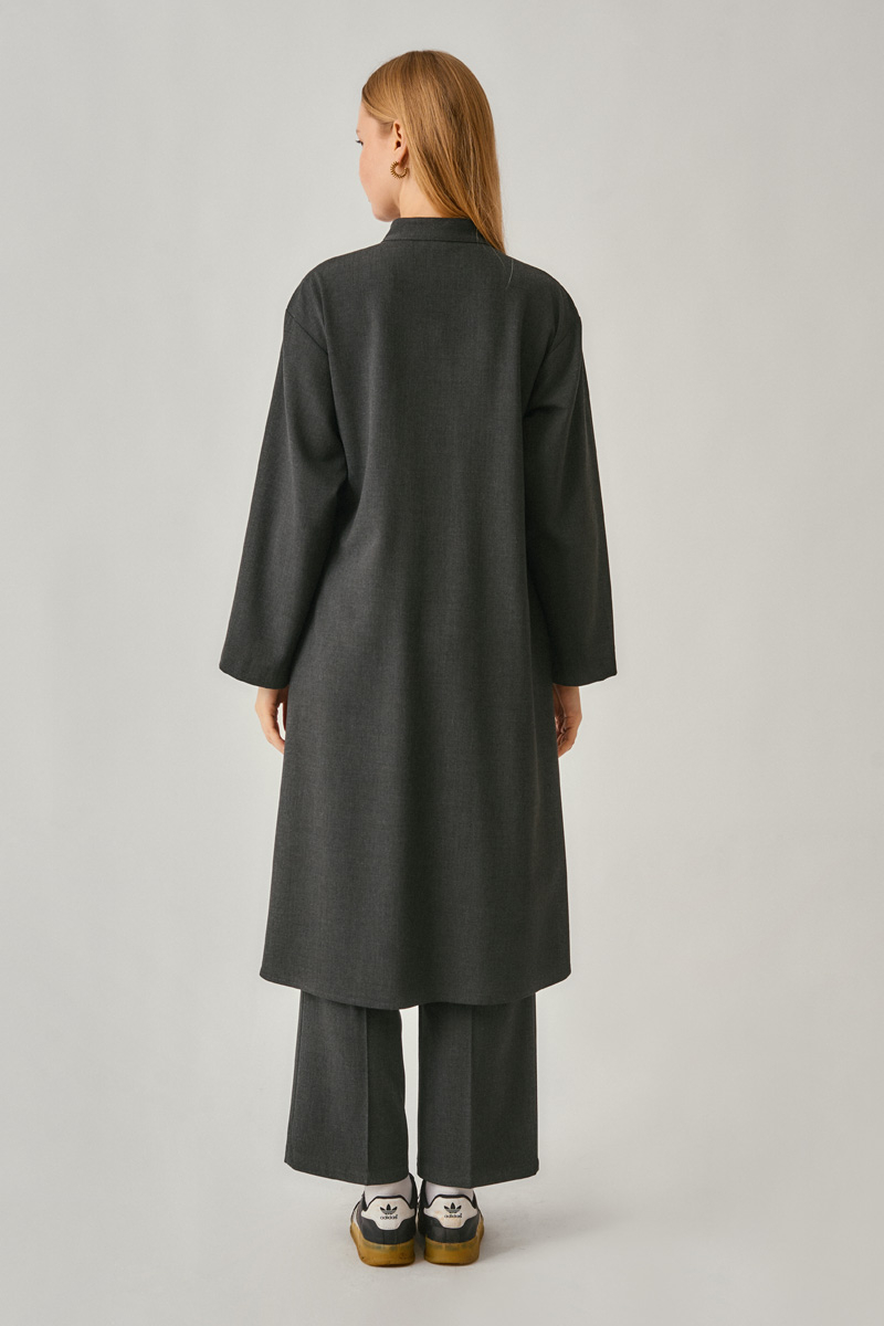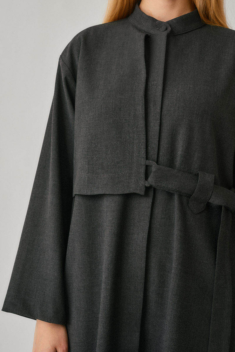 Brings together modern elegance with clean, minimal lines. The concealed placket detail gives the appearance of a buttonless design, adding a refined simplicity to the tunic silhouette, while the waist tie enhances a flattering shape. Thanks to its structured yet fluid fabric, it maintains its form and offers effortless wear for both office and daily outfits. A timeless piece that complements every season and style.