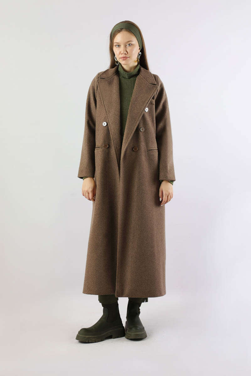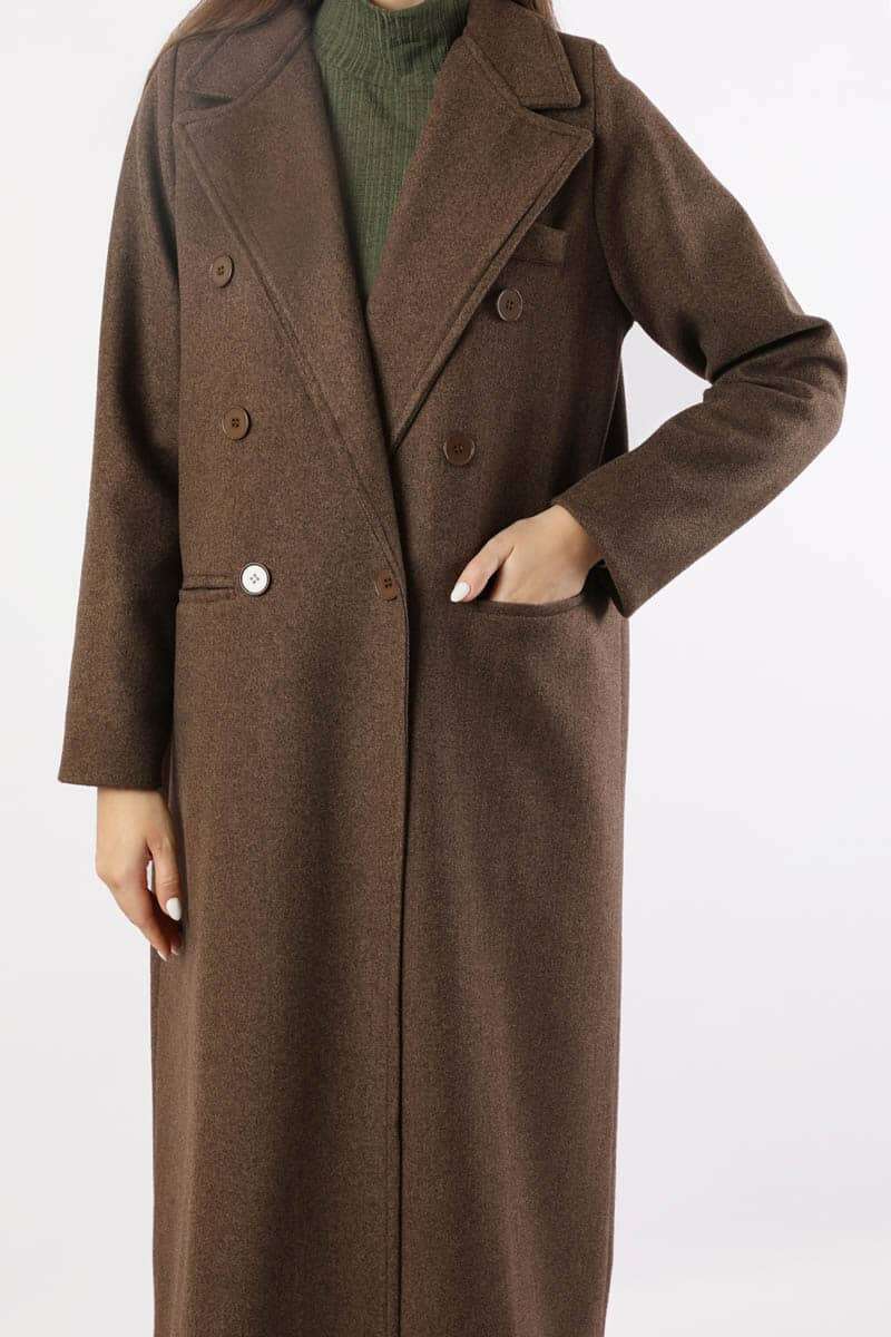 Long Oversize Cachet Coat Brown. English Collar. Double-breasted closure. Asymmetric button. Pocket detail on the side and chest. Lined.