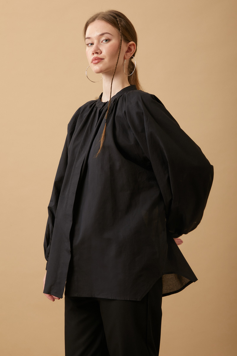 Designed with a gathered waist and a flowing silhouette, this loose-fit voile shirt brings a feminine touch with its elegant collar detail. Its lightweight structure allows for ease of movement, making it an ideal choice for both casual comfort and effortless style.