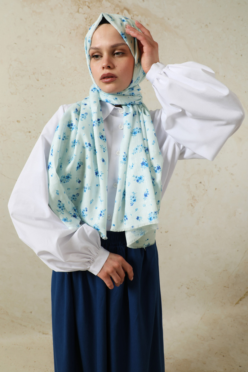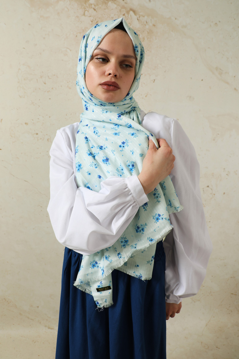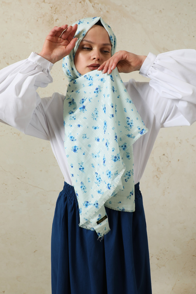 Lotus Desenli Şal Mavi. Pratik oluşu ve kolay şekil alabilir. Tok duruşlu ve dökümlü yapısıyla çok tercih edilmektedir. Ağırlık yapmayan kumaş özelliği ile sık ve uzun süreli kullanıma uygundur. Dört mevsim kullanıma uygundur.