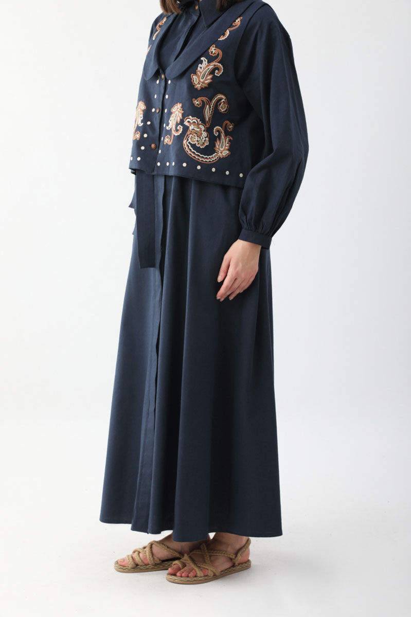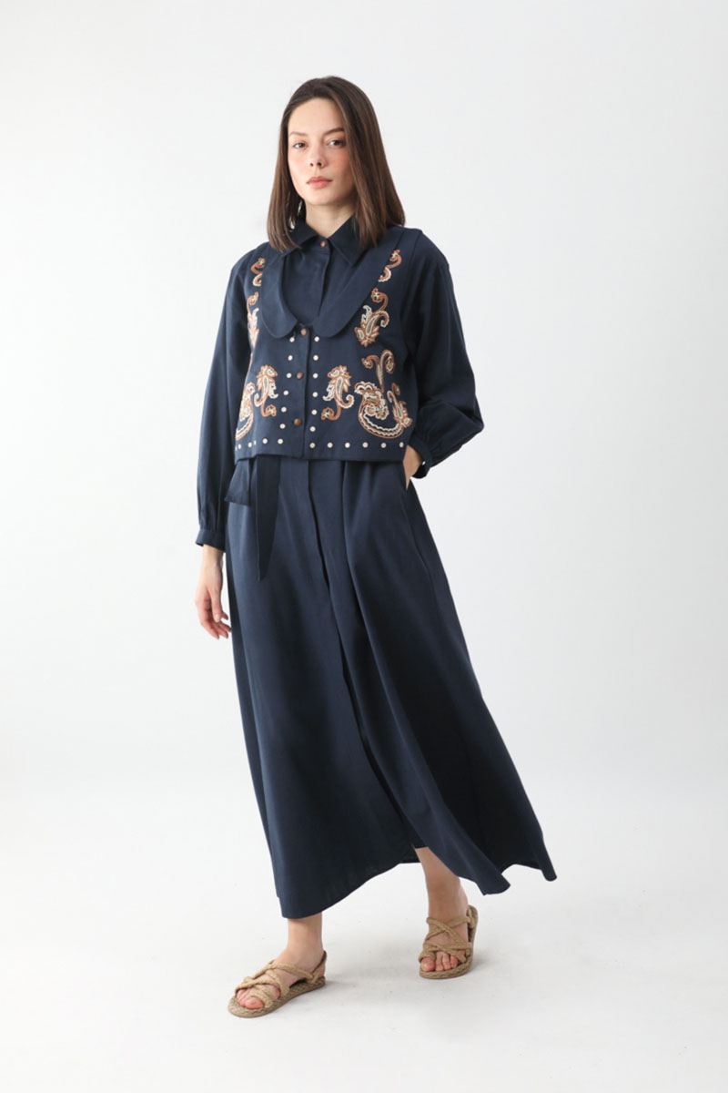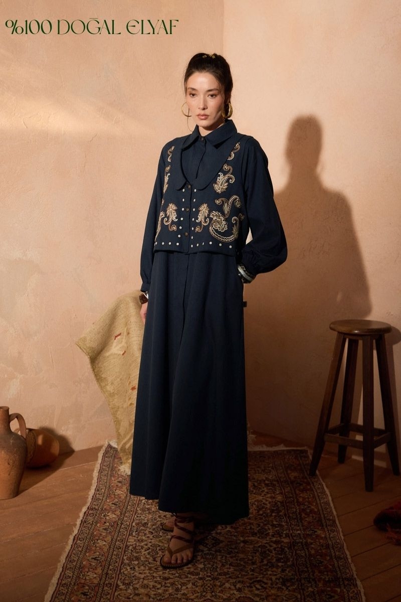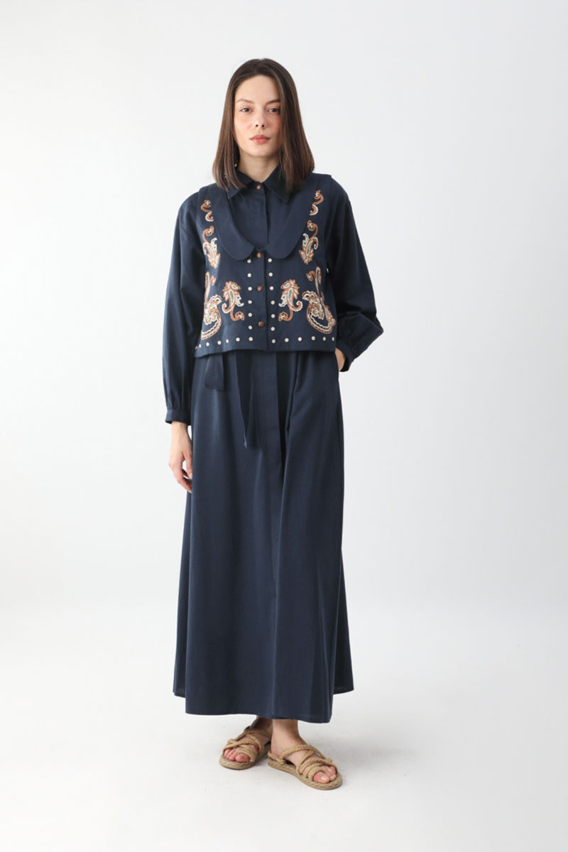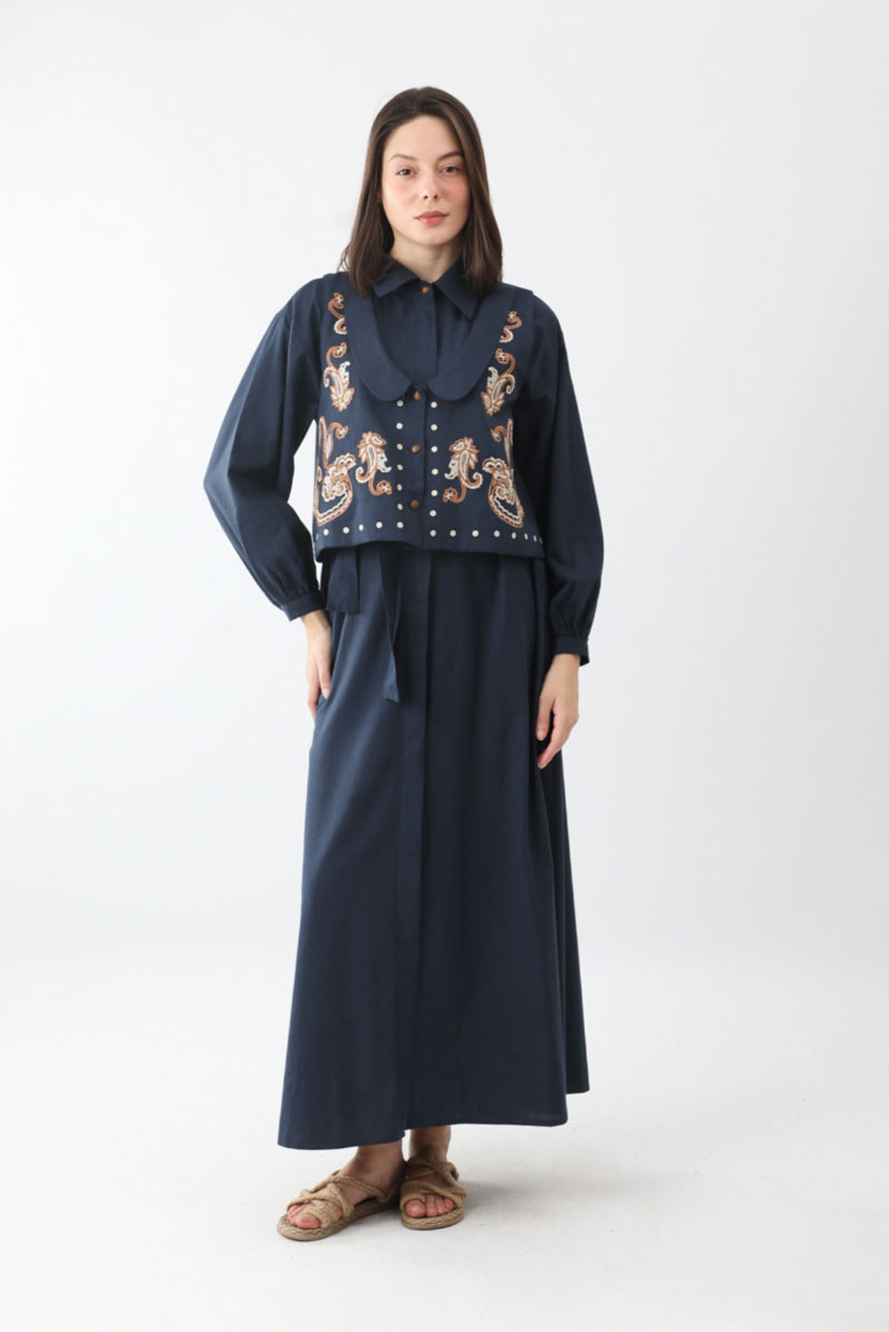 Manas Yelekli Elbise Takım Lacivert. Elbise, gömlek yakadır, önden gizli düğmelidir, hafif düşük omuzludur, ince manşetli olup düğmelidir, yandan ceplidir, kuşaklıdır, astarsızdır, Yelek: bebe yakadır, etnik desen nakışlıdır, düğmeldir, bol kalıptır. Yelek ve elbise ayrı parçalar olup takım halinde satılmaktadır. Günlük kullanım ve özel günlerinizde tercih edebilirsiniz.