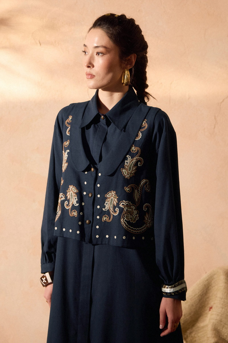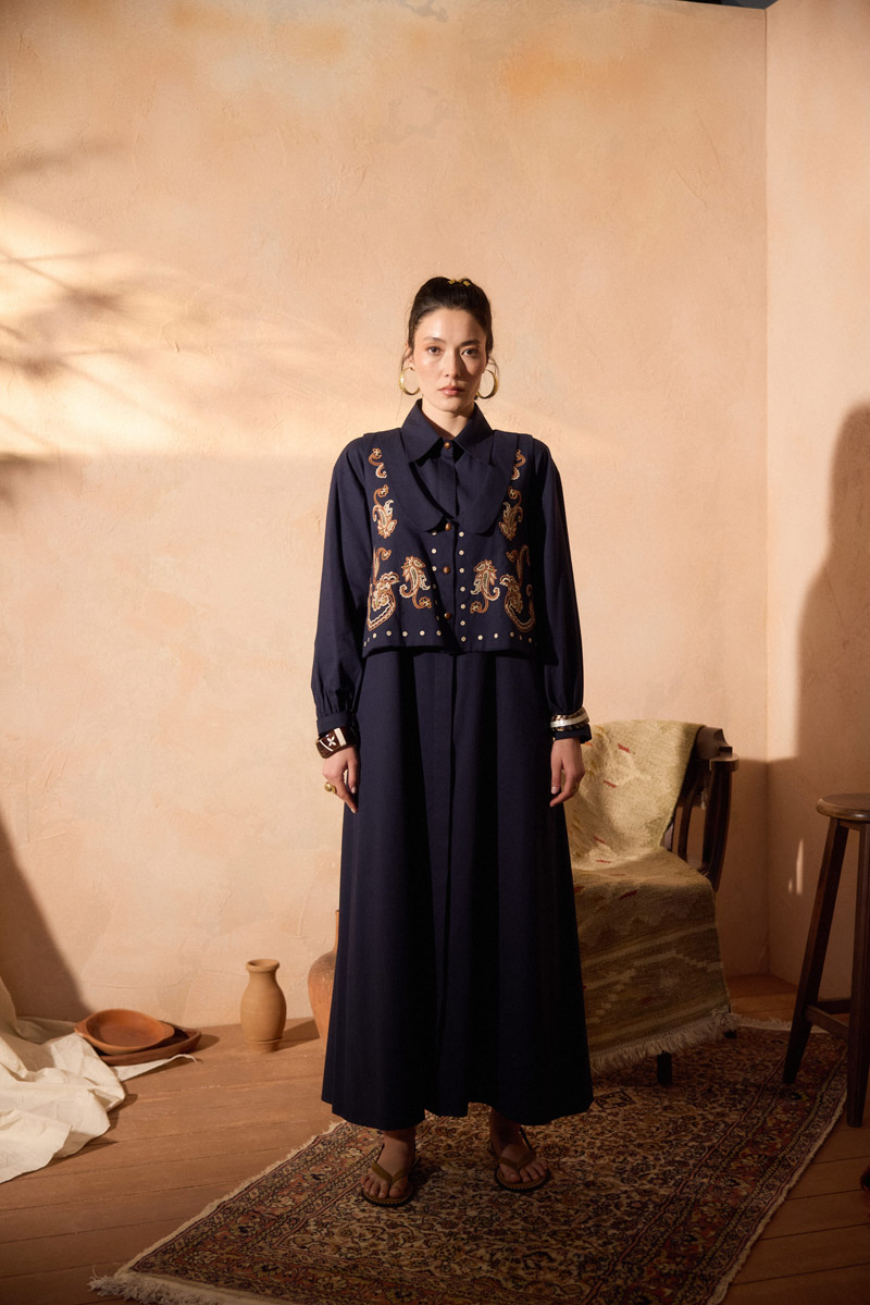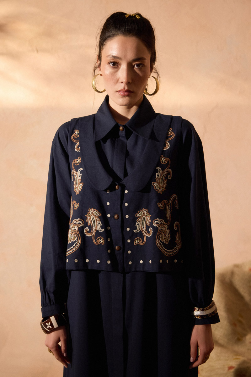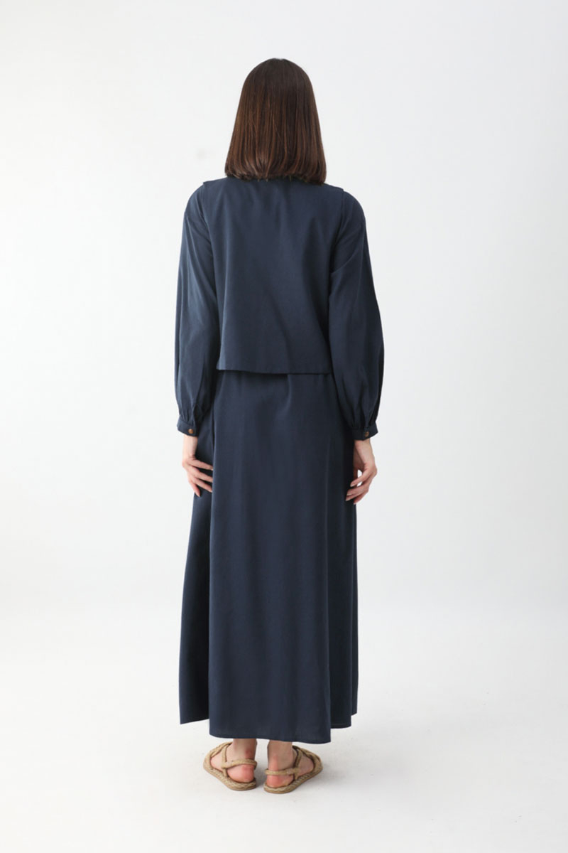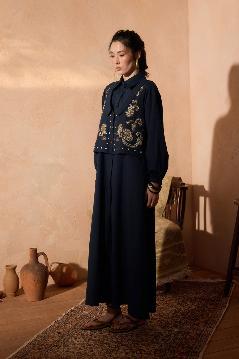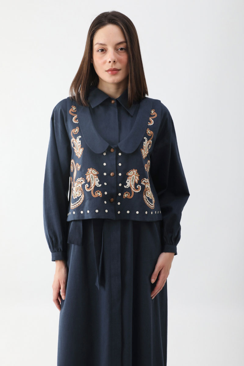 Manas Yelekli Elbise Takım Lacivert. Elbise, gömlek yakadır, önden gizli düğmelidir, hafif düşük omuzludur, ince manşetli olup düğmelidir, yandan ceplidir, kuşaklıdır, astarsızdır, Yelek: bebe yakadır, etnik desen nakışlıdır, düğmeldir, bol kalıptır. Yelek ve elbise ayrı parçalar olup takım halinde satılmaktadır. Günlük kullanım ve özel günlerinizde tercih edebilirsiniz.