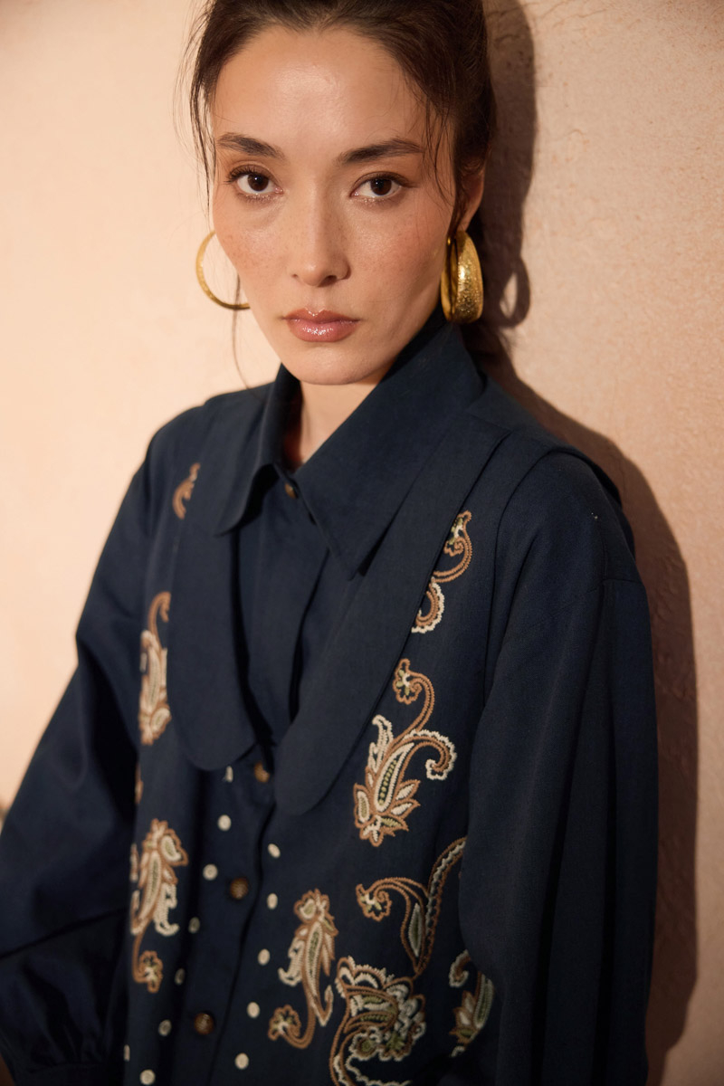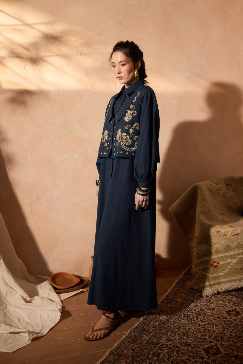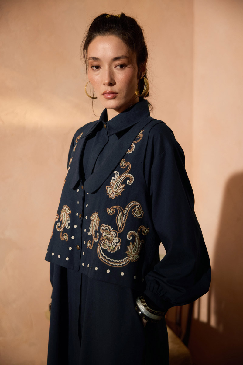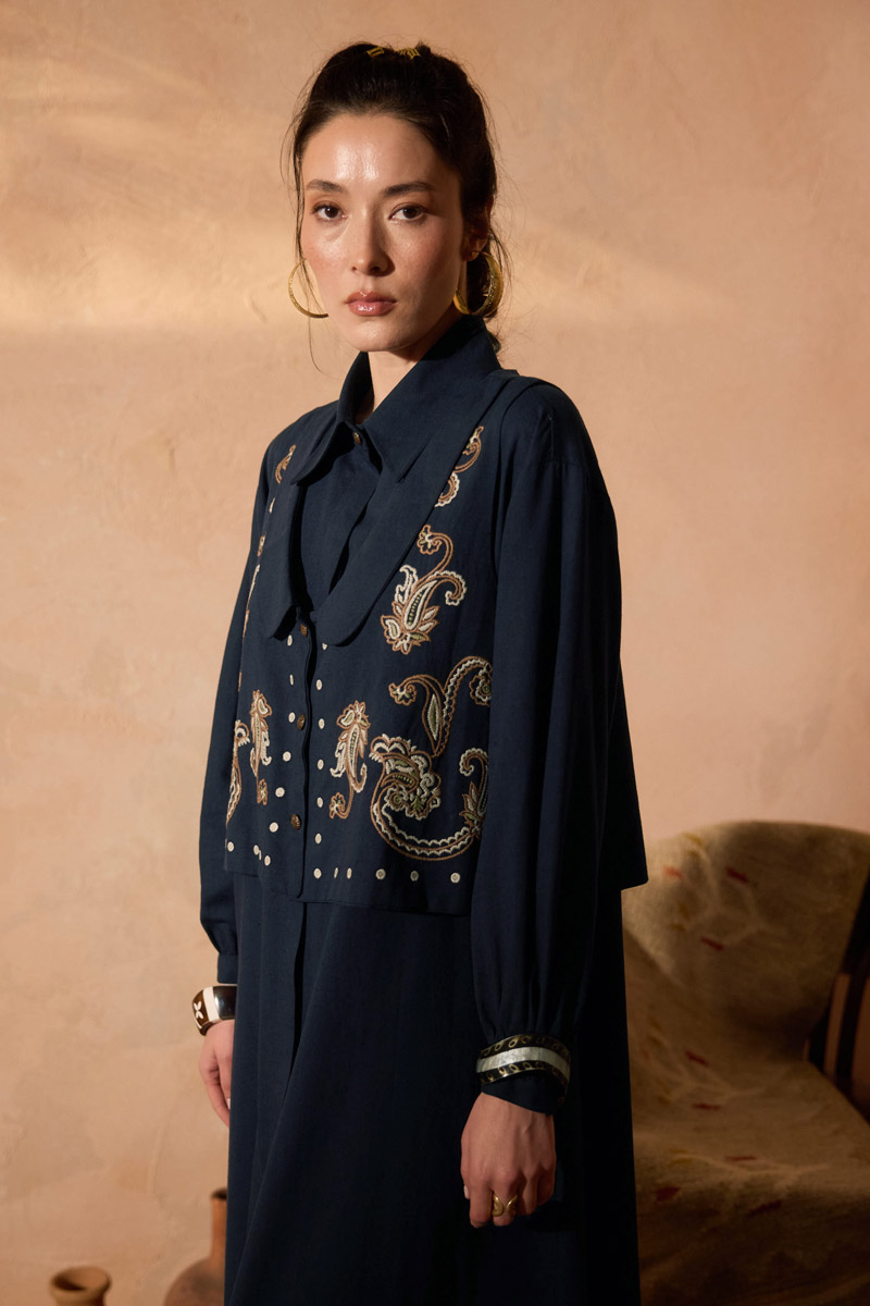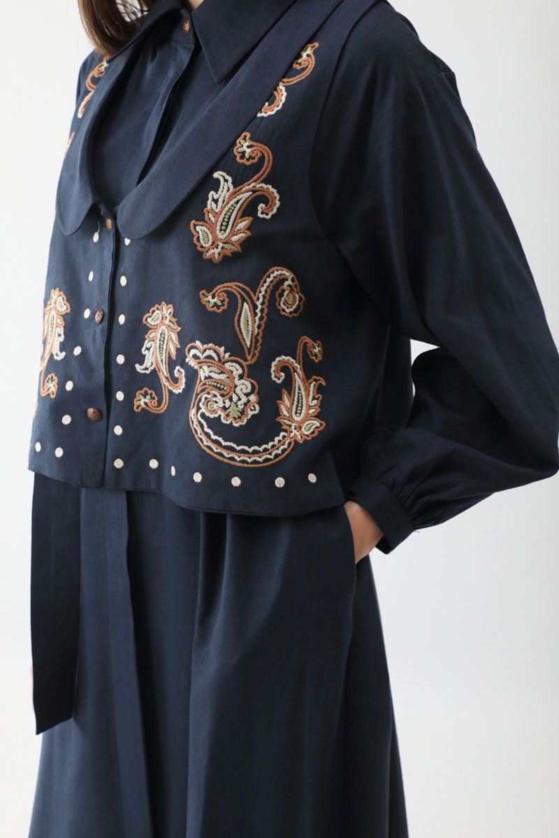 Manas Yelekli Elbise Takım Lacivert. Elbise, gömlek yakadır, önden gizli düğmelidir, hafif düşük omuzludur, ince manşetli olup düğmelidir, yandan ceplidir, kuşaklıdır, astarsızdır, Yelek: bebe yakadır, etnik desen nakışlıdır, düğmeldir, bol kalıptır. Yelek ve elbise ayrı parçalar olup takım halinde satılmaktadır. Günlük kullanım ve özel günlerinizde tercih edebilirsiniz.