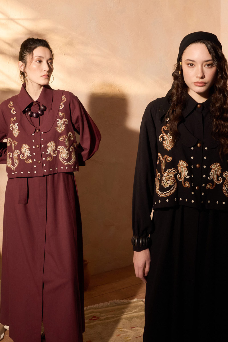 Manas Yelekli Elbise Takım Siyah. Elbise, gömlek yakadır, önden gizli düğmelidir, hafif düşük omuzludur, ince manşetli olup düğmelidir, yandan ceplidir, kuşaklıdır, astarsızdır, Yelek: bebe yakadır, etnik desen nakışlıdır, düğmeldir, bol kalıptır. Yelek ve elbise ayrı parçalar olup takım halinde satılmaktadır. Günlük kullanım ve özel günlerinizde tercih edebilirsiniz.