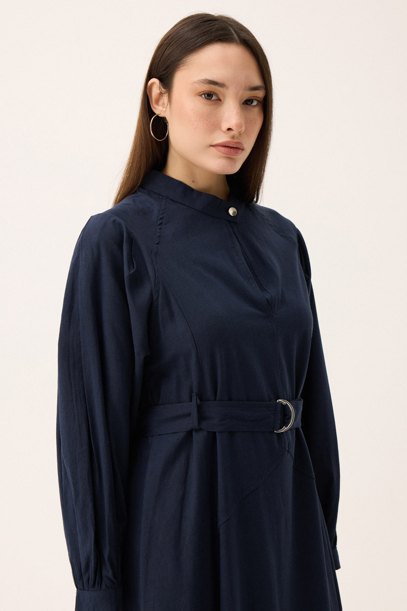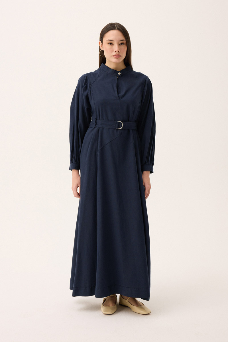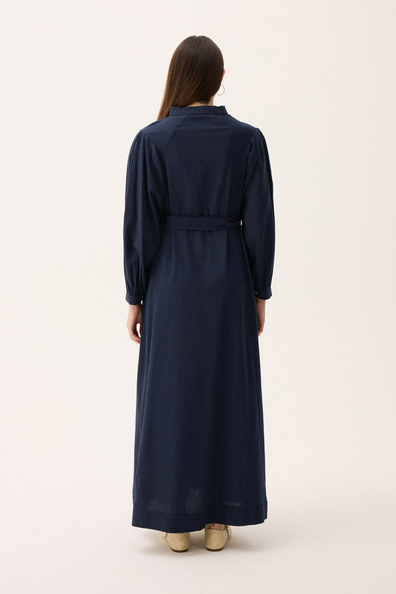 Mandarin Collar Sewn Linen Dress in Khaki. It features a mandarin collar with triangular stitch detailing and a foldable button detail. The dress has raglan sleeves, front stitch detailing, hidden side pockets, a belt, and is unlined. Suitable for both everyday wear and special occasions.