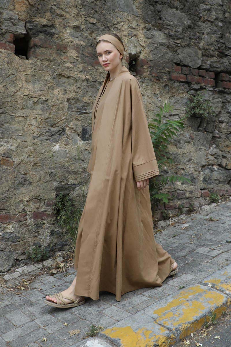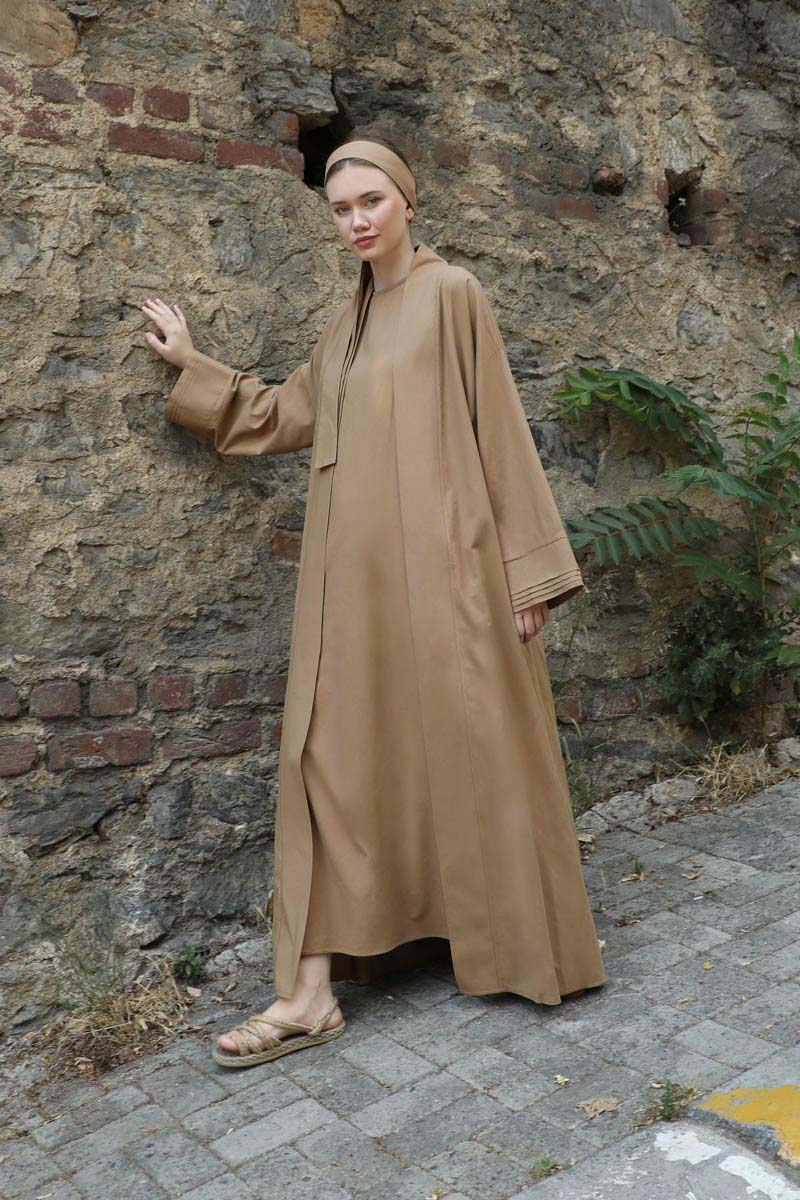 Manşeti Nervürlü Abaya Camel. Düşük omuz, kuşaklı, yandan gizili cepli, kalın menşet ve maşetlerin ucunda nervür detayı vardır. Dilerseniz içine kombin olarak sıfır kol keten elbisemizi tercih edebilirsiniz.