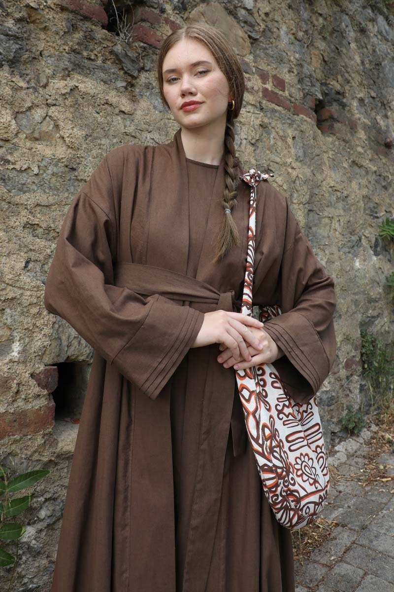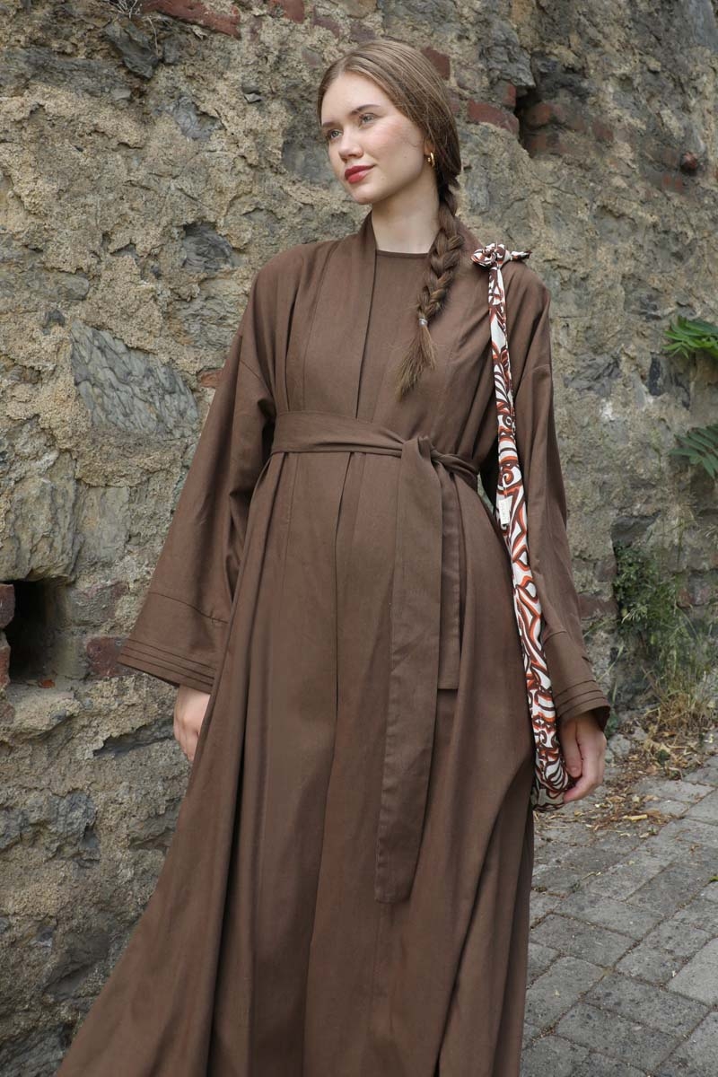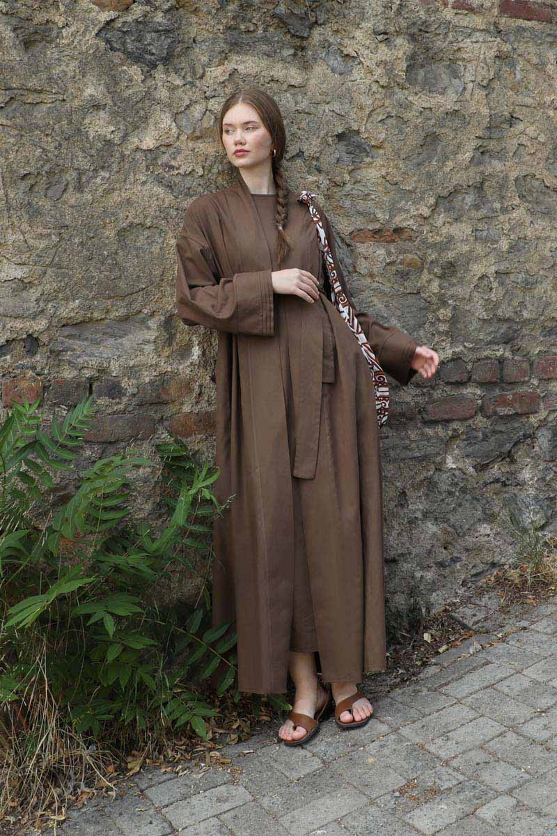 Manşeti Nervürlü Abaya Kahverengi. Düşük omuz, kuşaklı, yandan gizili cepli, kalın menşet ve maşetlerin ucunda nervür detayı vardır. Dilerseniz içine kombin olarak sıfır kol keten elbisemizi tercih edebilirsiniz.