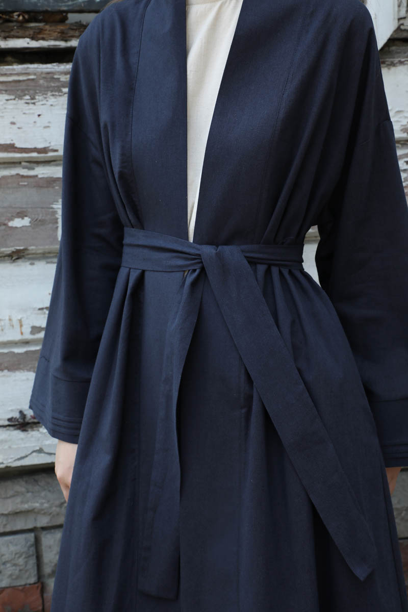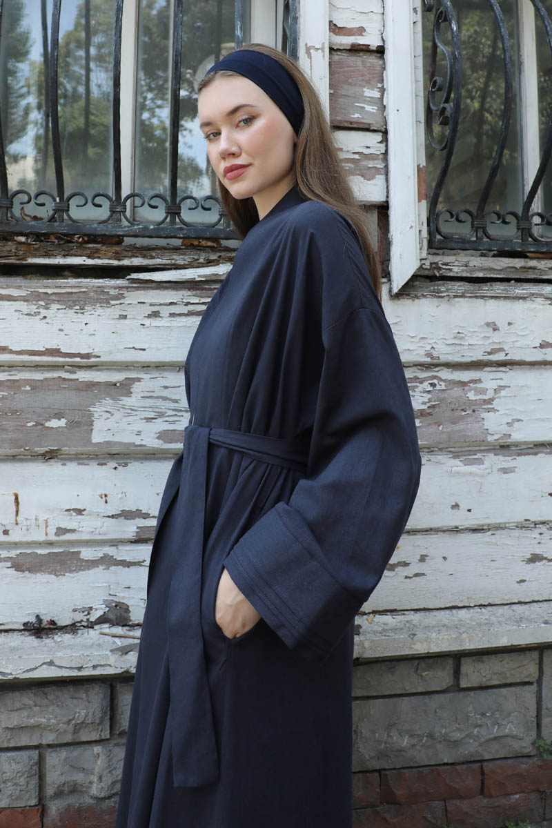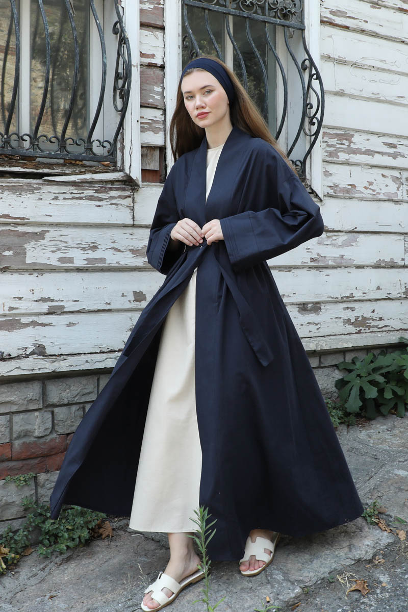 Manşeti Nervürlü Abaya Lacivert. Düşük omuz, kuşaklı, yandan gizili cepli, kalın menşet ve maşetlerin ucunda nervür detayı vardır. Dilerseniz içine kombin olarak sıfır kol keten elbisemizi tercih edebilirsiniz.