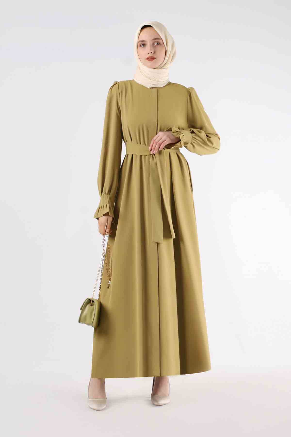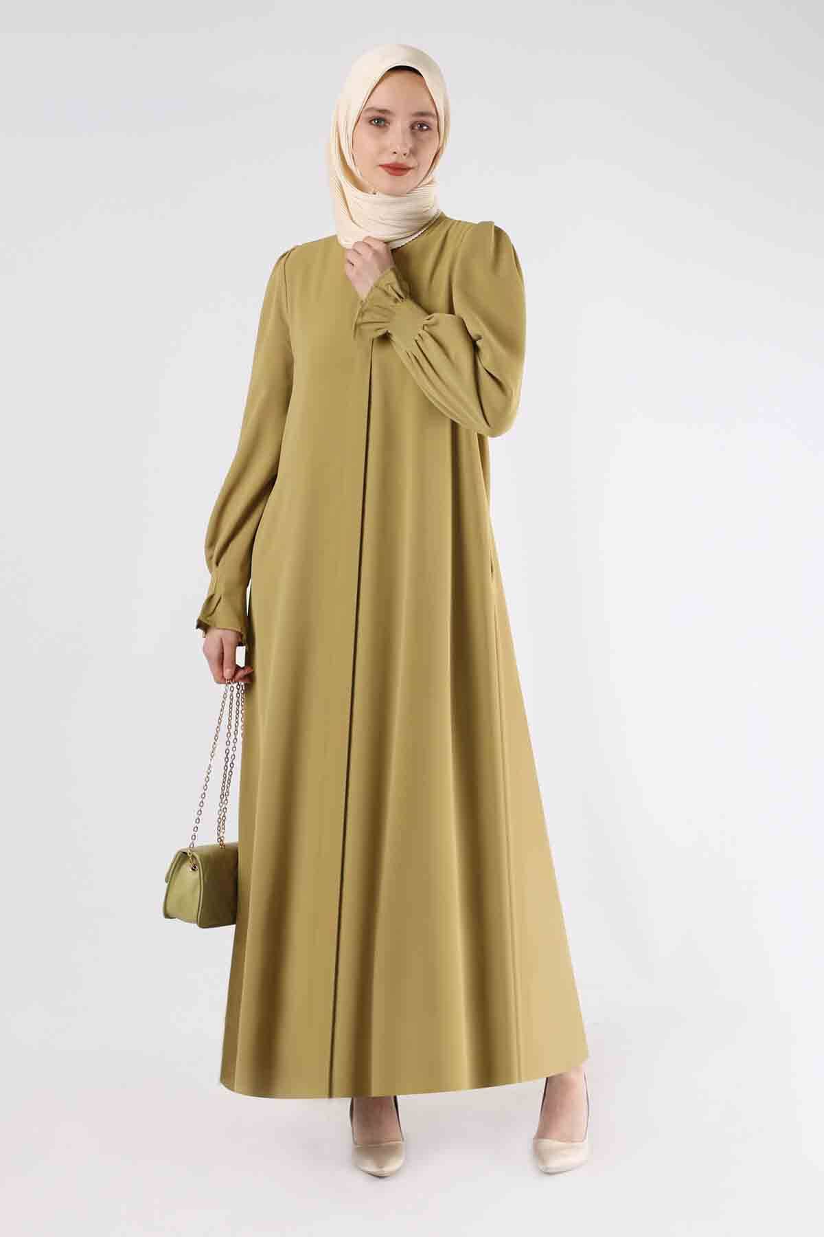 Manşeti Pileli Elbise Ferace Yağ Yeşili