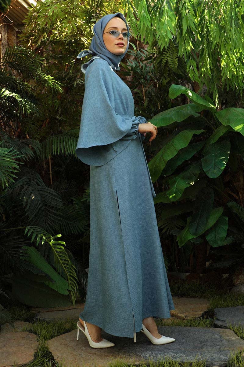 Flywheel Cuff Piece Abaya Suit Baby Blue. The flywheel from the arm house is fragmented and has a cape. It is belted. The abaya has a slit on the side. The cuff is elastic. You can choose it on your special days.