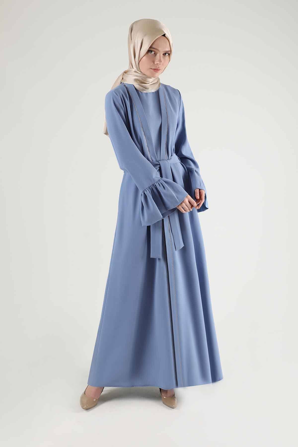 Manşeti Volanlı Taşlı Abaya Takım Bebe Mavisi. Kol ağzı volanlıdır. iç elbise hakim yakalıdır, ve yakanın altında taş detayı mevcuttur, İç elbise sıfır kolludur. Kuşaklıdır. Arkadan fermuarlıdır Normal kalıptır. Özel günlerinizde tercih edebilirsiniz.