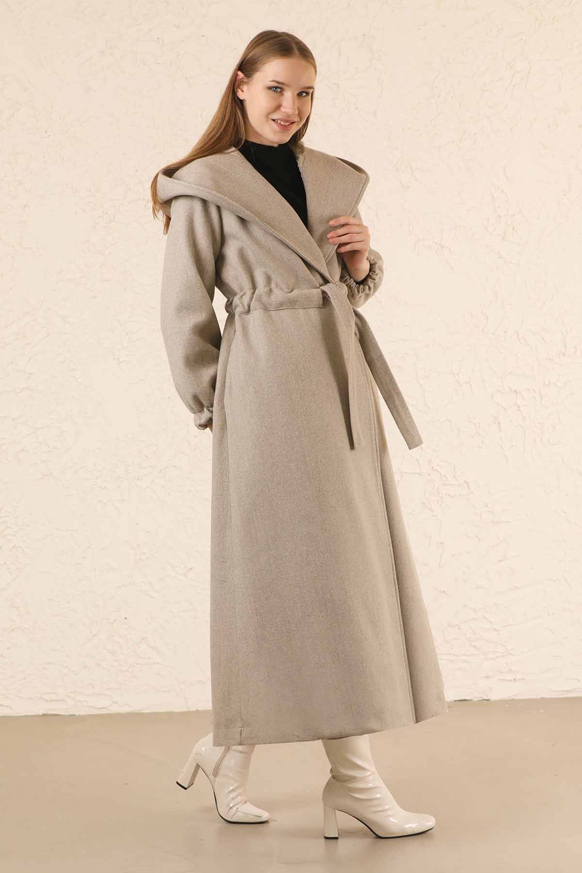 Maria Uzun Kaşe Kaban Çakıl. Kapüşonlu, belden bağlamalı, kapamasız, cepli, astarlı.