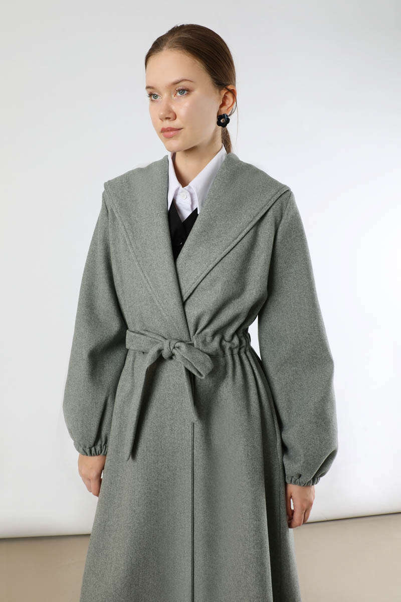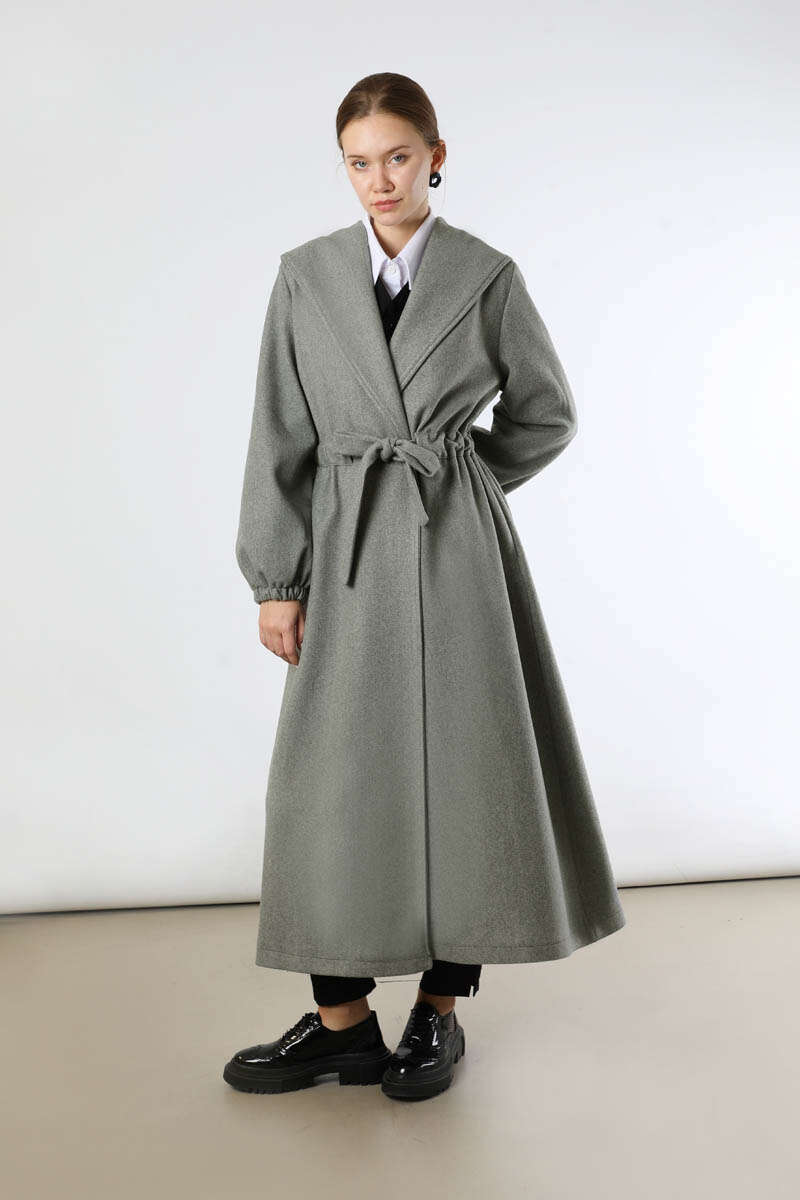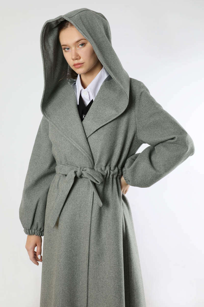 Kapüşonlu, belden bağlamalı, kapamasız, cepli, astarlı.