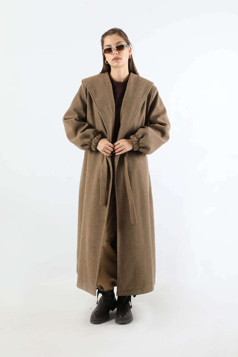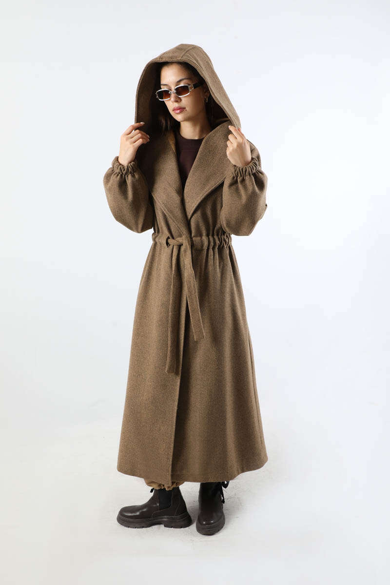 Maria Uzun Kaşe Kaban Taba. Kapüşonlu, belden bağlamalı, kapamasız, cepli, astarlı.