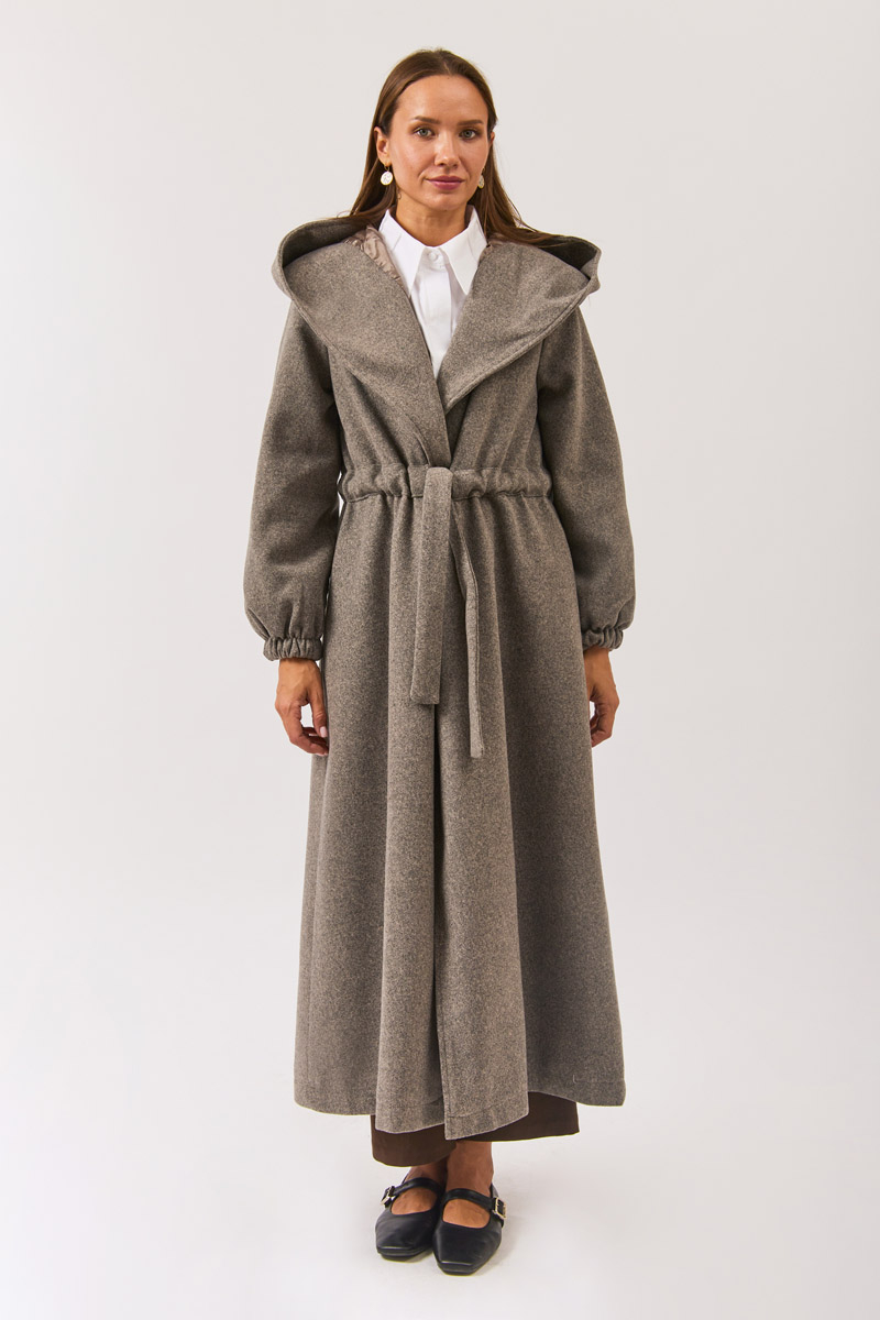 Kapüşonlu, belden bağlamalı, kapamasız, cepli, astarlı.