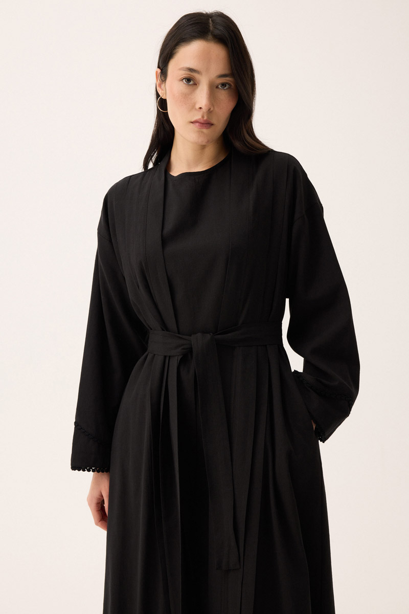 Mayda Abaya Takım Siyah. İç elbise bisiklet yakadır, sıfır kolludur, abaya düşük kolludur, kolları natural biye detaylıdır, önü pile detaylıdır, yandan ceplidir, kuşaklıdır, astarsızdır, Günlük kullanım ve özel günlerinizde tercih edebilirsiniz.
