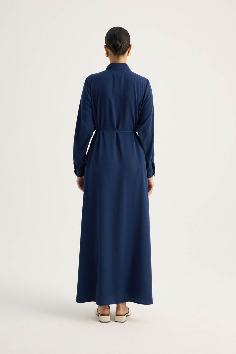 Featuring a shirt collar and hidden button closure, this dress includes a windbreaker detail and side pockets for practicality. It comes with a thin belt for added shape, making it suitable for both daily wear and special occasions.