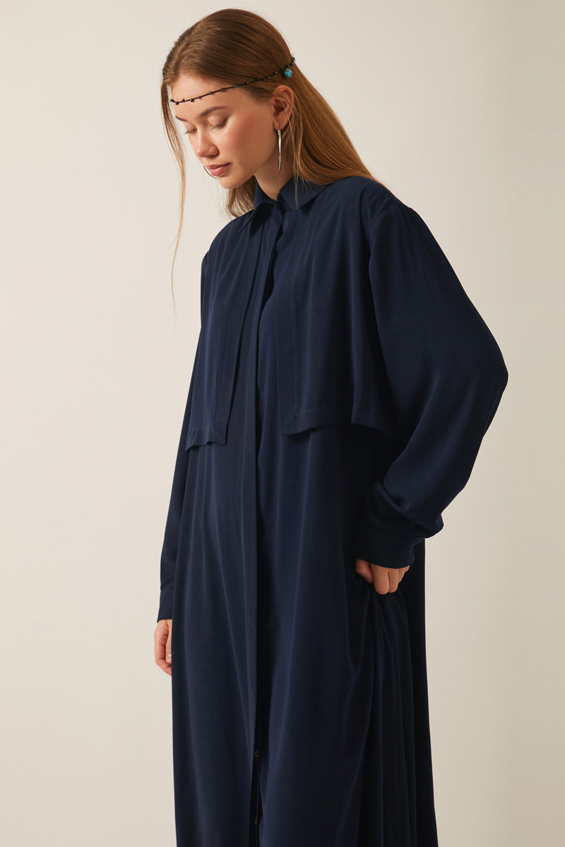 Medine İpeği Elbise Koyu Lacivert. Gömlek yakalıdır. Gizli düğmelidir. Rüzgarlık detaylıdır. Yandan ceplidir. İnce kuşaklıdır. Günlük kullanım ve özel günlerinizde tercih edebilirsiniz.