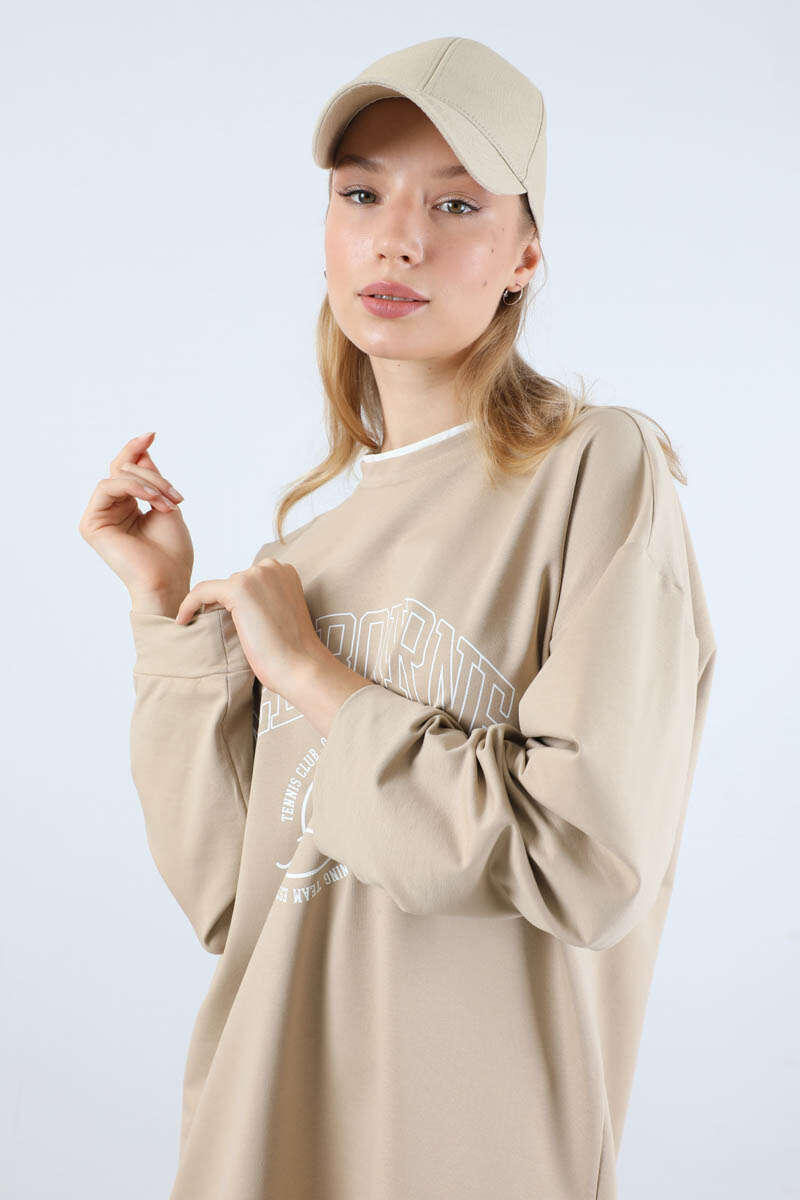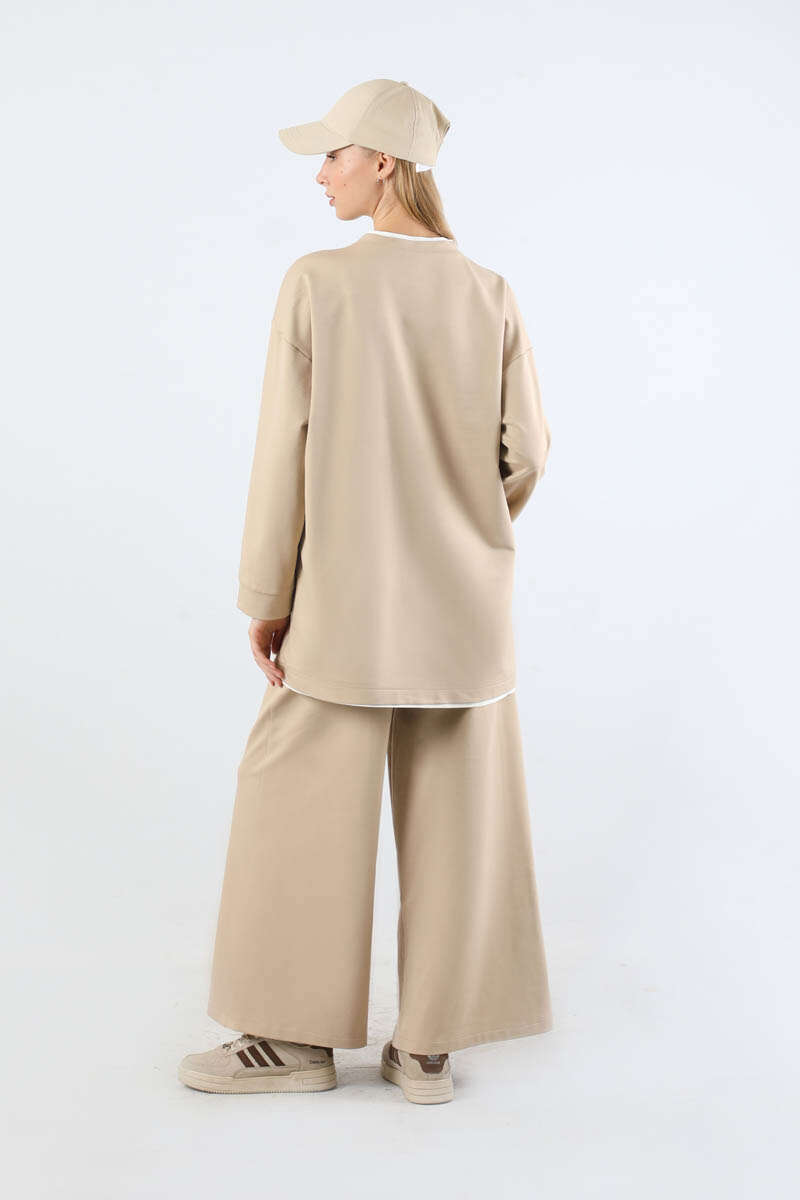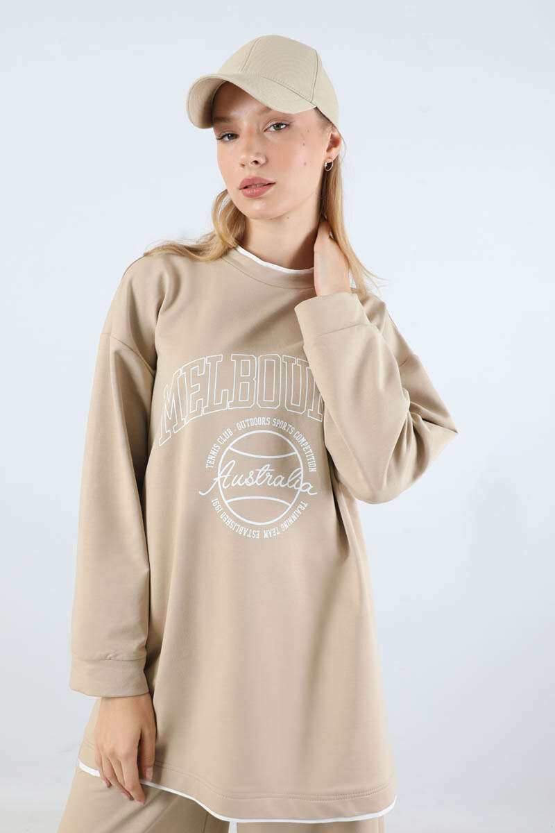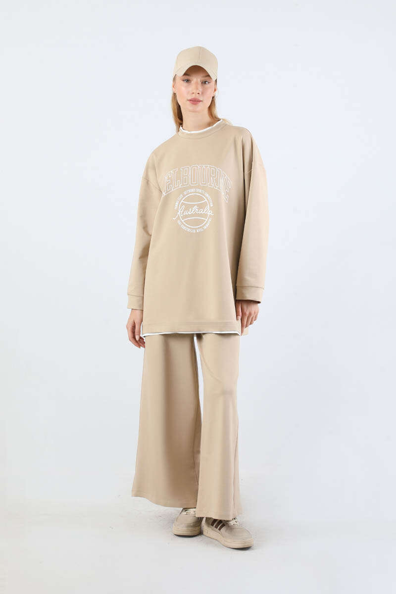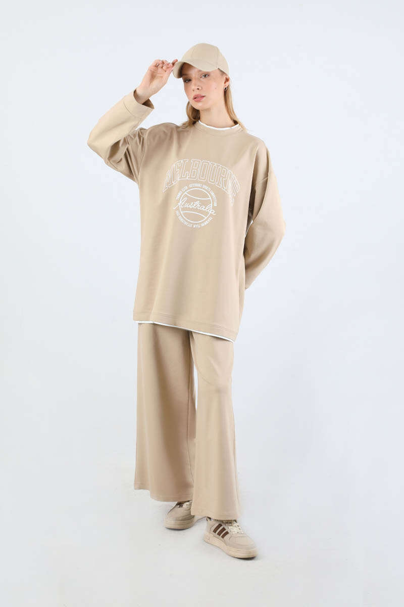 Melbourne Baskılı Spor Takım Bej. Yaka ve etek ucunda garni detaylıdır. Düşük omuzludr. Manşeti bilezik detaylıdır. Pantolon beli lastiklidir. Yan ceplidir. Geniş paçalıdır. Günlük kullanım ve özel günlerinizde tercih edebilirsiniz.