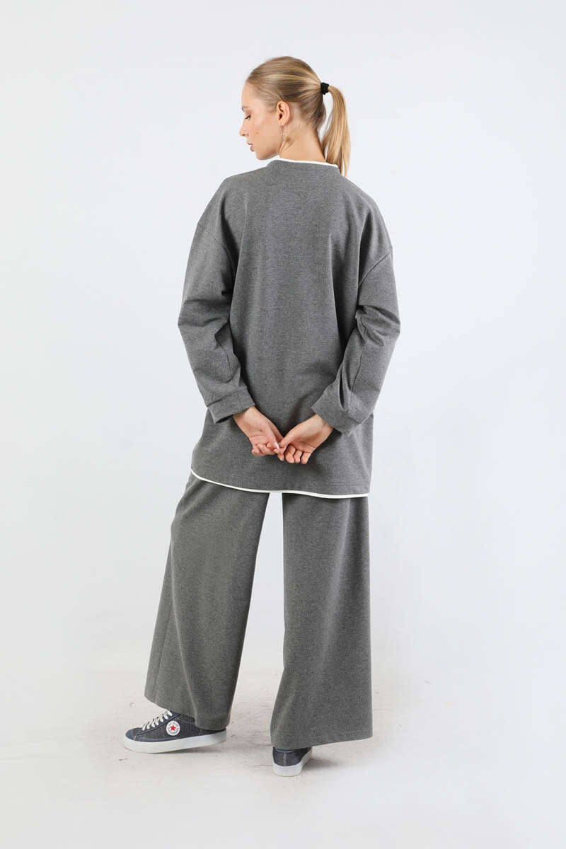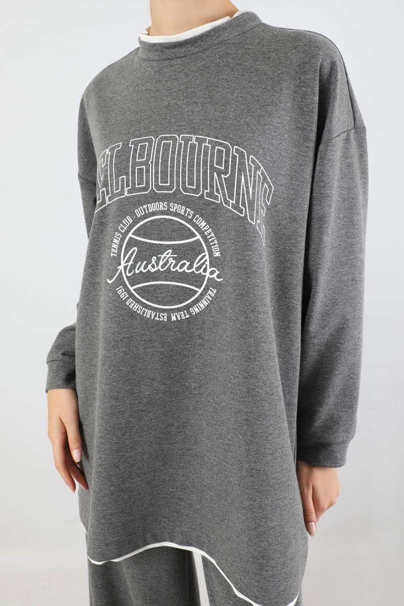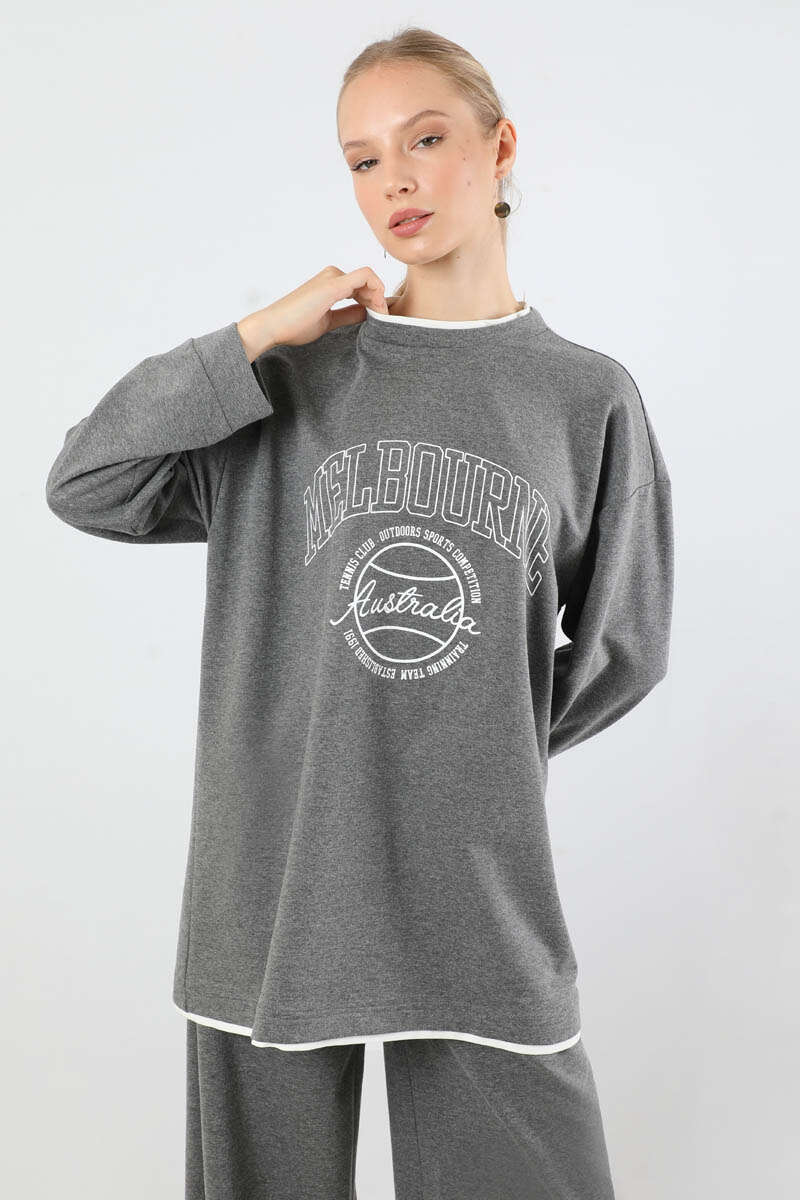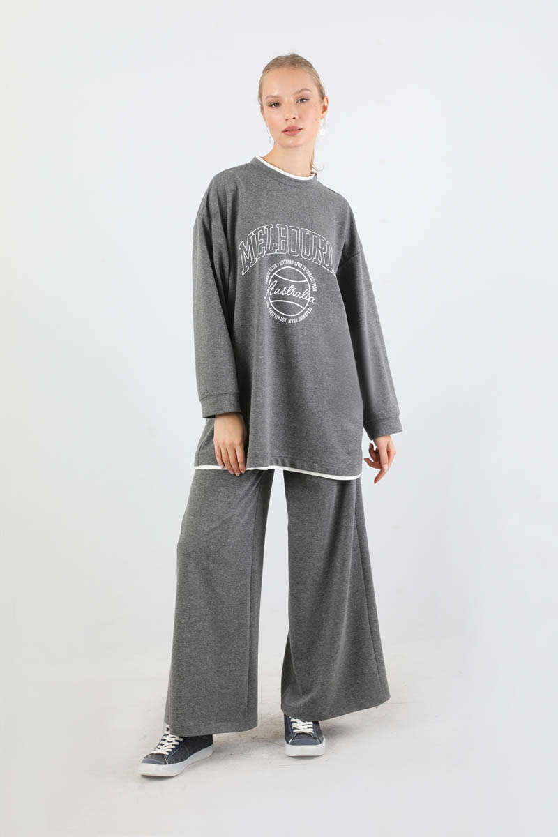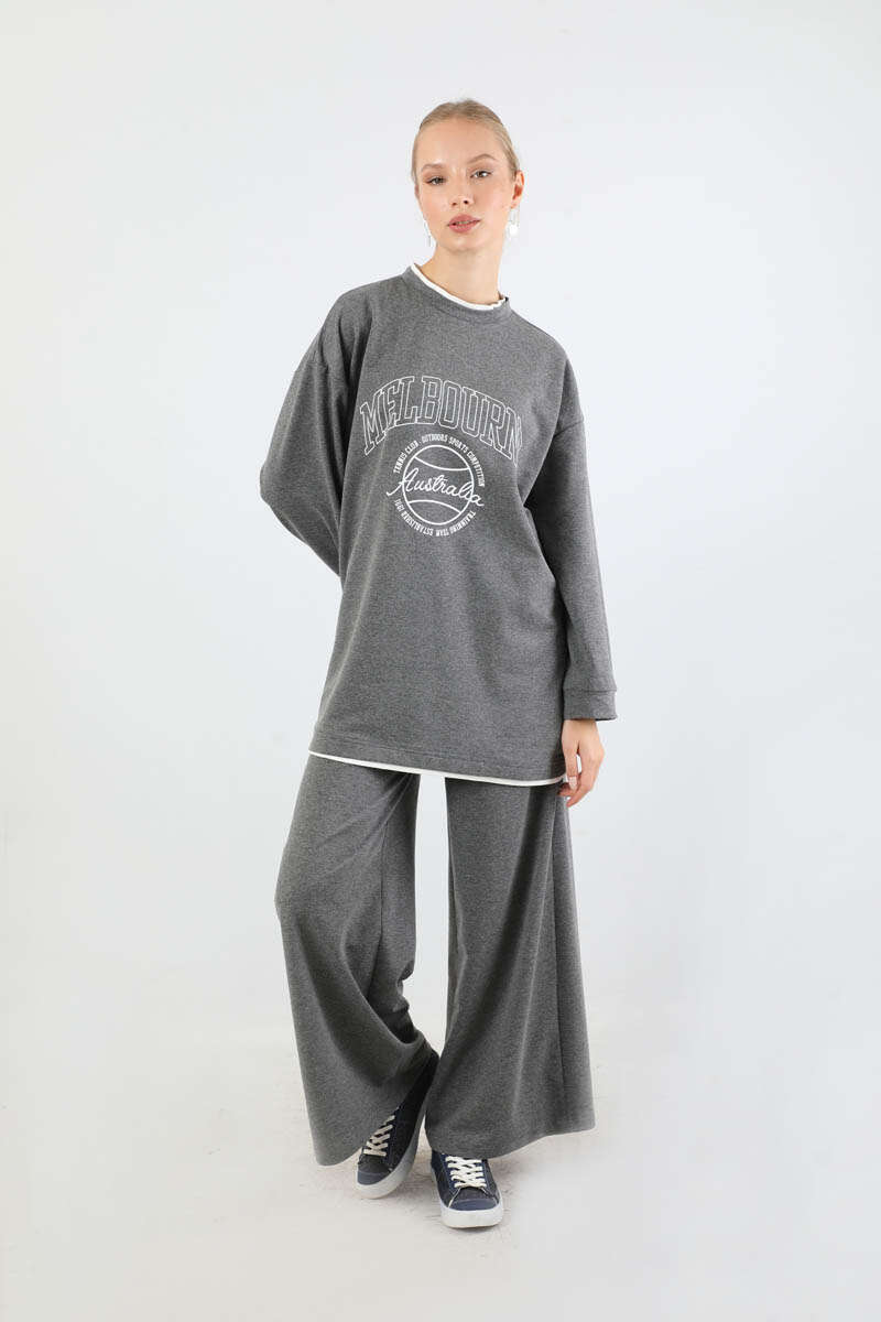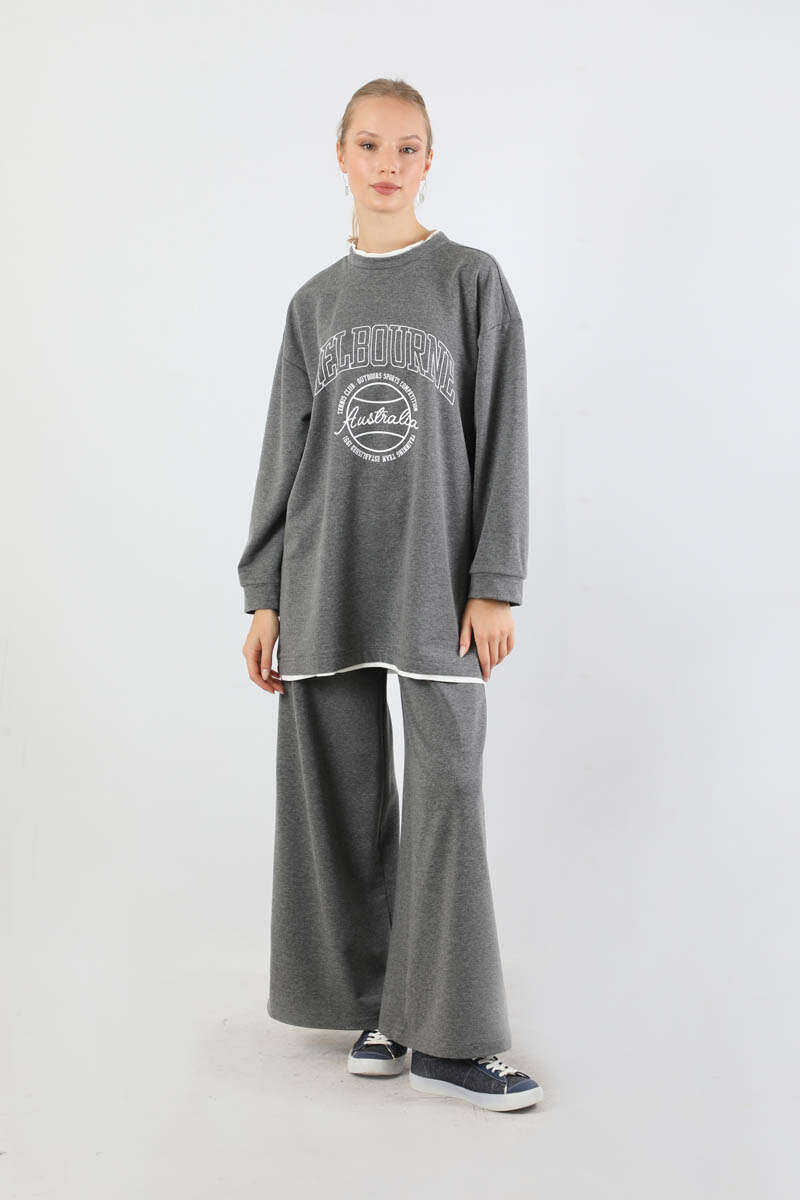 Melbourne Baskılı Spor Takım Gri. Yaka ve etek ucunda garni detaylıdır. Düşük omuzludr. Manşeti bilezik detaylıdır. Pantolon beli lastiklidir. Yan ceplidir. Geniş paçalıdır. Günlük kullanım ve özel günlerinizde tercih edebilirsiniz.