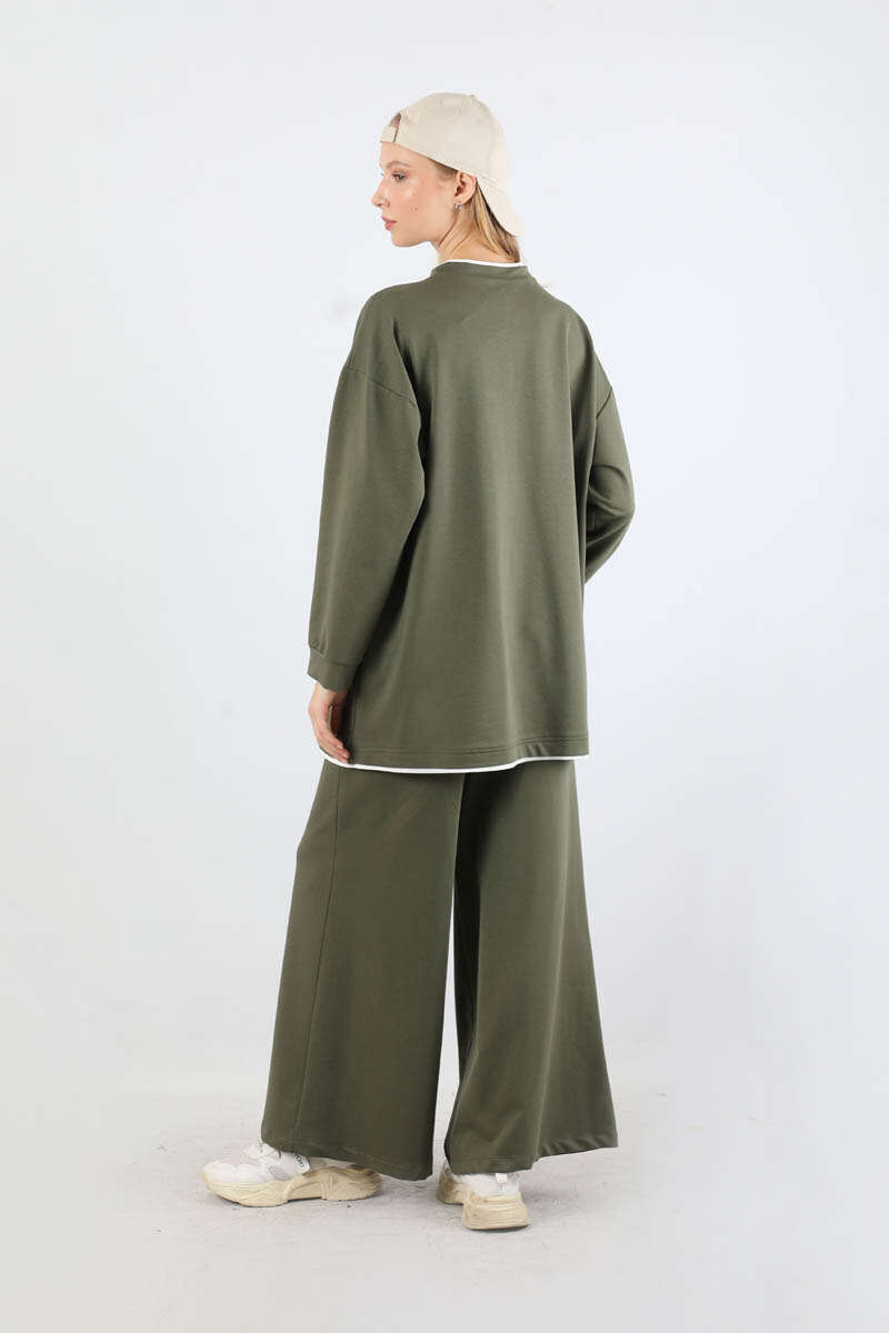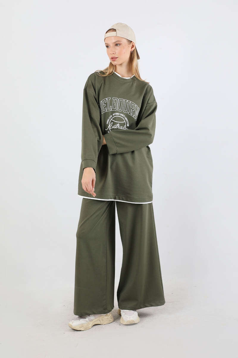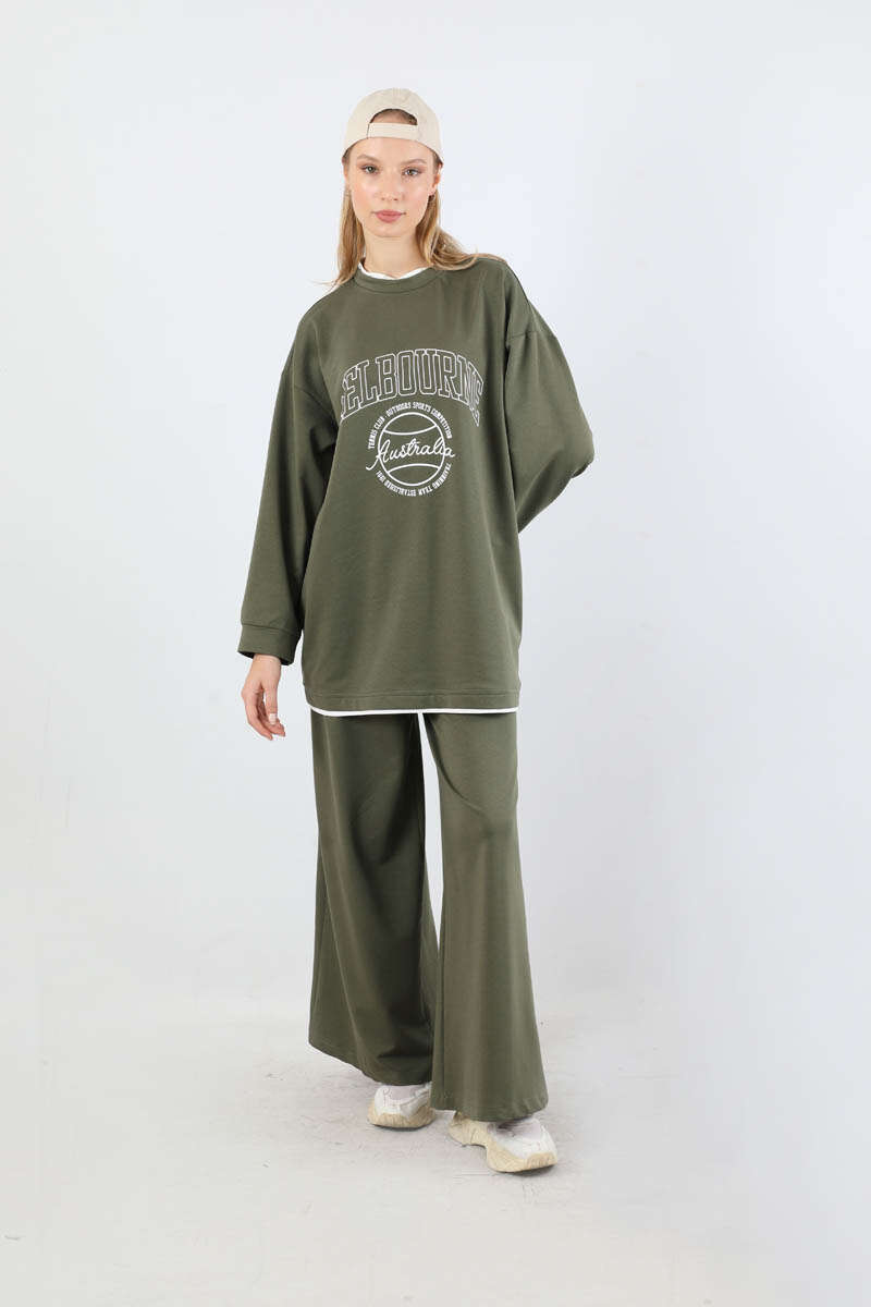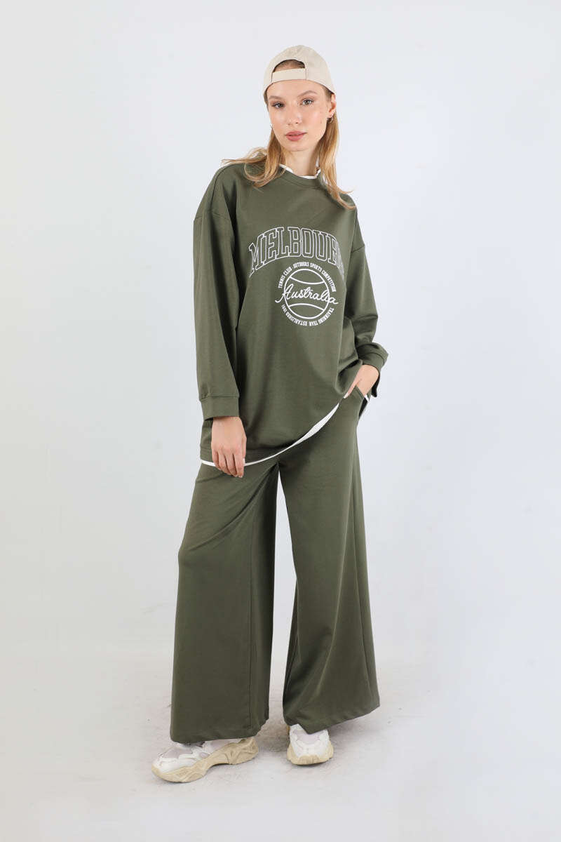 Melbourne Baskılı Spor Takım Haki. Yaka ve etek ucunda garni detaylıdır. Düşük omuzludr. Manşeti bilezik detaylıdır. Pantolon beli lastiklidir. Yan ceplidir. Geniş paçalıdır. Günlük kullanım ve özel günlerinizde tercih edebilirsiniz.