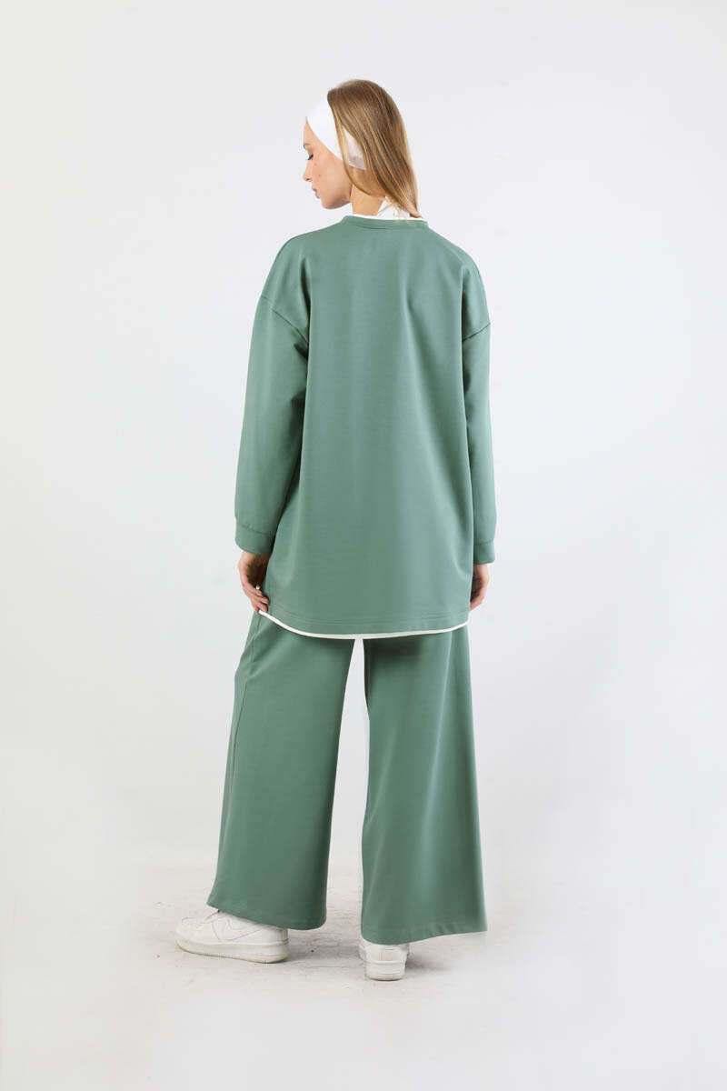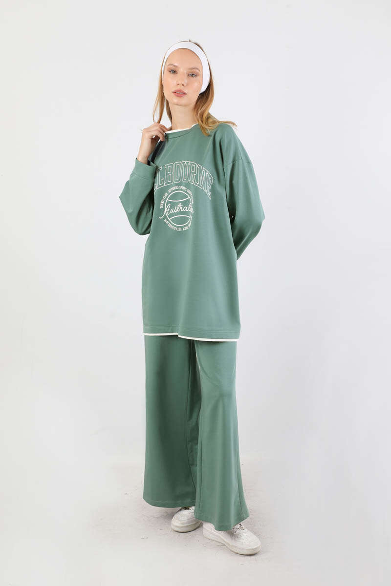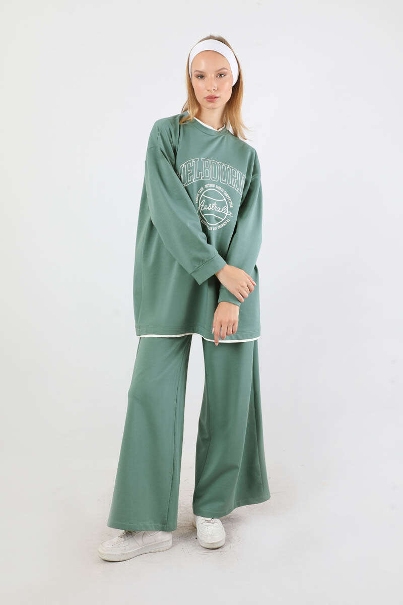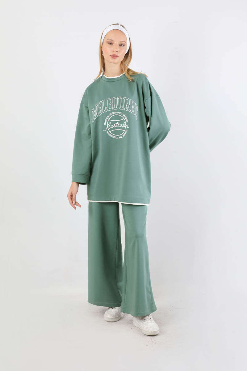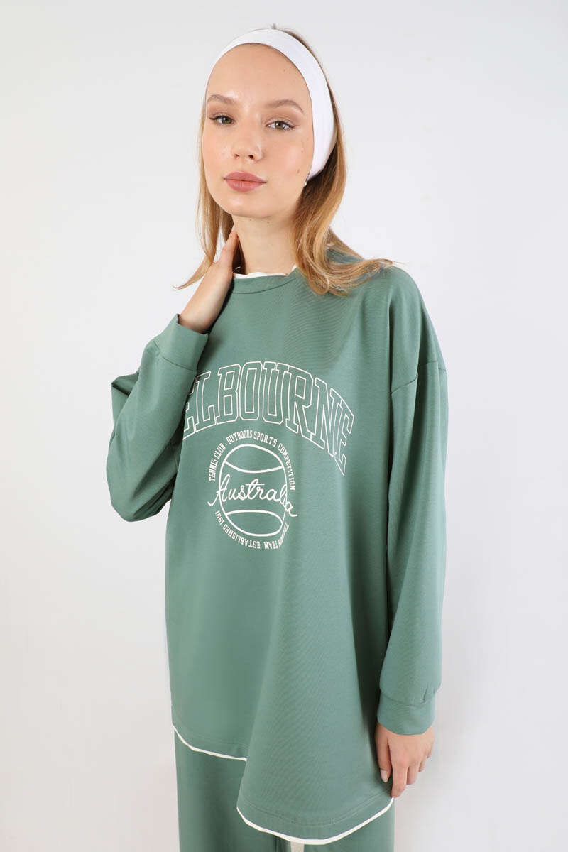 Melbourne Baskılı Spor Takım Mint. Yaka ve etek ucunda garni detaylıdır. Düşük omuzludr. Manşeti bilezik detaylıdır. Pantolon beli lastiklidir. Yan ceplidir. Geniş paçalıdır. Günlük kullanım ve özel günlerinizde tercih edebilirsiniz.