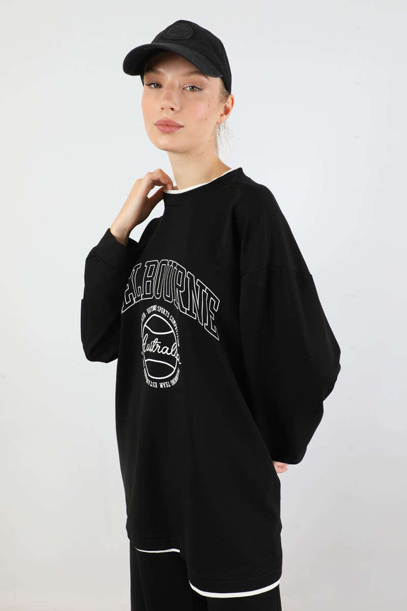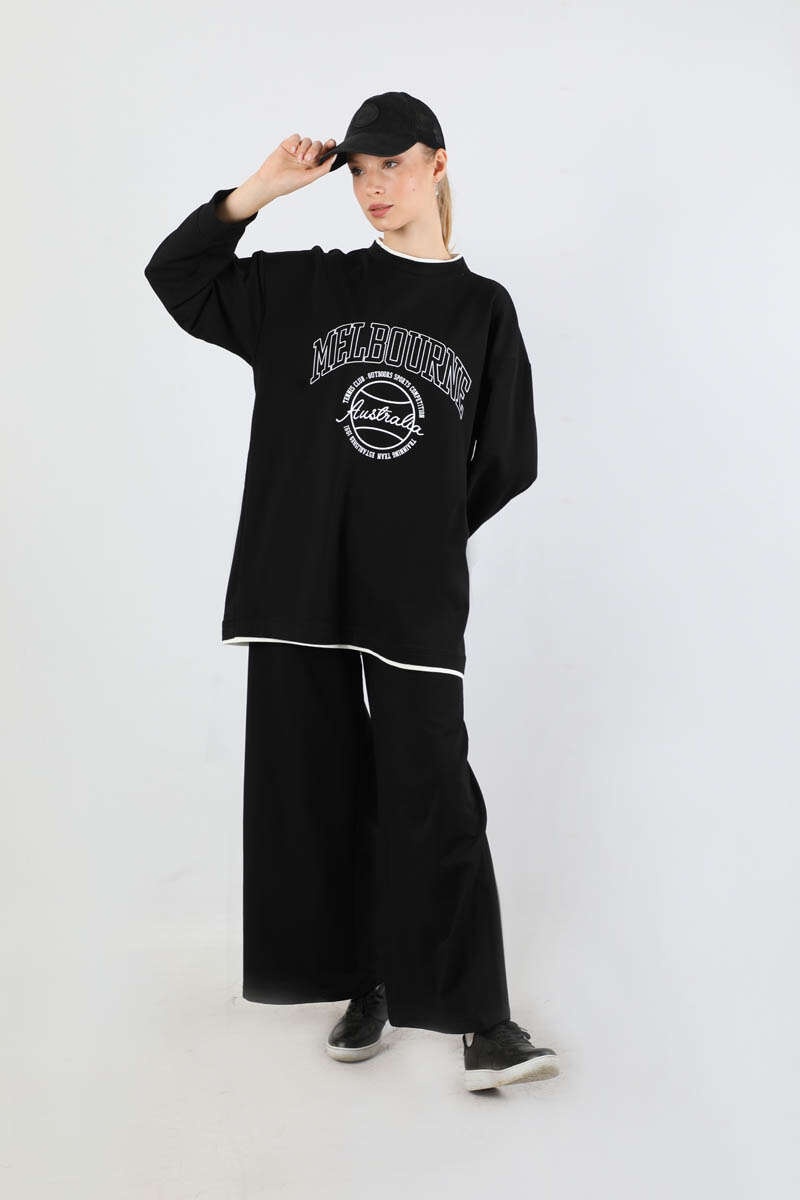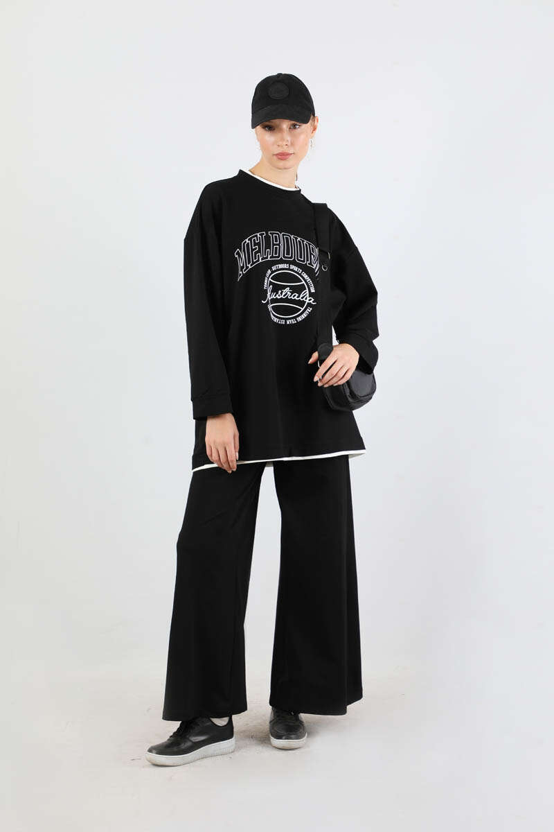 Melbourne Baskılı Spor Takım Siyah. Yaka ve etek ucunda garni detaylıdır. Düşük omuzludr. Manşeti bilezik detaylıdır. Pantolon beli lastiklidir. Yan ceplidir. Geniş paçalıdır. Günlük kullanım ve özel günlerinizde tercih edebilirsiniz.