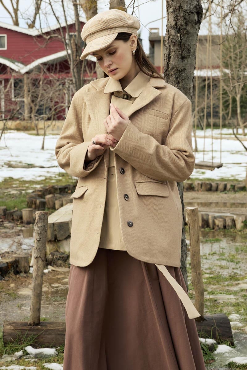 Melton Blazer Jacket Beige offers a strong and balanced silhouette by adapting the timeless blazer form to the winter season. Thanks to its firm-textured melton fabric, it maintains its shape while its clean cut allows it to pair effortlessly with both classic and modern looks. The classic lapel and flap pockets add a refined touch to office style, while also making it suitable for everyday city combinations. Easily styled with skirts, trousers, or dresses, this piece becomes one of the essential jackets of the season.