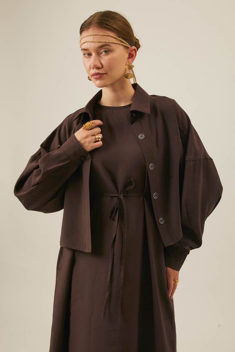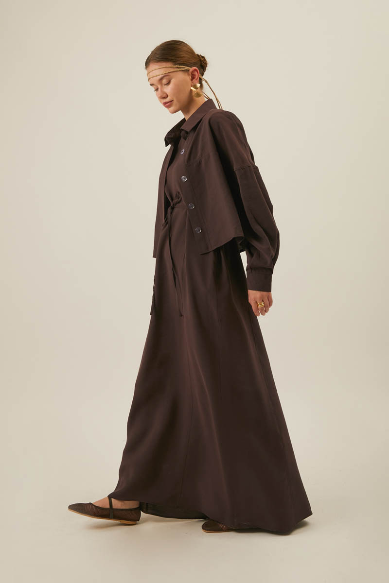 Designed as an integrated look with a short shirt on top, this pinafore dress offers the appearance of a two-piece set. Its relaxed fit and drapey structure ensure comfortable wear. With wide cuffed sleeves, it adds a modern touch to a classic style, while its simple design allows for versatile styling.