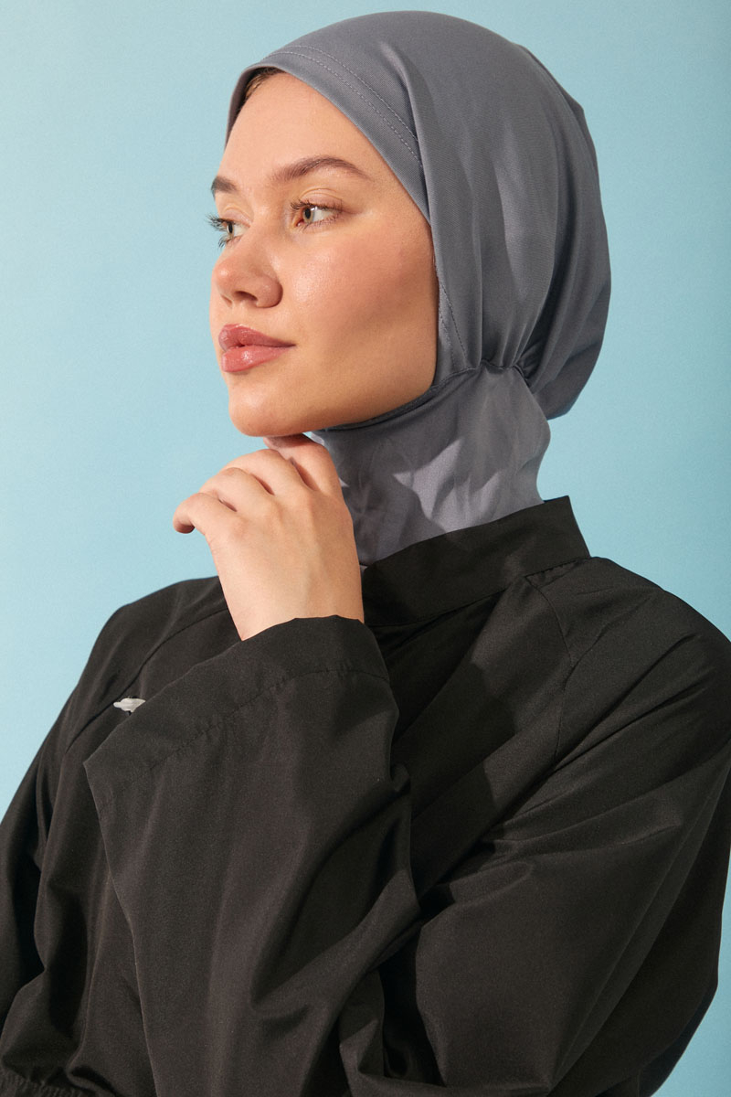 Modest Swim Cap in Gray features water-repellent properties, stays securely in place while swimming, has a flexible fabric, and is suitable for use in both sea and pool.