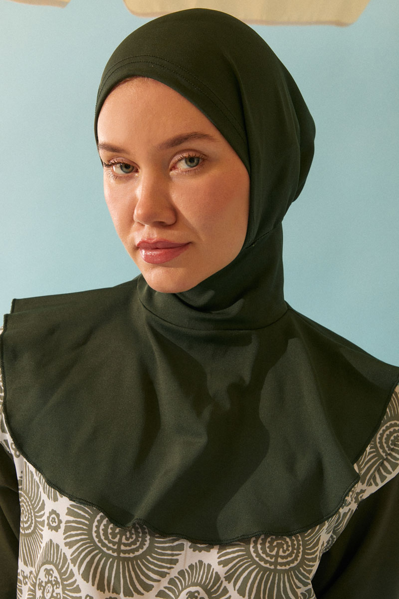 Modest Swim Cap in Khaki, features water-repellent properties, stays securely in place while swimming, has a flexible fabric, and is suitable for use in both sea and pool.