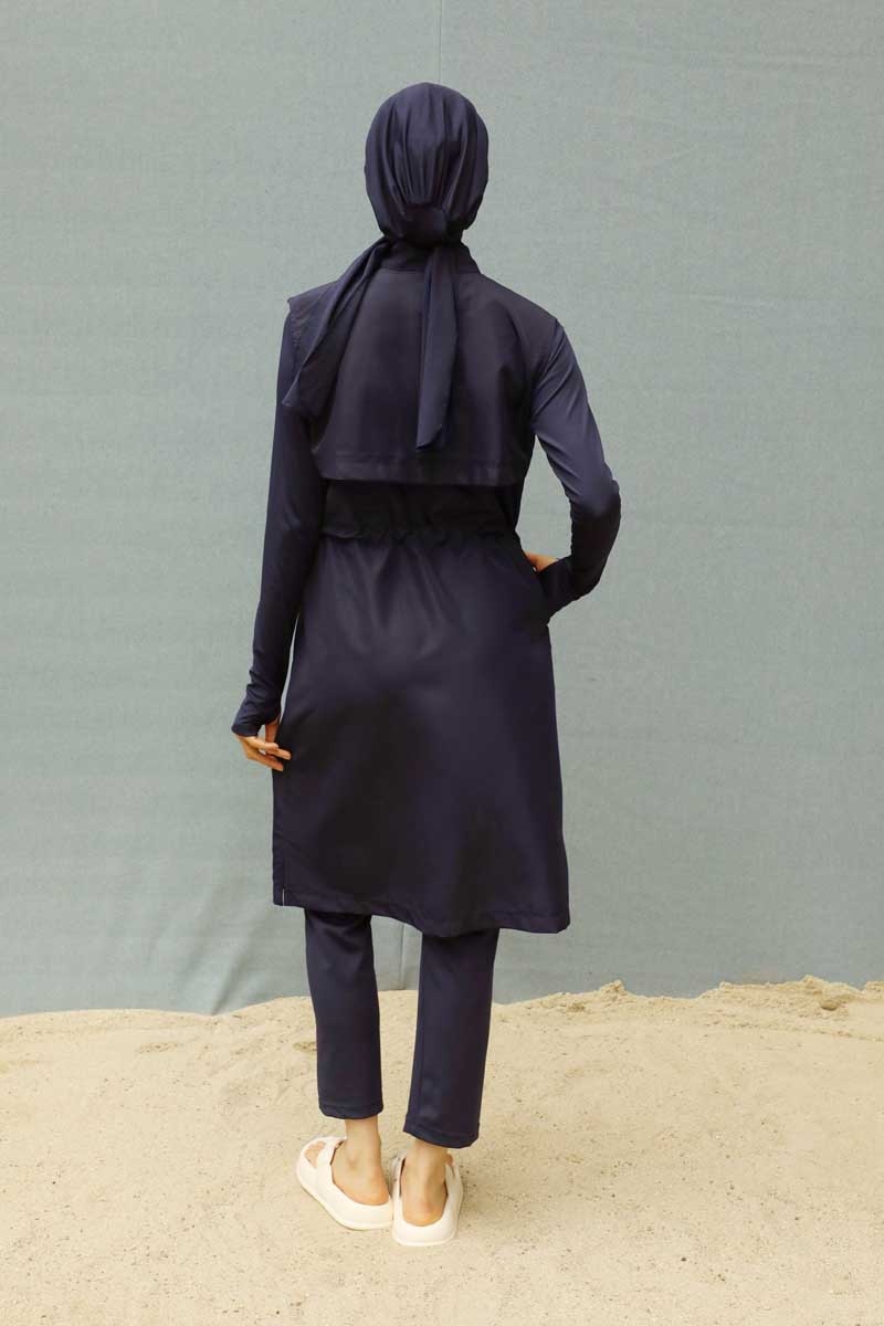 This full-coverage modest swimsuit features a stand-up (mandarin) collar and an adjustable stopper at the waist. It includes a windbreaker design with short side slits and a hidden front zipper. There is a discreet pocket, and the inner body suit includes thumbhole sleeves for added practicality.
