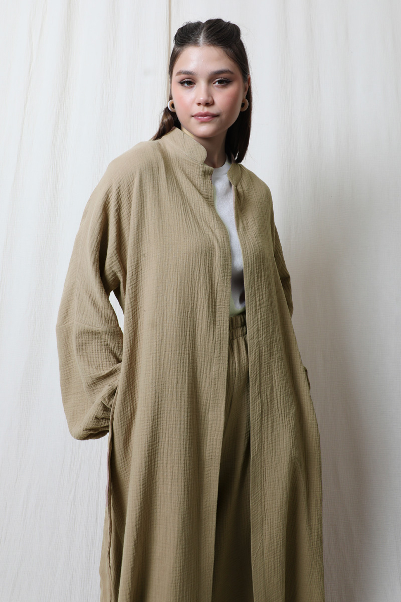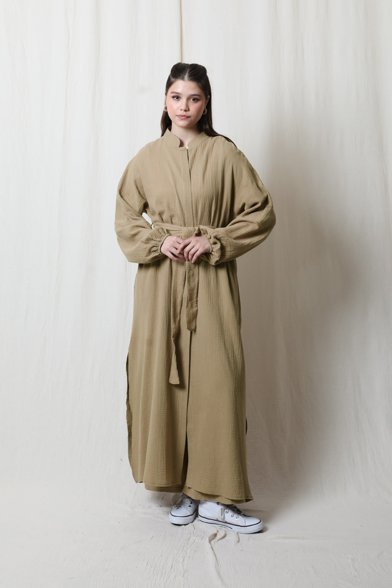 Müslin Abaya Takım Vizon. Hakim yakalıdır. Yarım yarasa koldur. Abaya yandan gizli ceplidir. Manşeti lastiklidir. Kuşaklıdır. Yan kısımlarında yırtmaç vardır. Pantolon beli lastiklidir. Yandan cep detayı mevcuttur. Yazlık, günlük kullanıma uygundur.