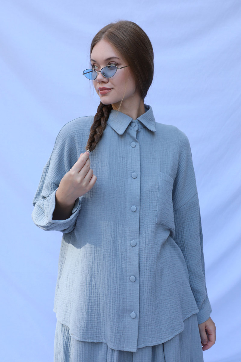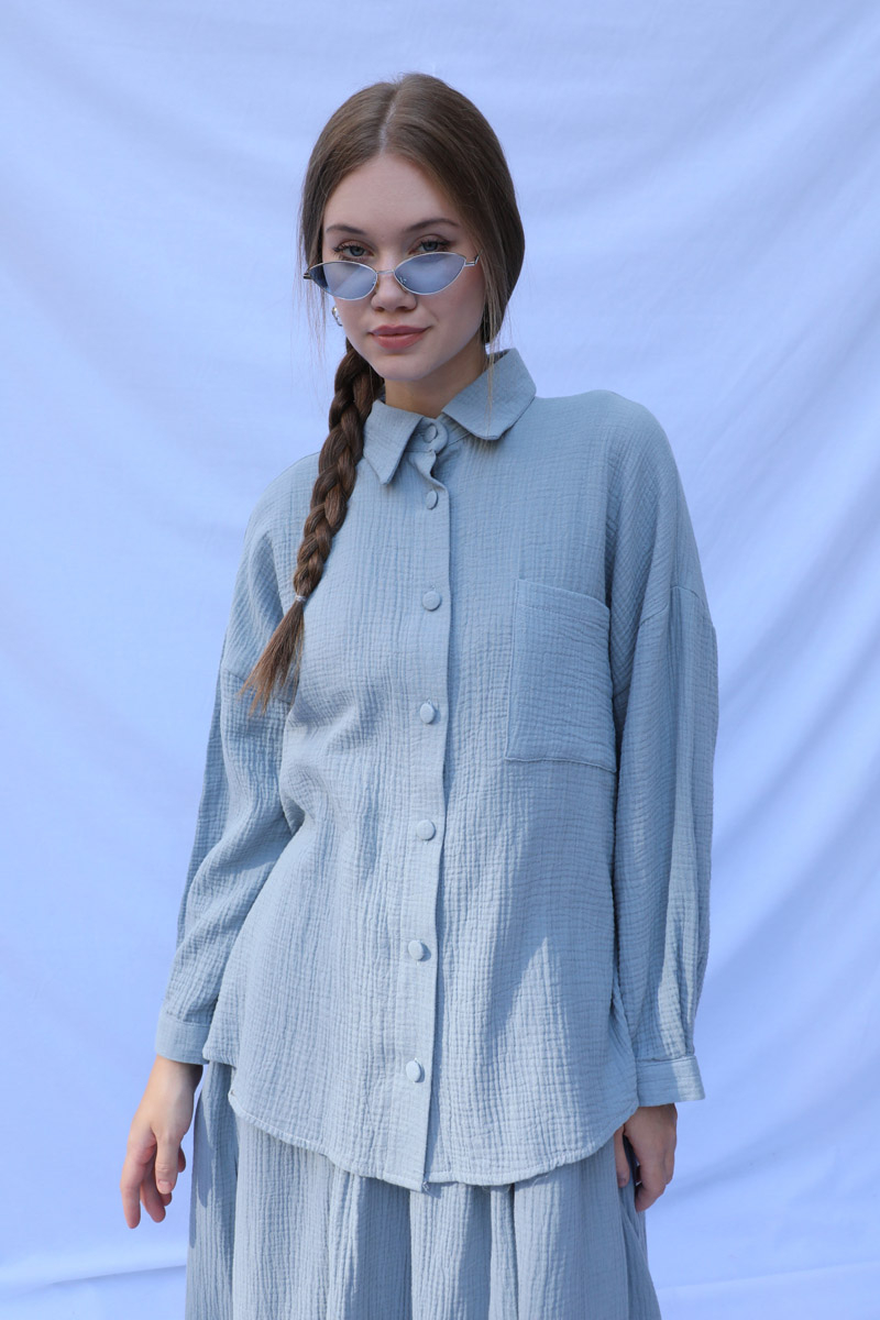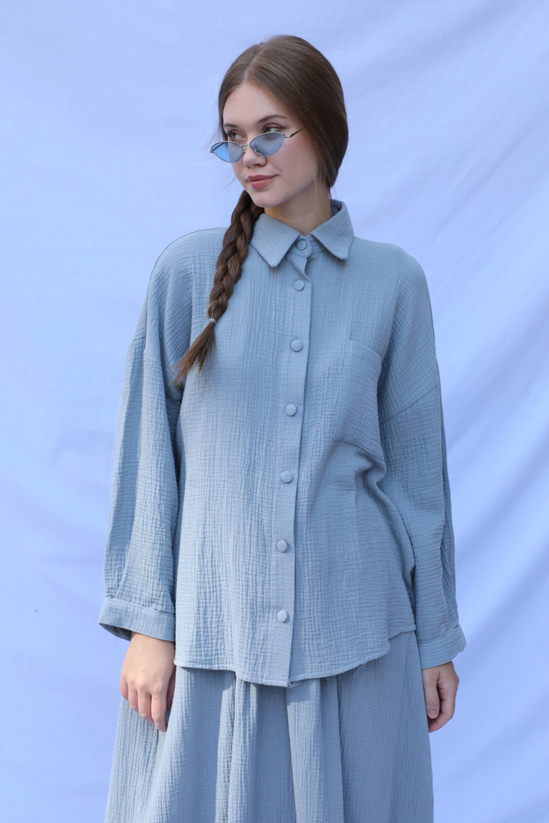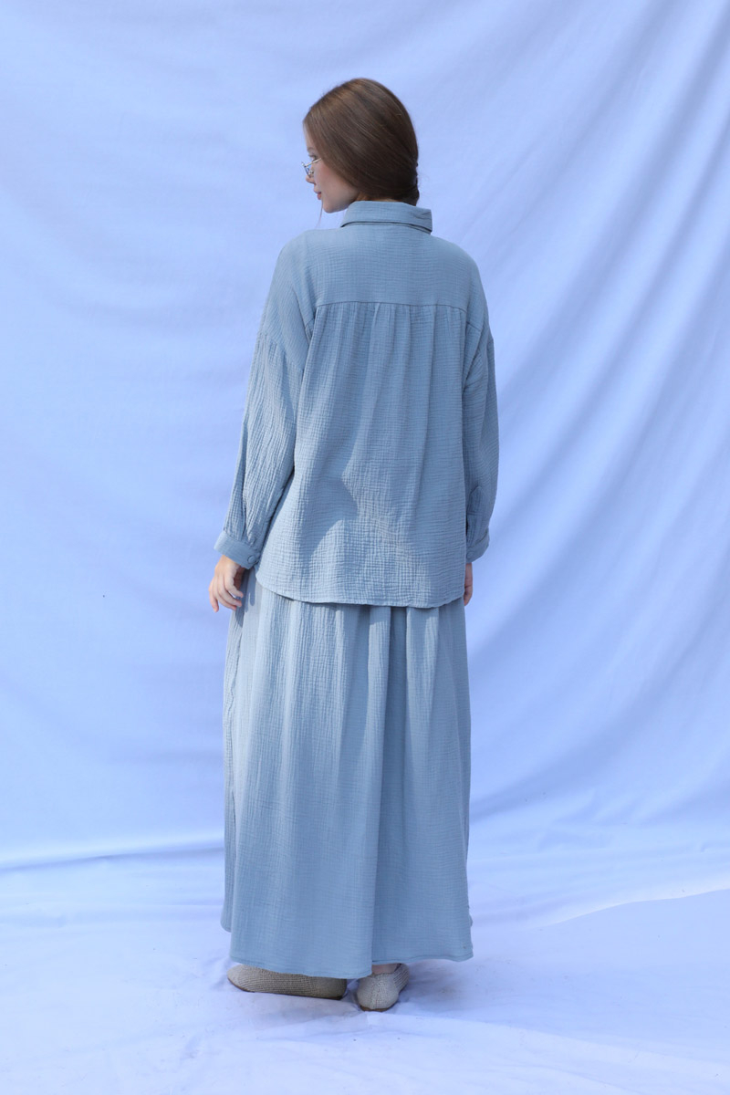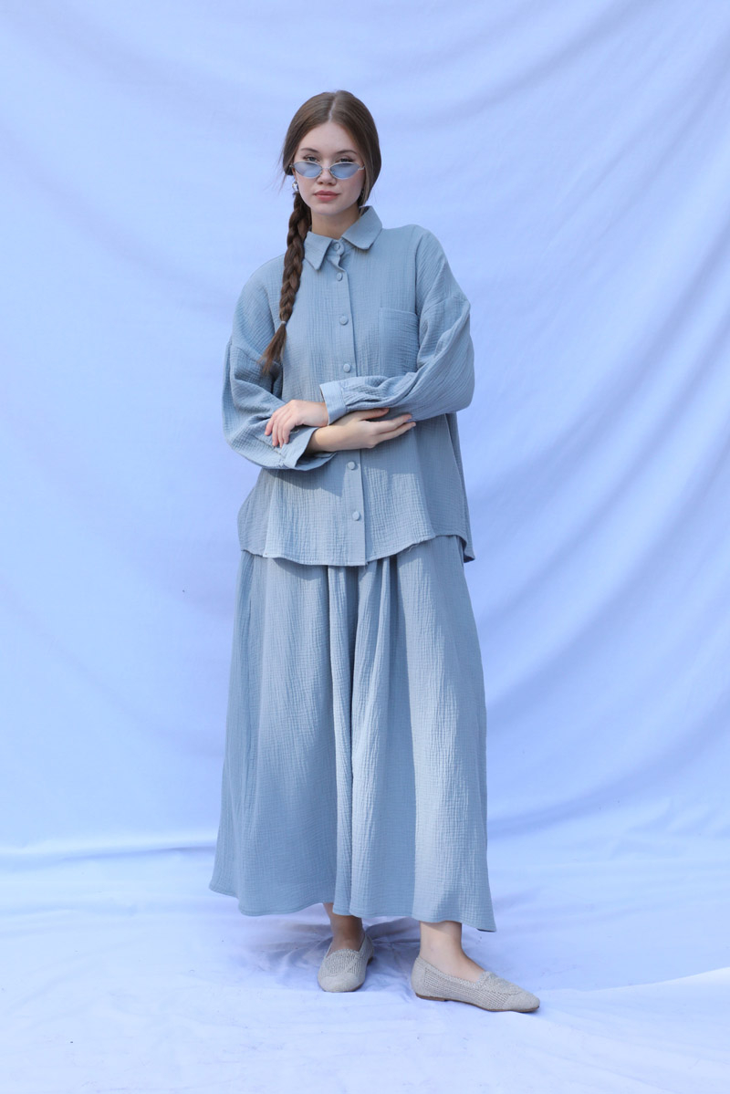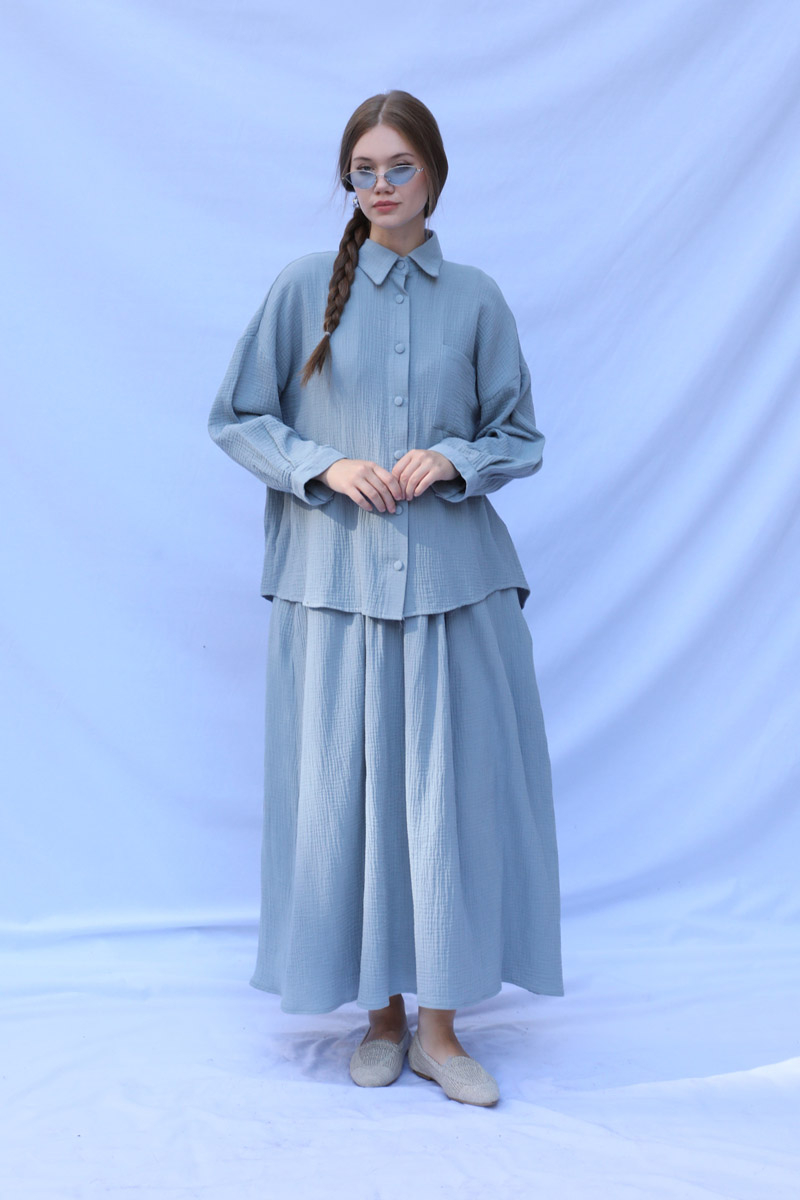 Müslin Etek Takım . Etek beli lastikli, yandan ceplidir. İkili takım olarak satılmaktadır. Günlük kullanıma uygundur.