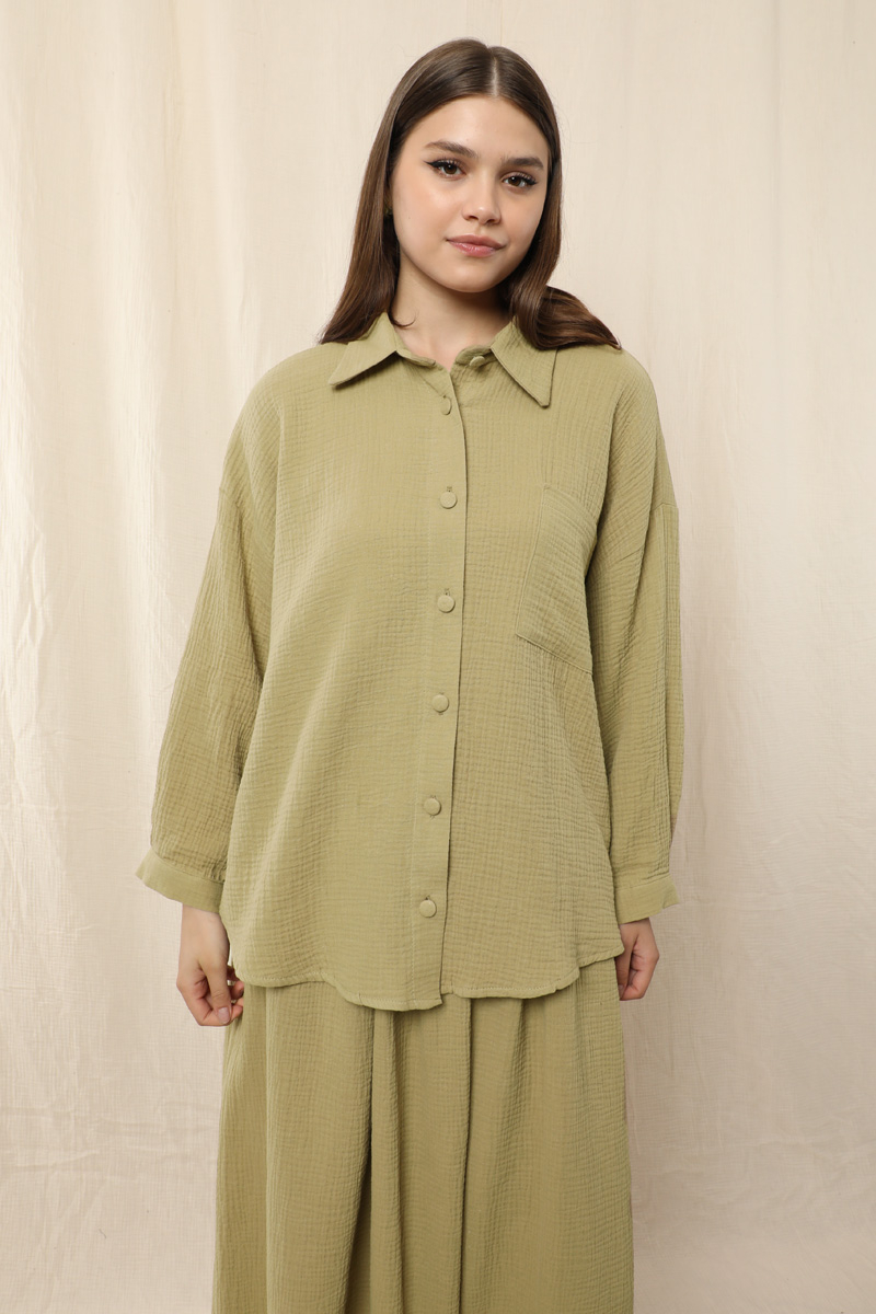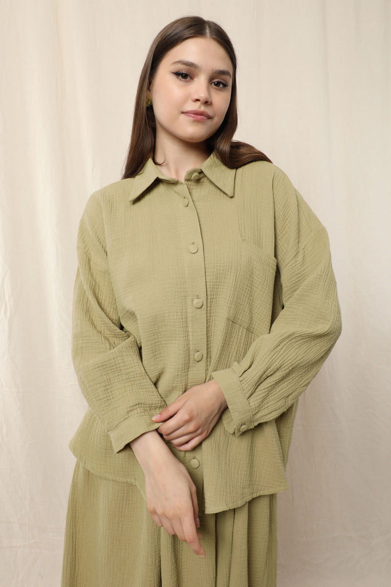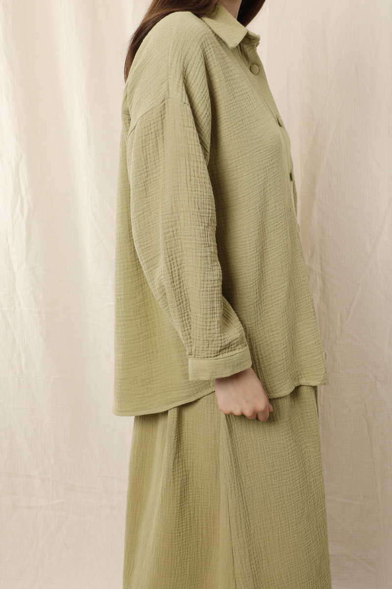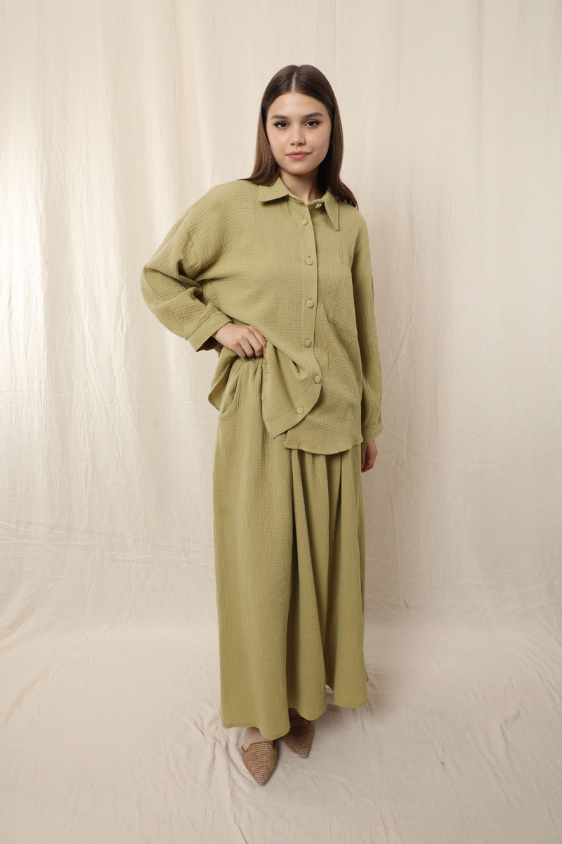 Müslin Etek Takım Haki. Etek beli lastikli, yandan ceplidir. İkili takım olarak satılmaktadır. Günlük kullanıma uygundur.