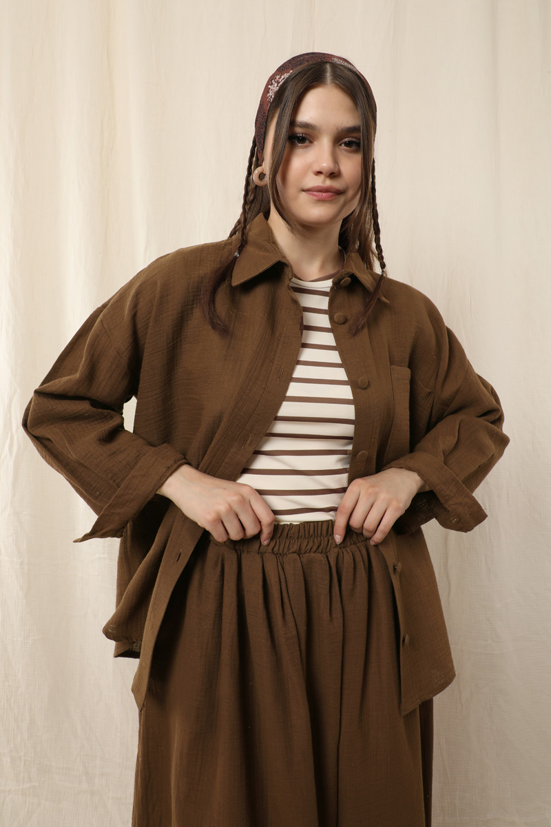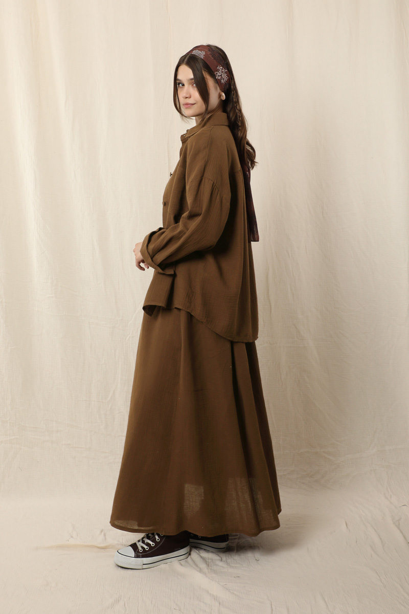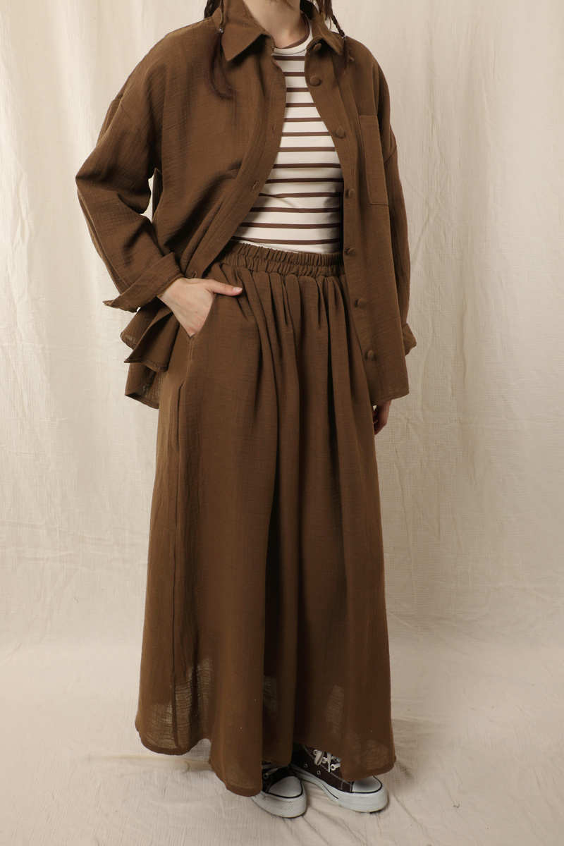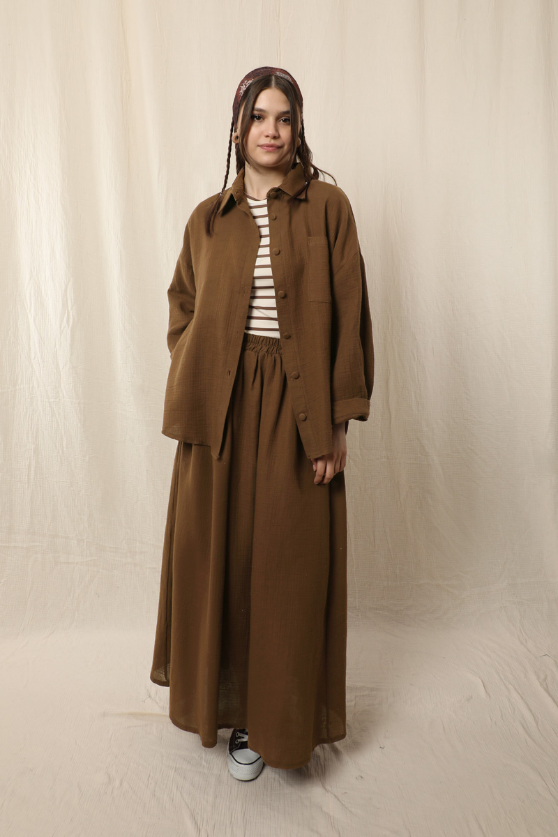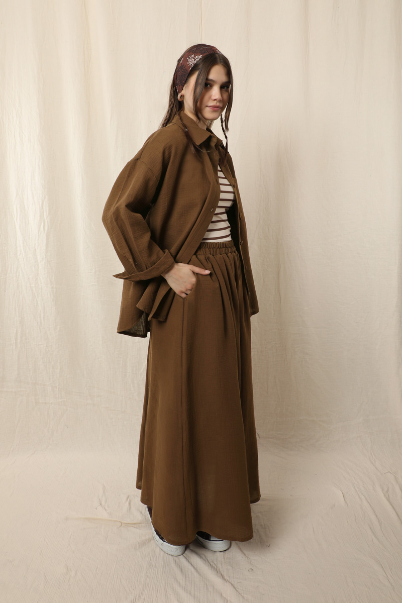 Müslin Etek Takım . Etek beli lastikli, yandan ceplidir. İkili takım olarak satılmaktadır. Günlük kullanıma uygundur.