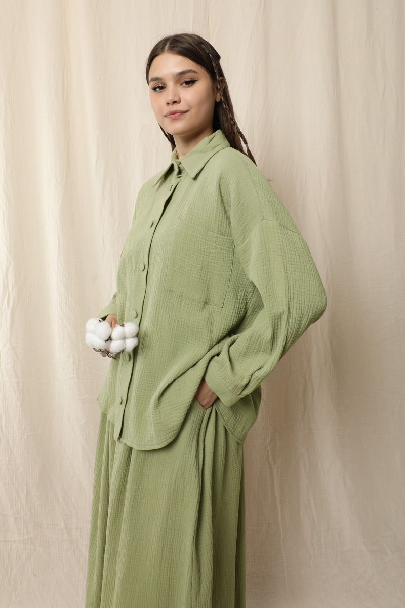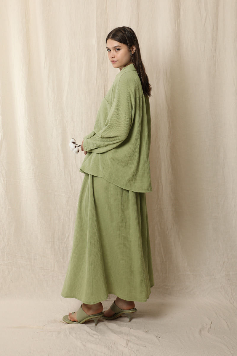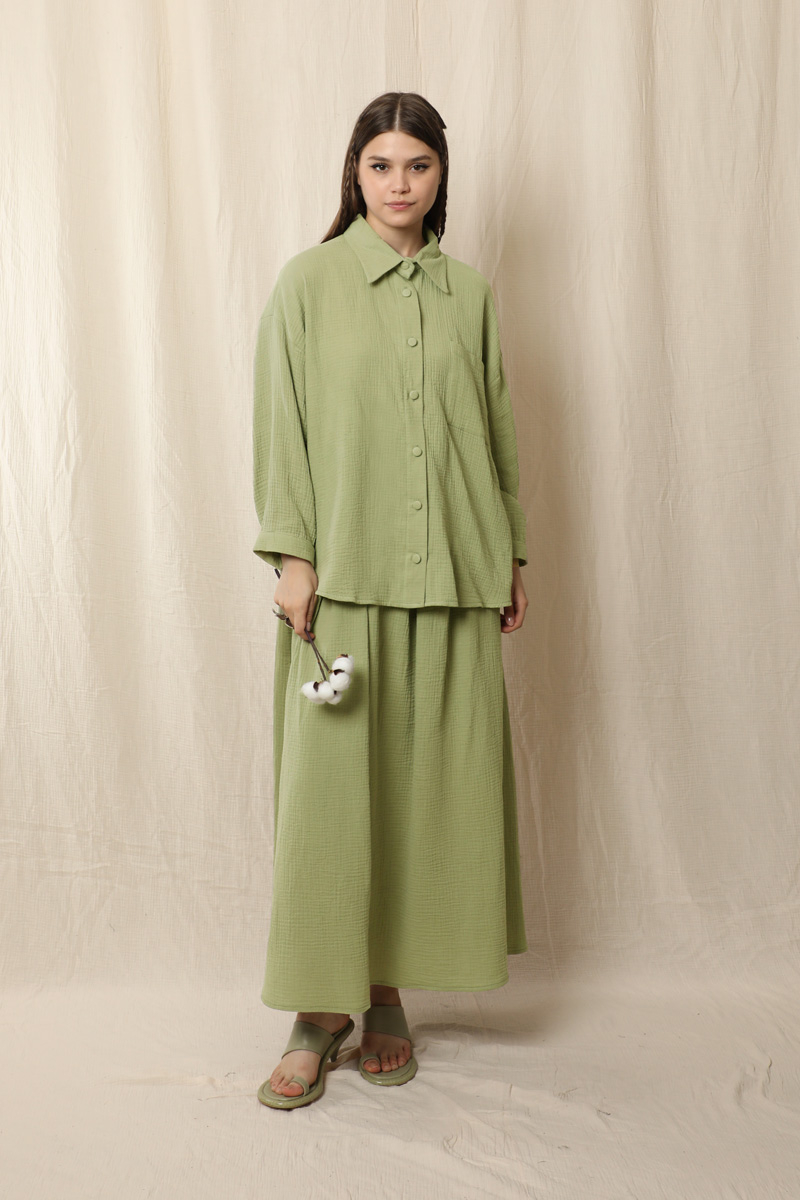 Müslin Etek Takım . Etek beli lastikli, yandan ceplidir. İkili takım olarak satılmaktadır. Günlük kullanıma uygundur.